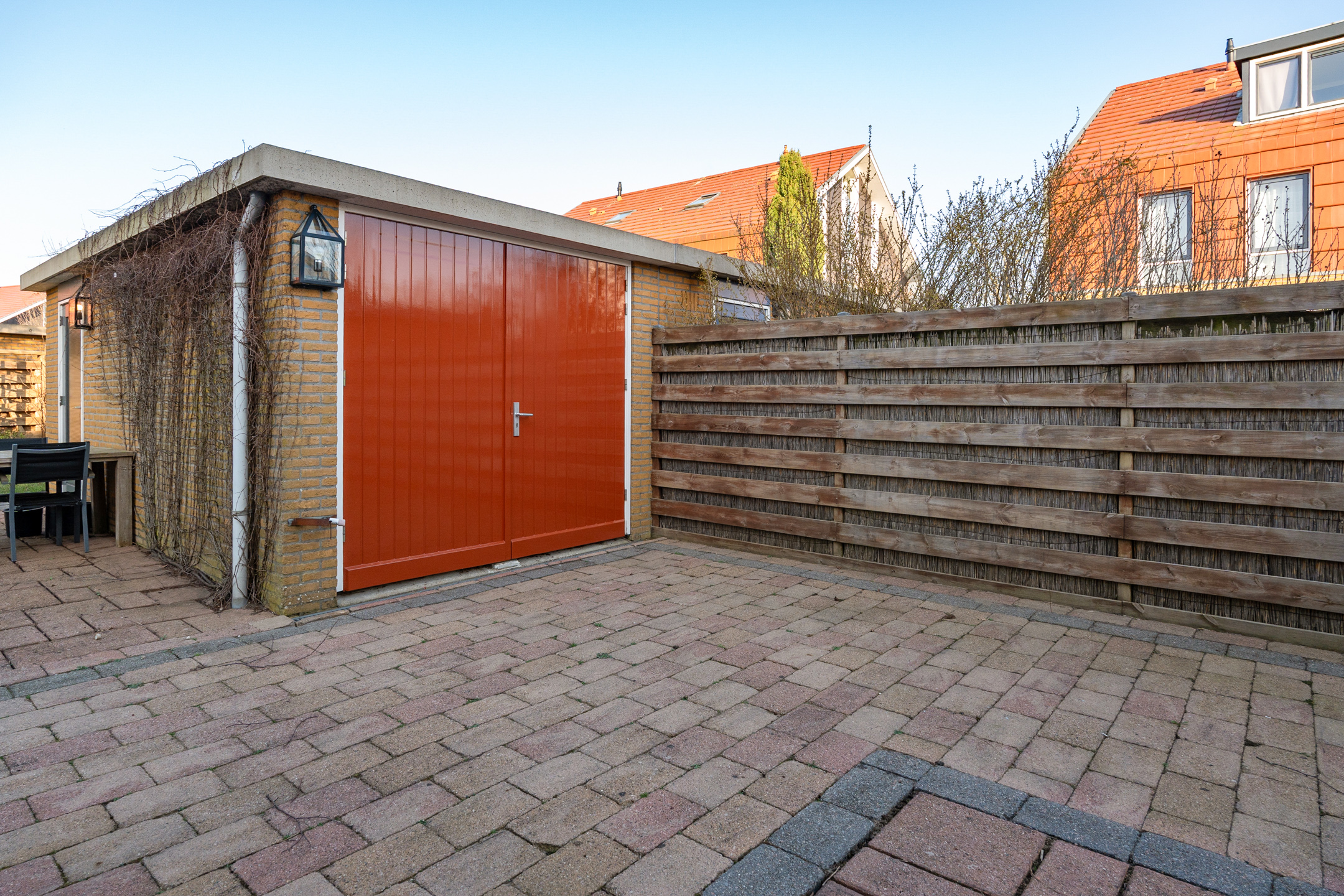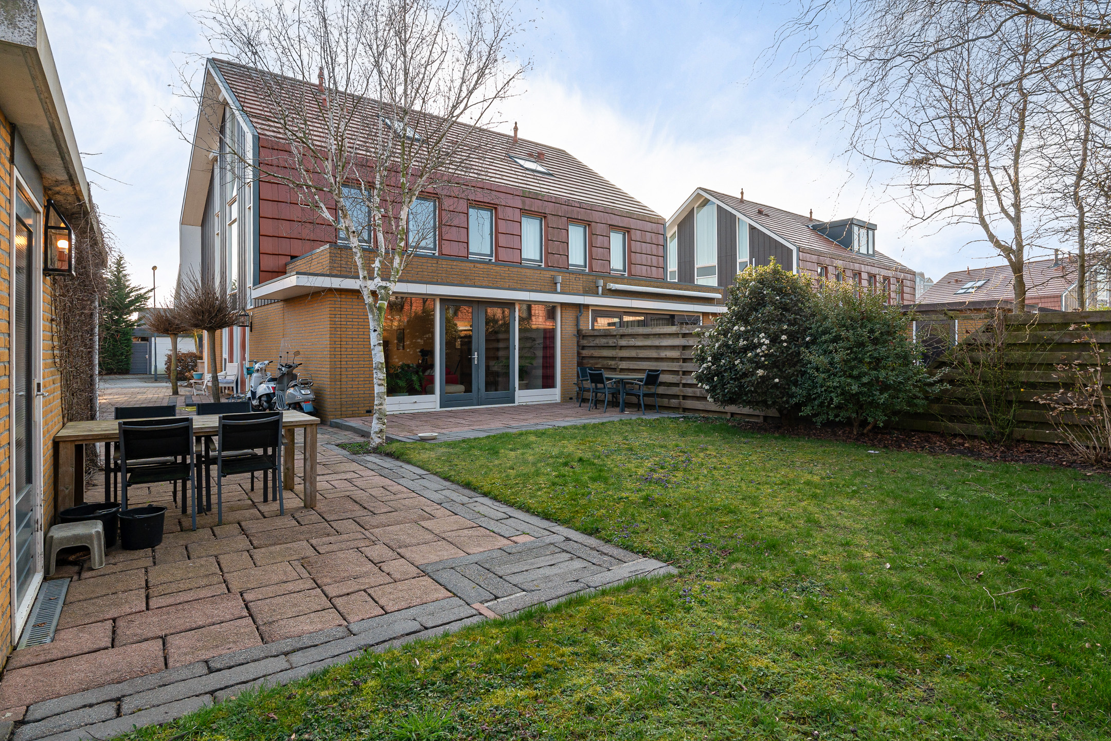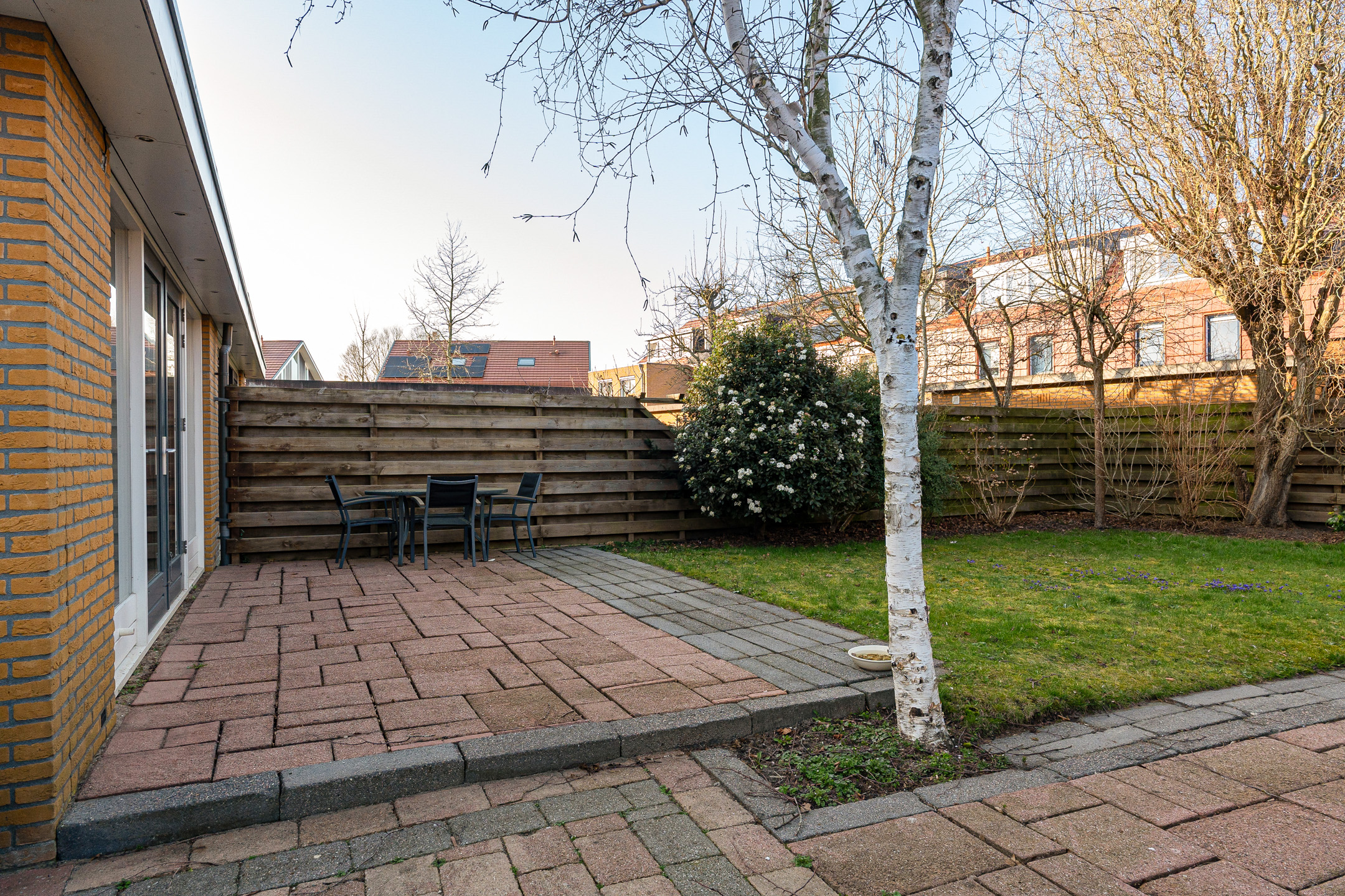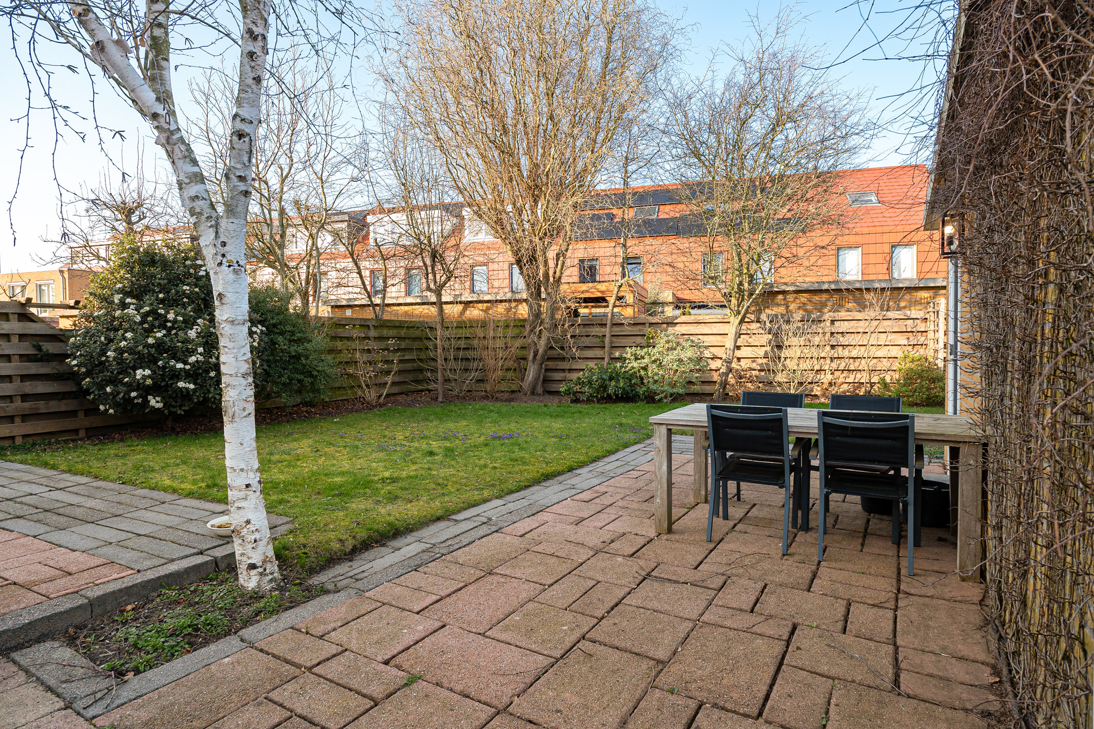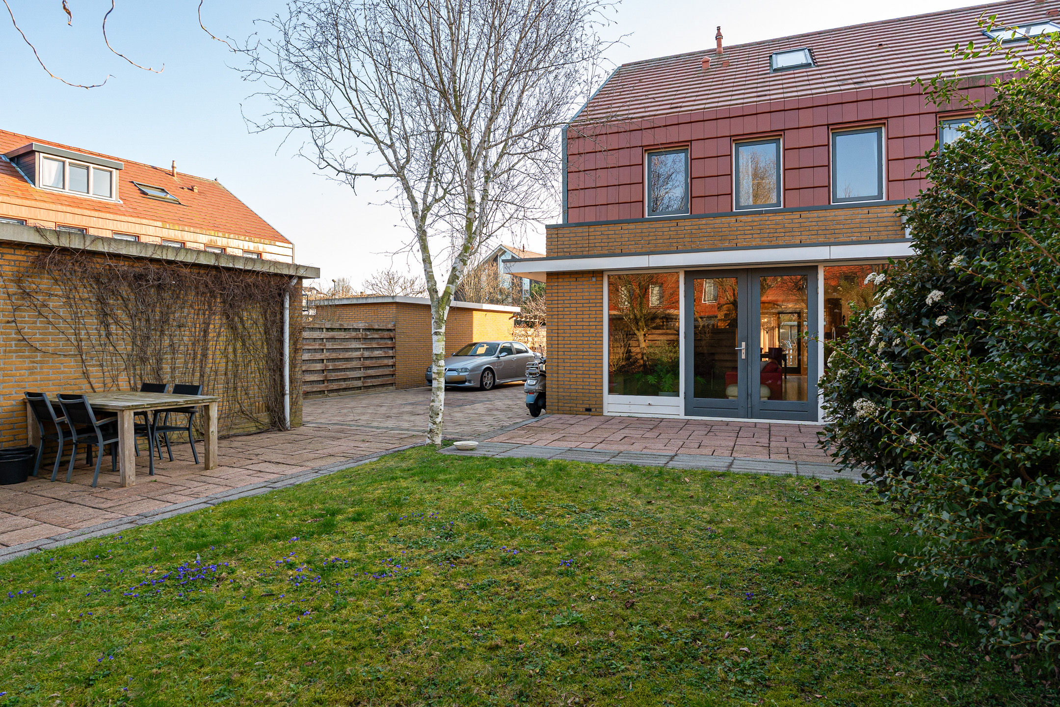 De openslaande deuren geven direct toegang tot de grote en goed onderhouden achtertuin. Deze zonnige tuin is deels betegeld en deels voorzien van groen, waardoor er voldoende ruimte is voor een loungehoek, eettafel of speelruimte voor kinderen. In de tuin bevindt zich tevens de garage.