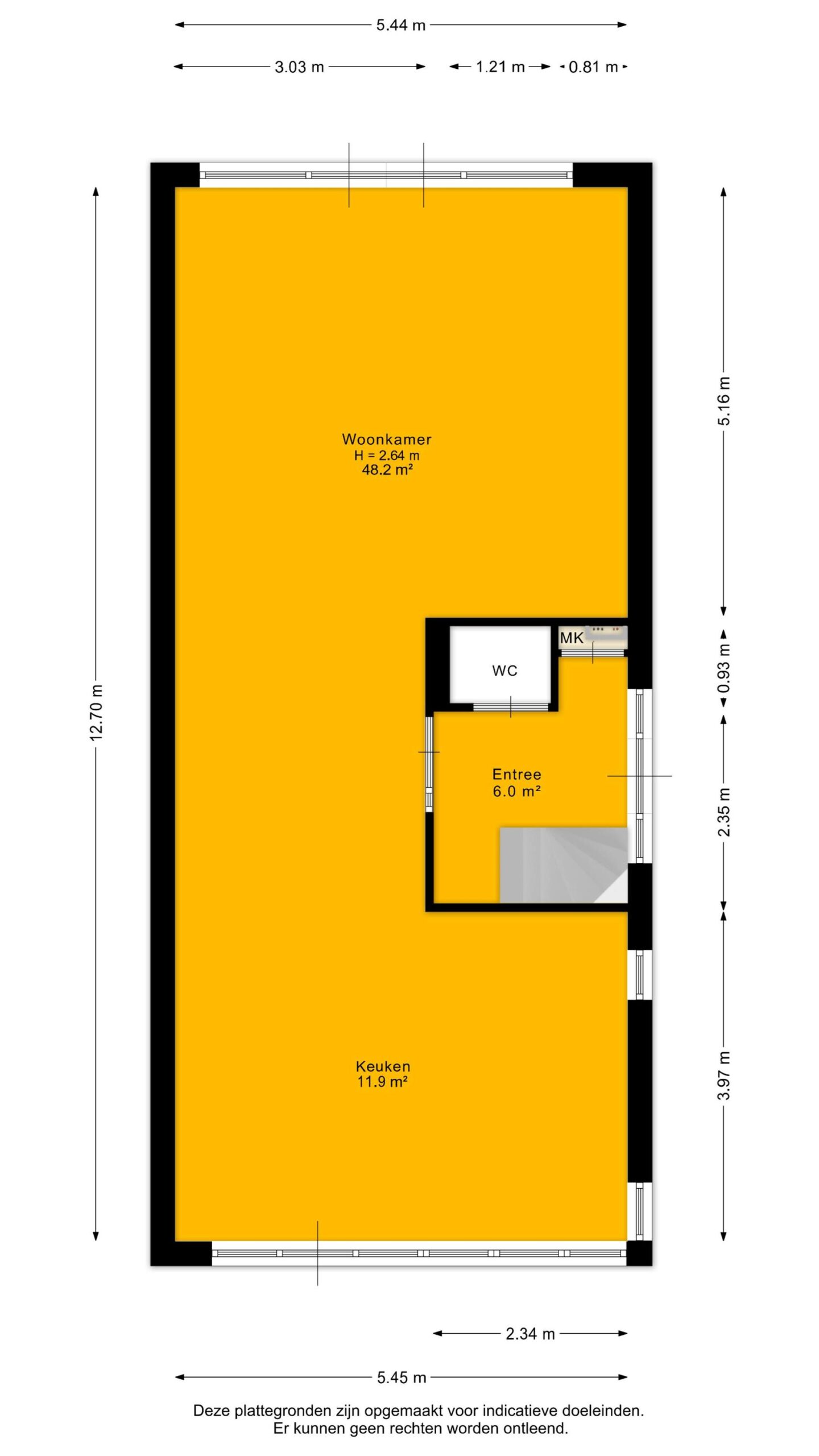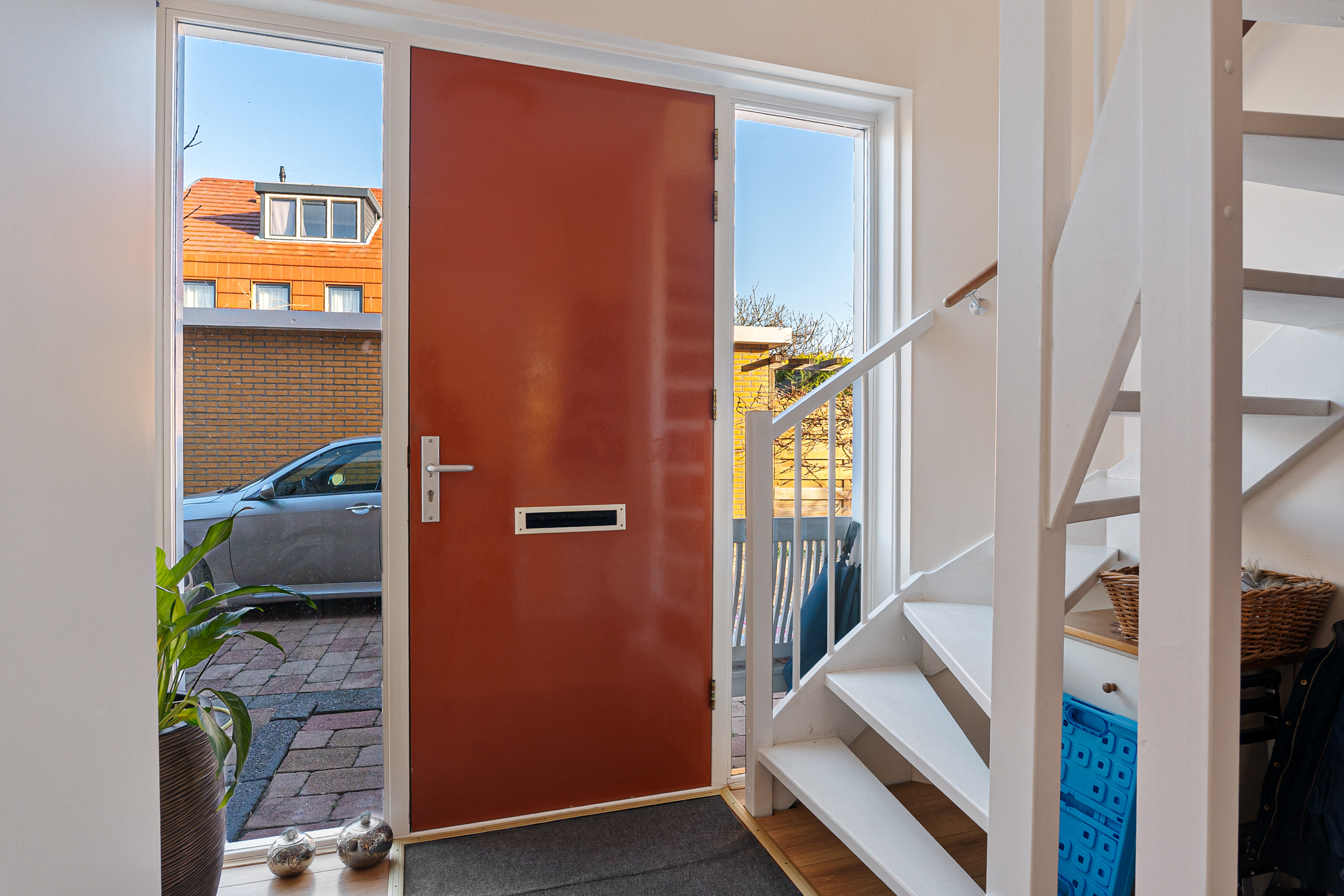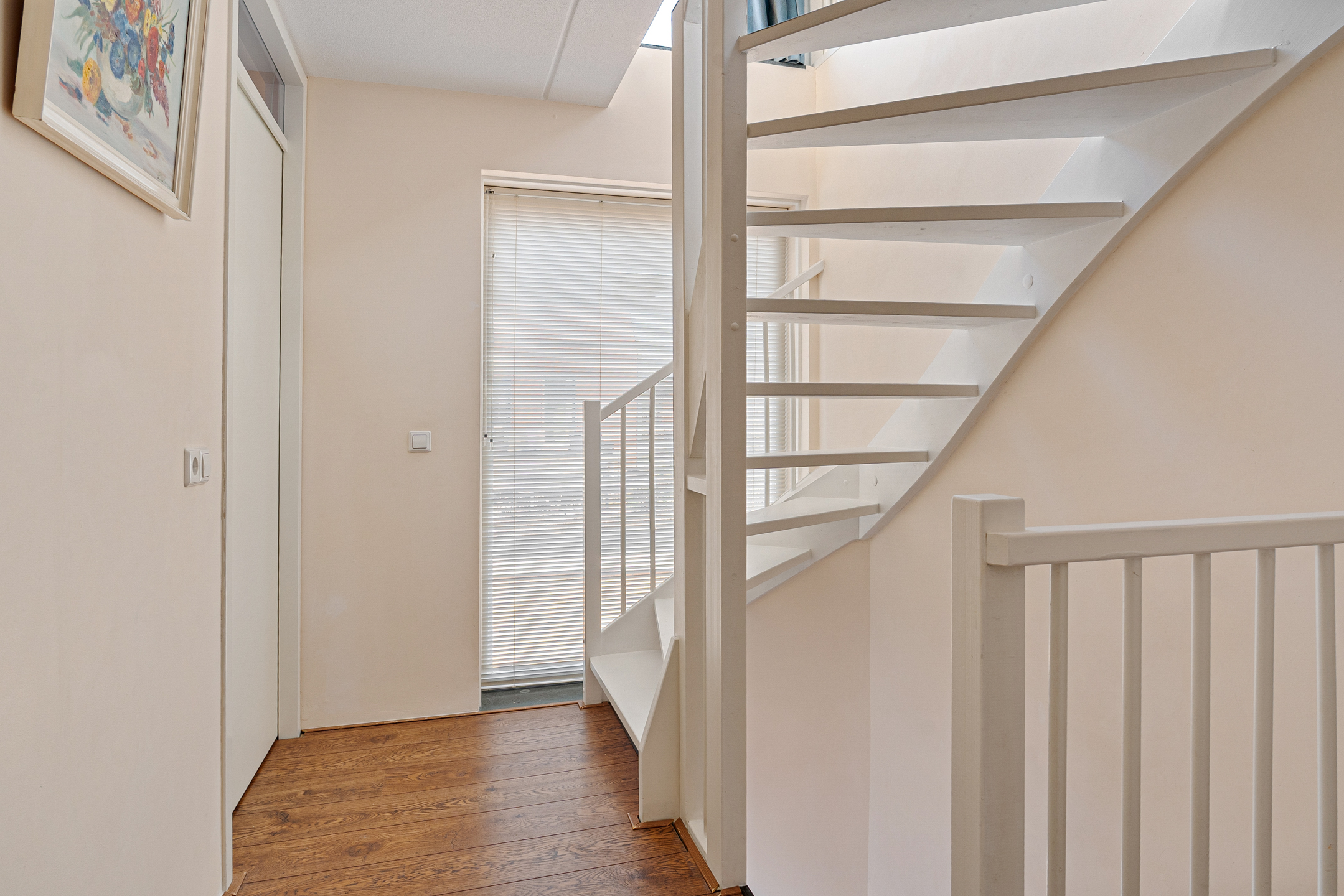 Bij binnenkomst kom je in de ruime hal met aan de rechterzijde het toilet en de meterkast en aan de linkerzijde de trap naar de eerste verdieping. Vanuit de hal kom je centraal in de woning.