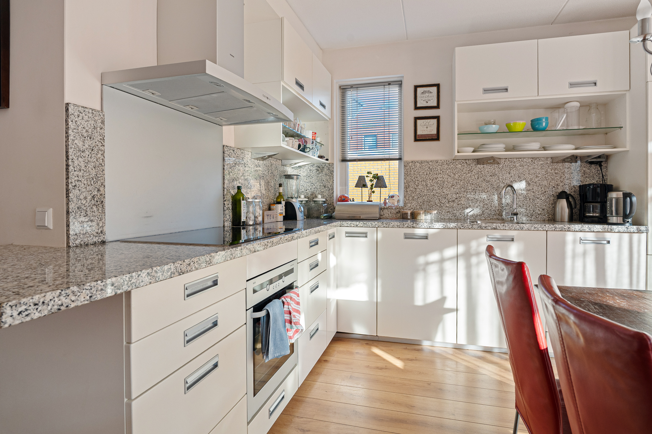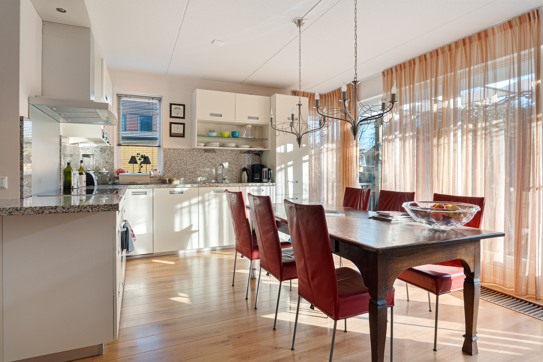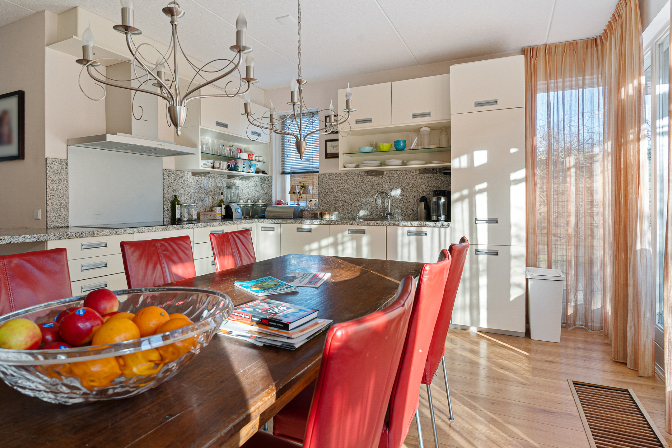 De open keuken in L-vorm ligt aan de voorzijde van de woning. Hier is voldoende ruimte voor een gezellige eettafel. De keuken is voorzien van diverse inbouwapparatuur, waaronder een inductiekookplaat, oven, vaatwasser, koelkast, vriezer en veel kastruimte. De gehele begane grond is afgewerkt met een fraaie laminaatvloer.