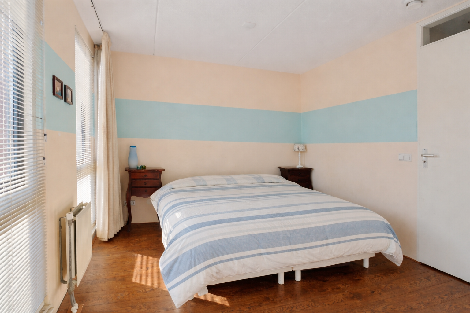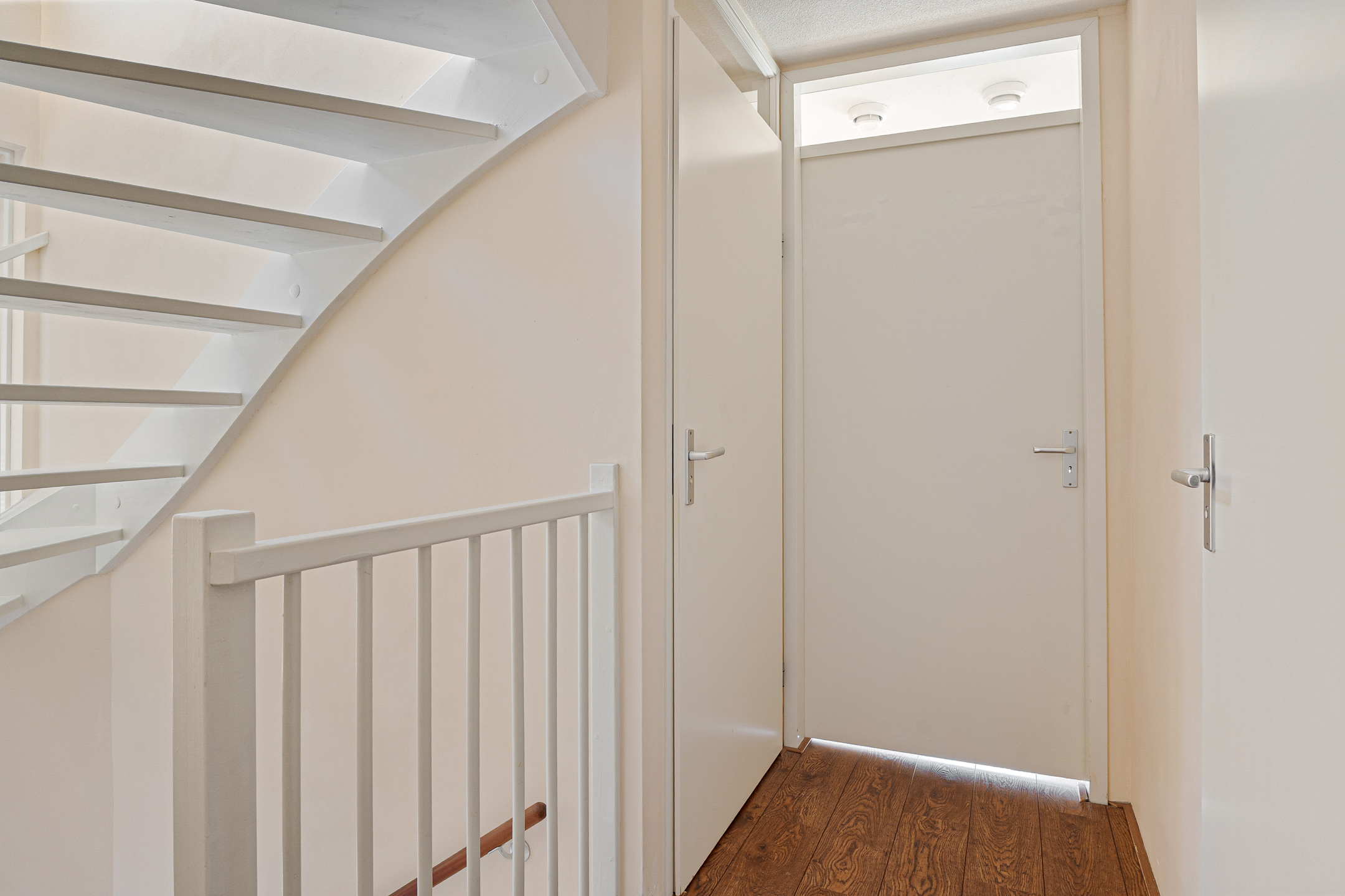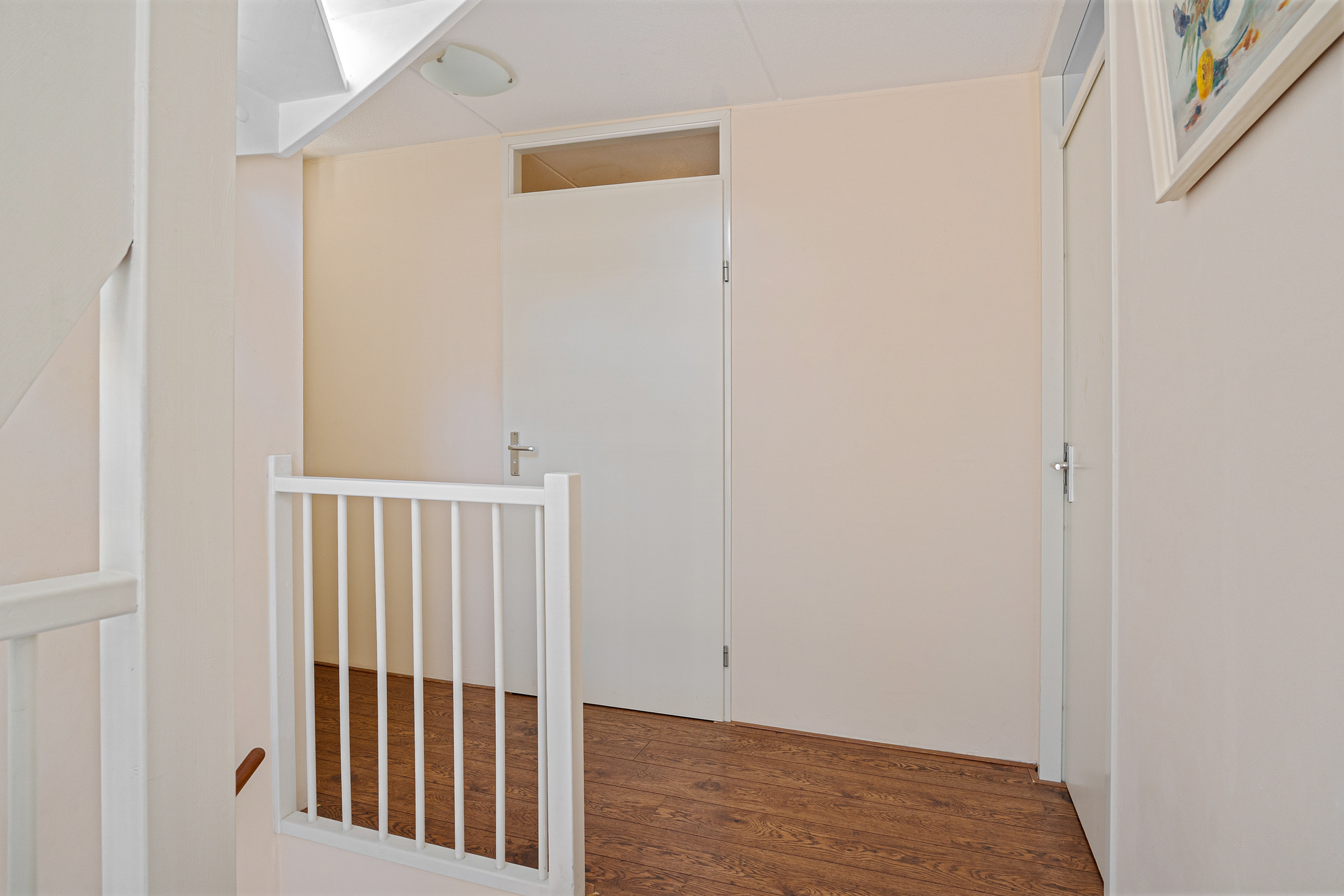 Via de overloop bereik je de drie slaapkamers. De hoofdslaapkamer ligt aan de voorzijde van de woning en beschikt over een praktische vaste kast.
