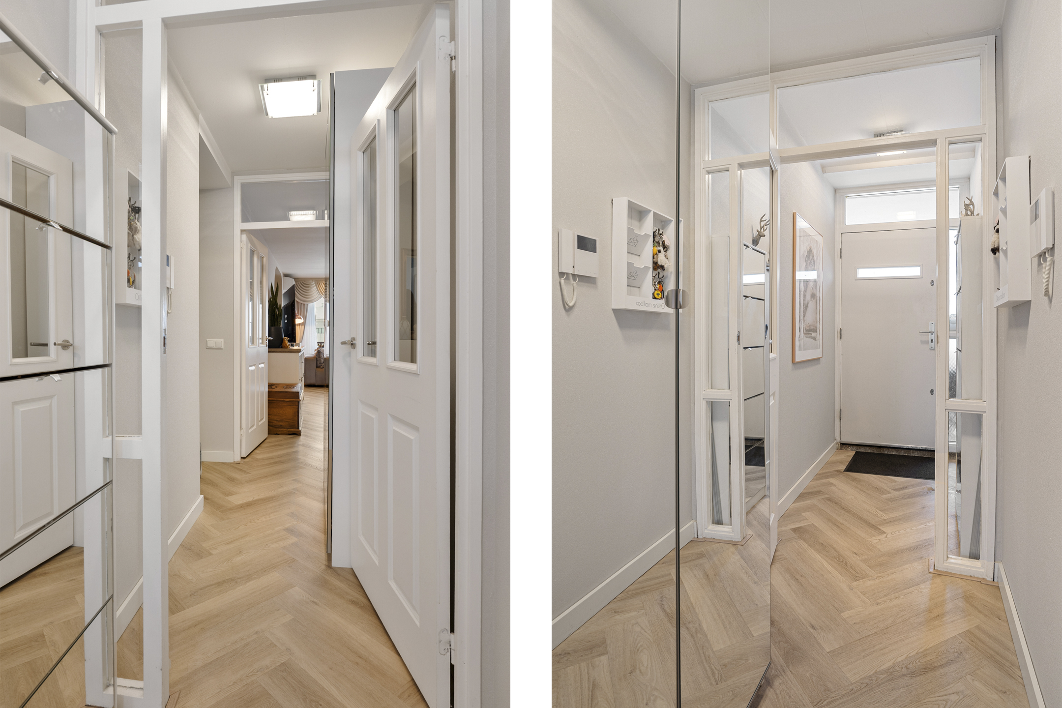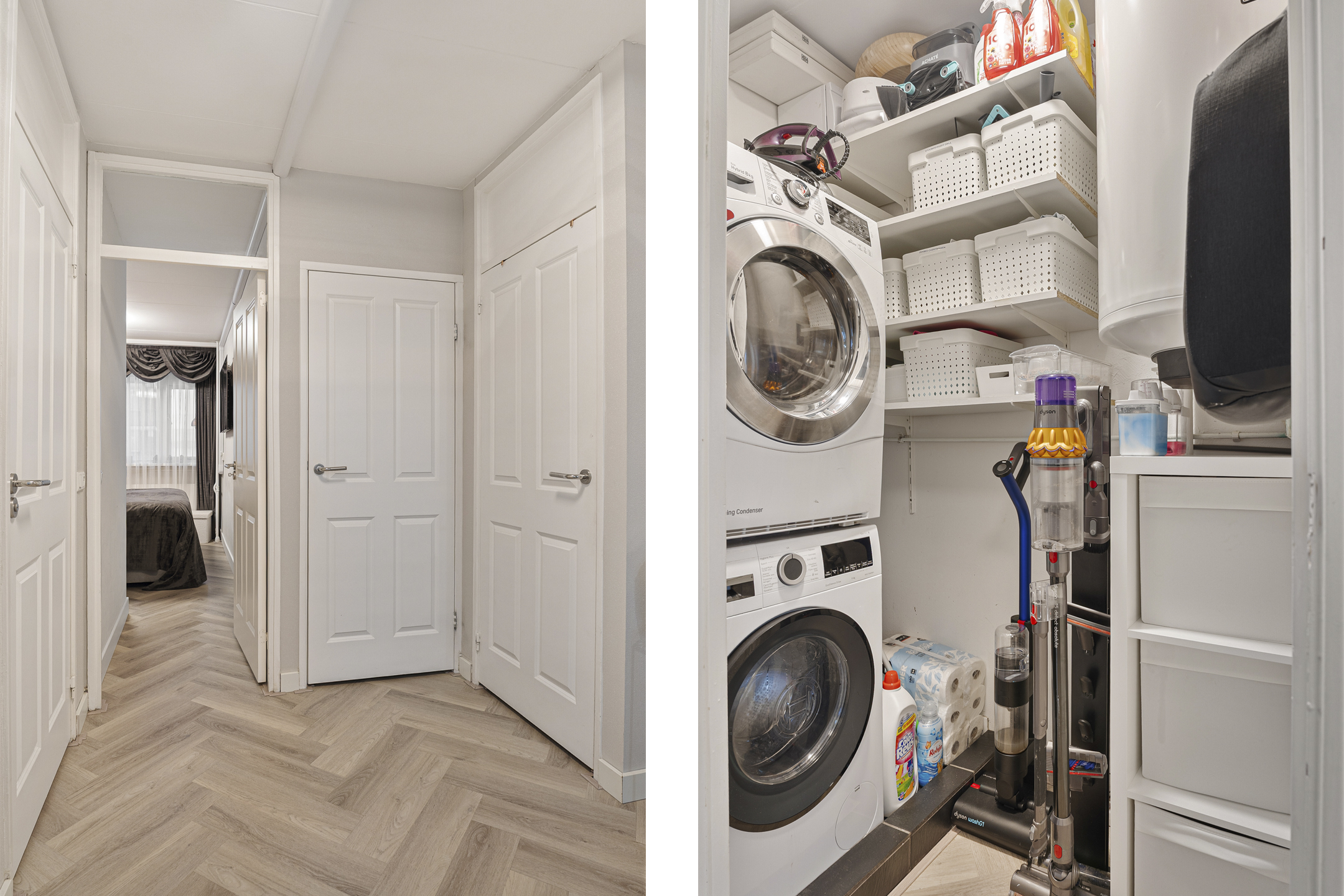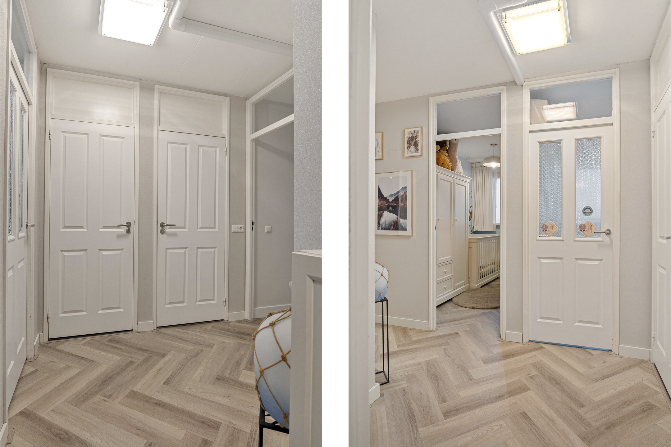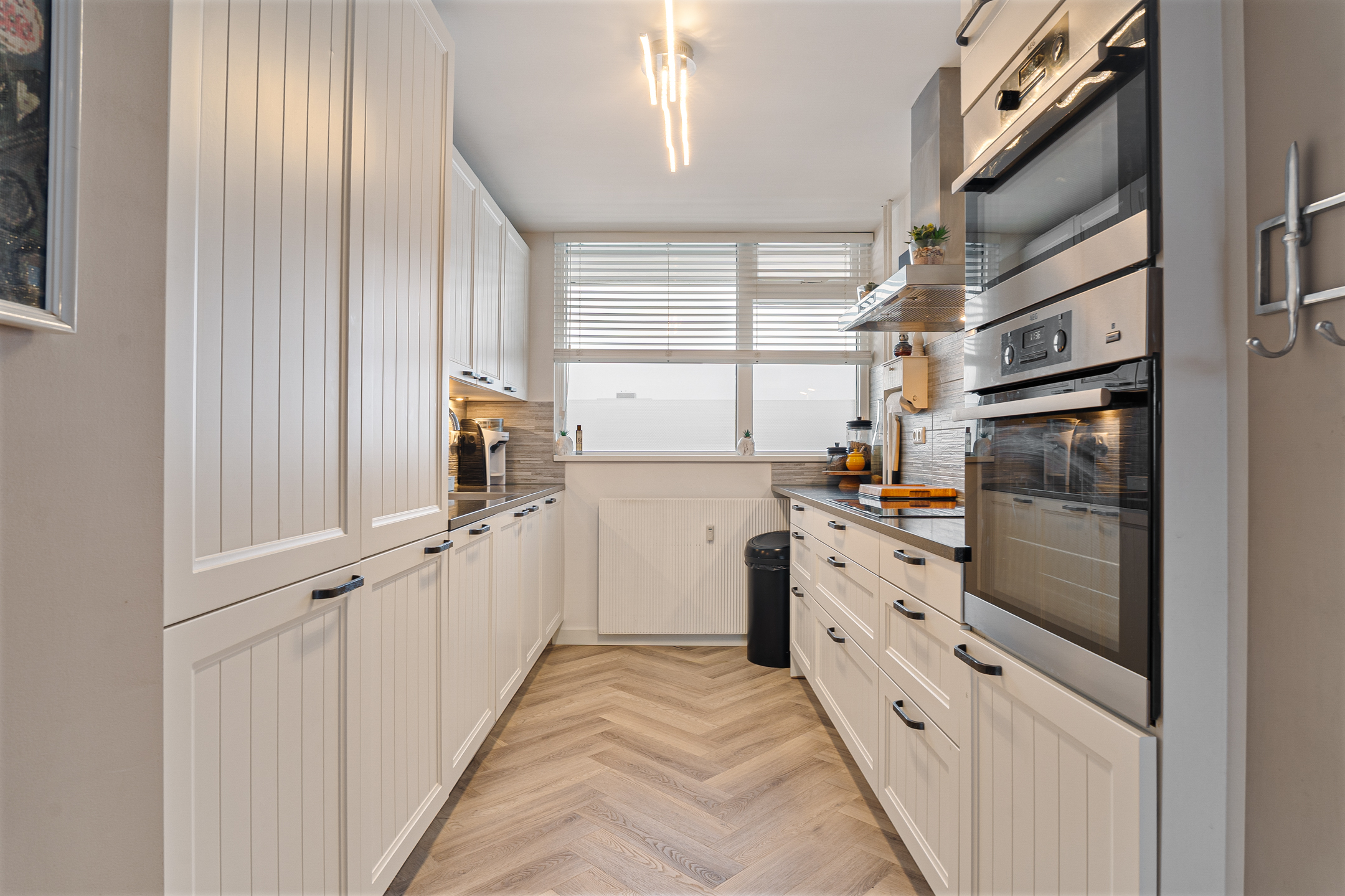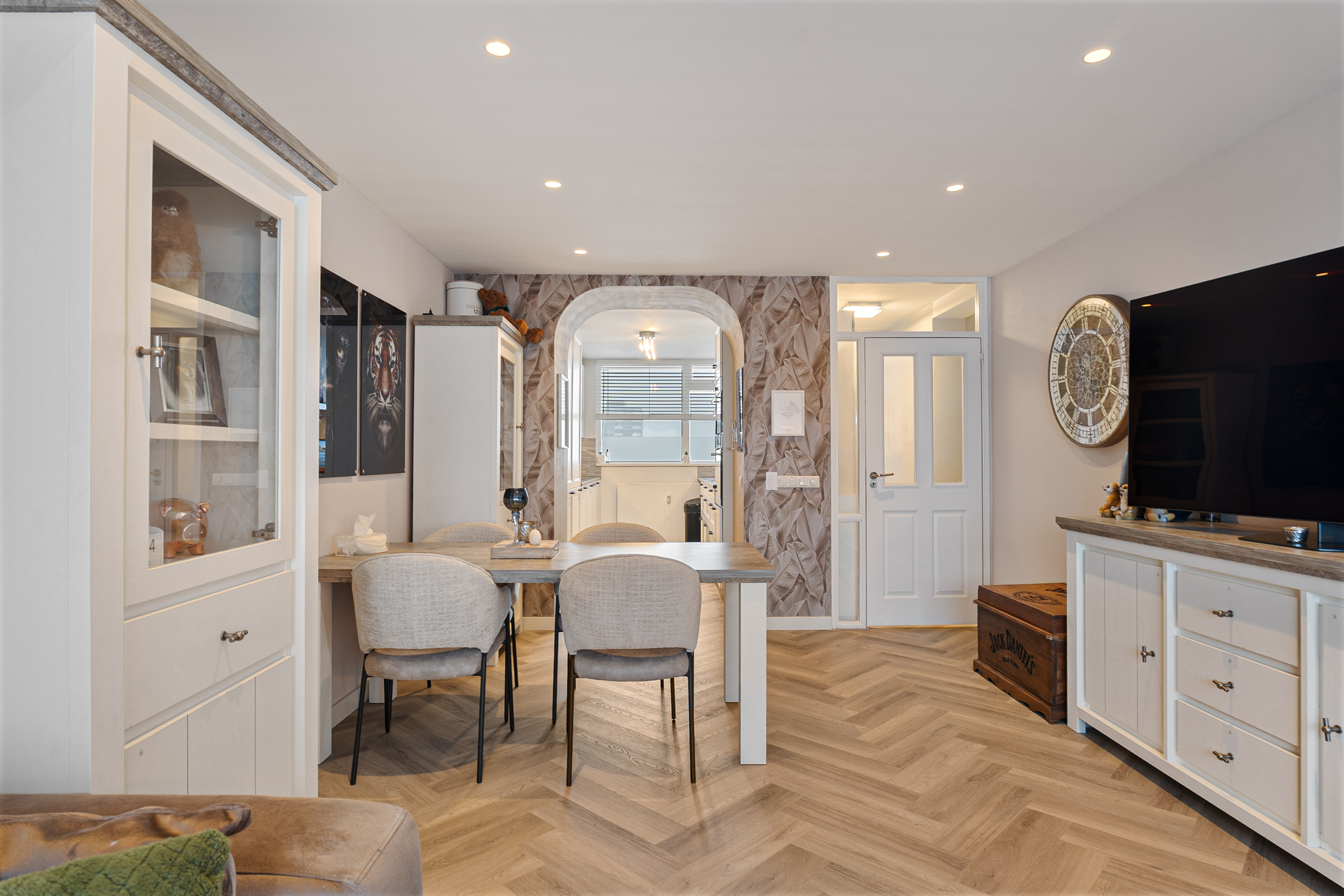 Je komt binnen via een ruime hal die toegang geeft tot alle vertrekken. De woonkamer is royaal opgezet en dankzij de grote raampartijen aan de westzijde is het hier de hele dag heerlijk licht. De visgraatvloer, strakke afwerking en open verbinding met de keuken geven deze ruimte een moderne en sfeervolle uitstraling.