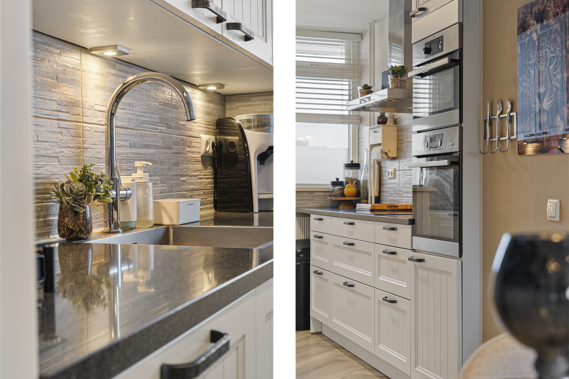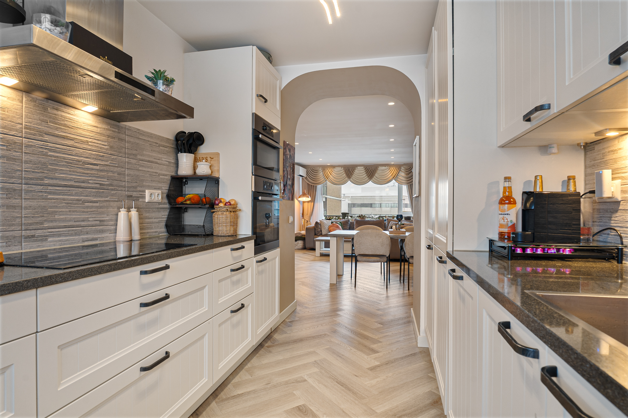 De halfopen keuken is bereikbaar via een stijlvolle toog en voorzien van diverse inbouwapparatuur, waaronder een inductiekookplaat, oven, magnetron, afzuigkap, vaatwasser en koelkast. De landelijke uitstraling met een donker werkblad zorgt voor een warme sfeer.