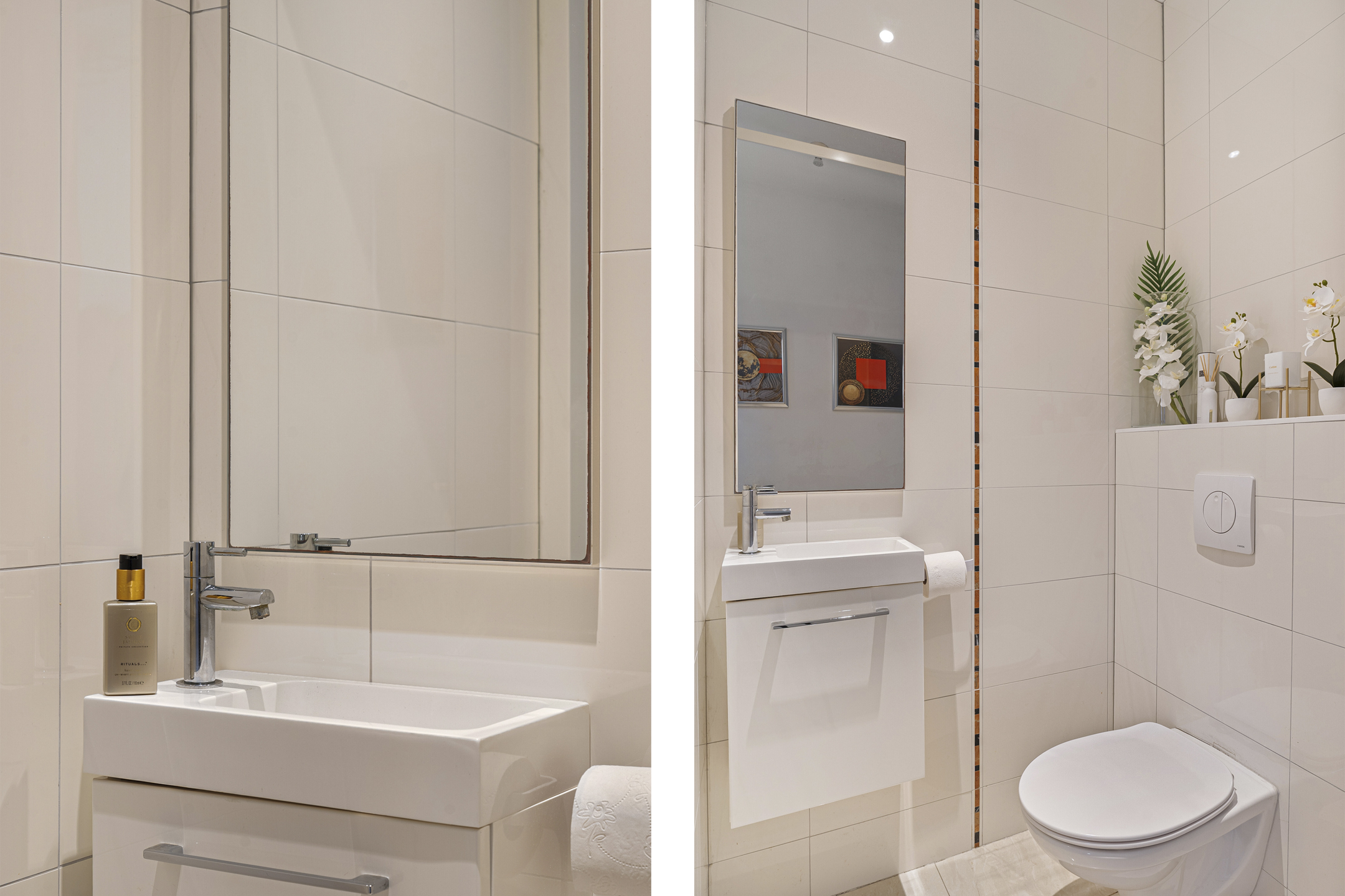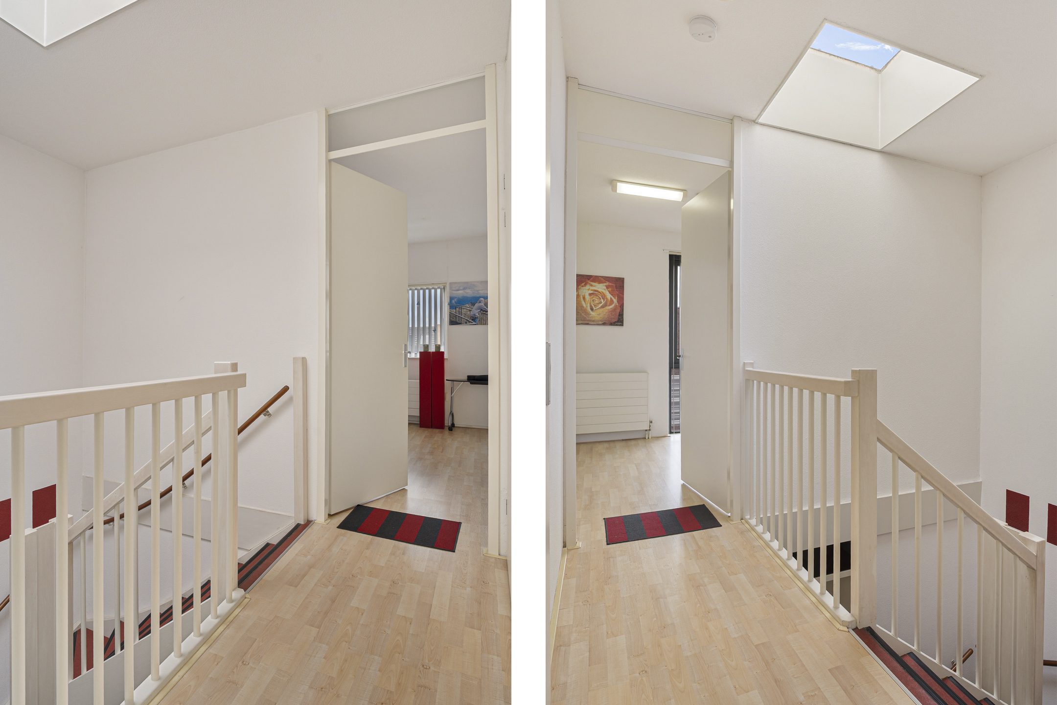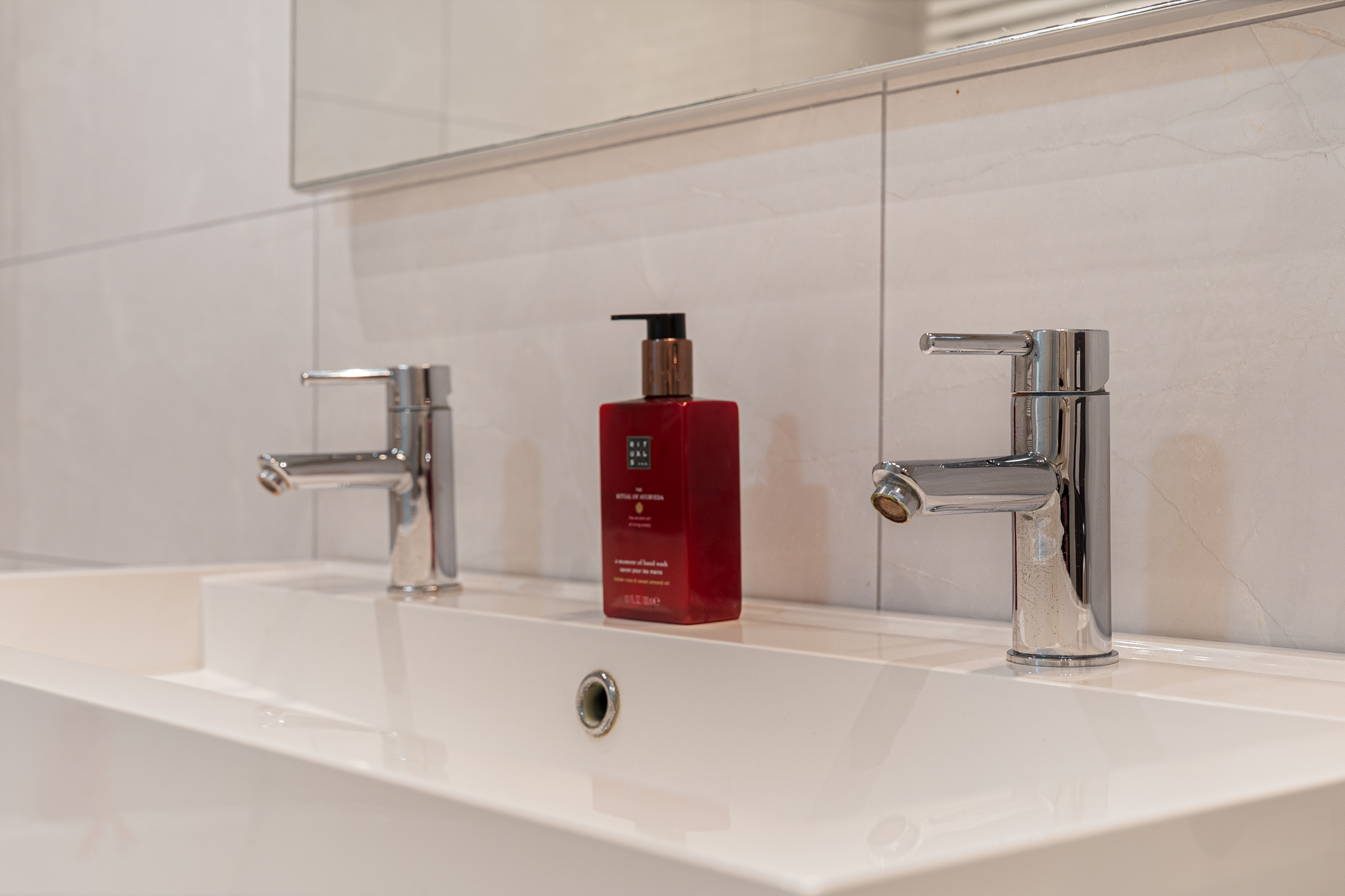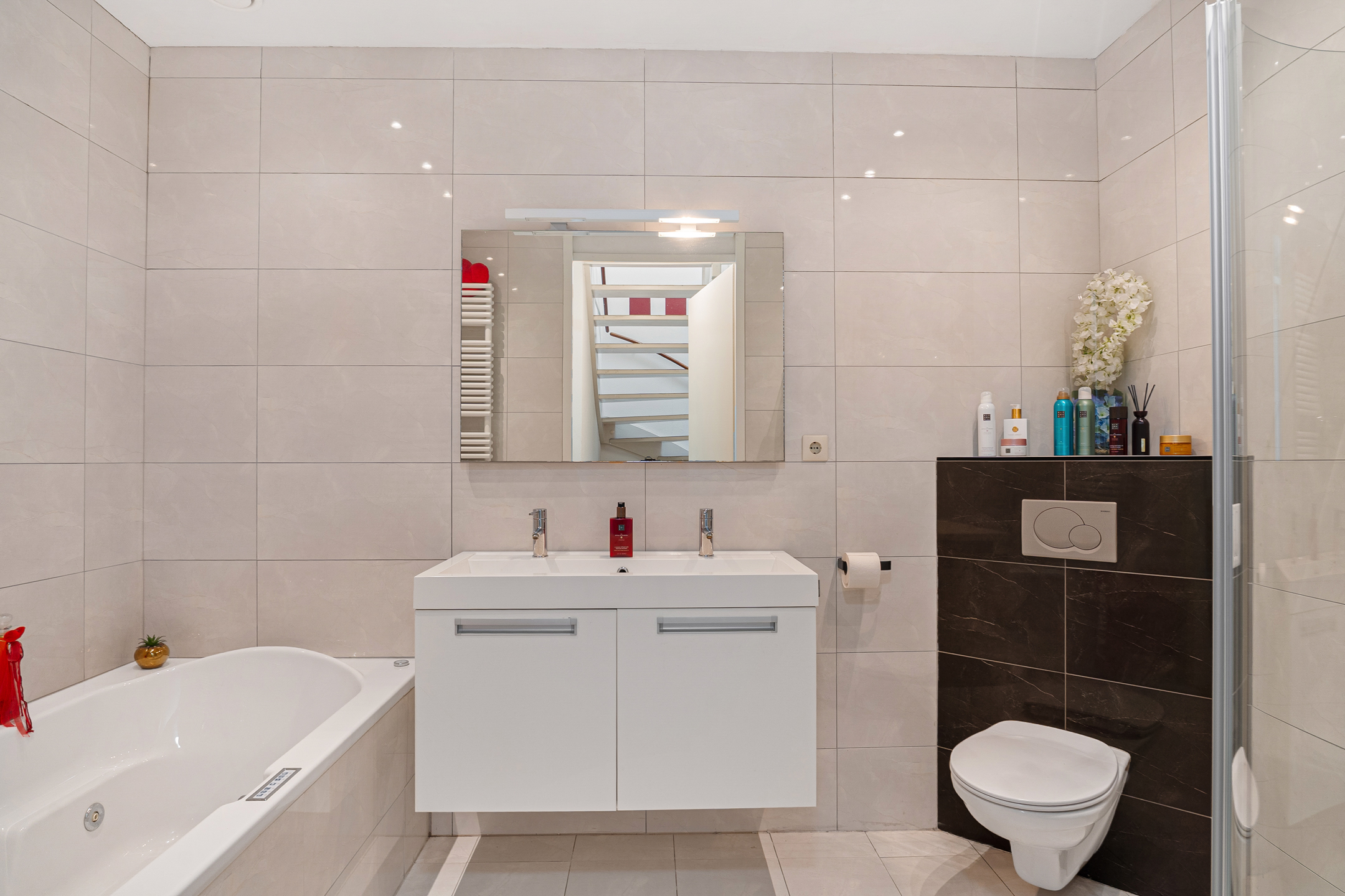 Ook hier zijn twee grote slaapkamers elk met een wastafel aanwezig, een tweede badkamer met douche én een aparte wasruimte met aansluiting voor de wasmachine en droger. Een ideale verdieping voor opgroeiende kinderen of logees die wat extra privacy waarderen.