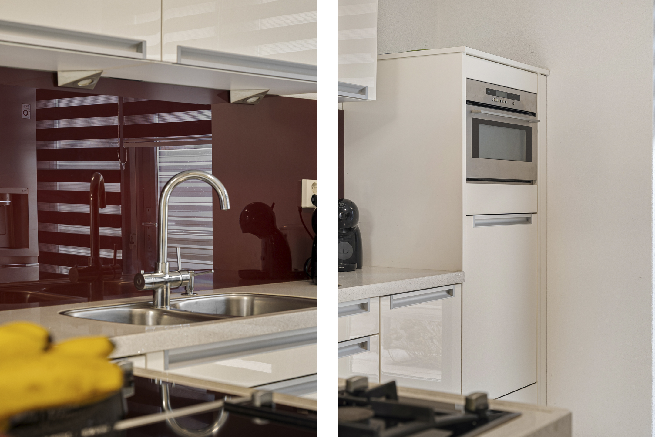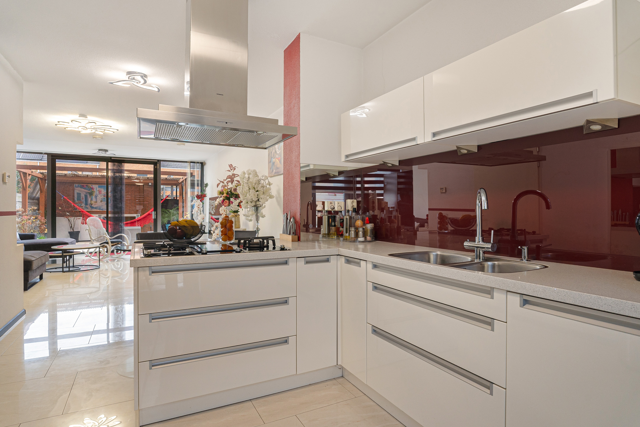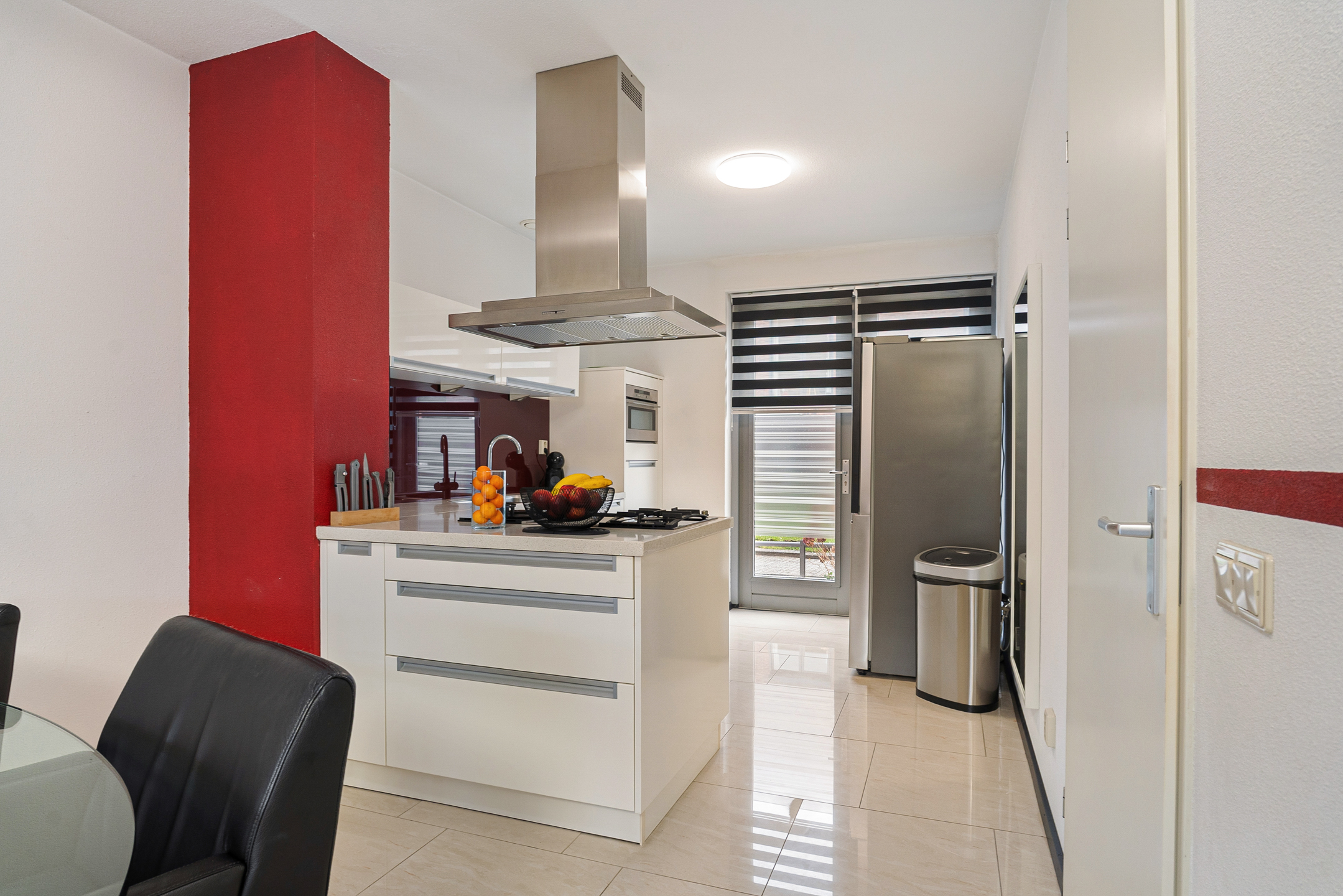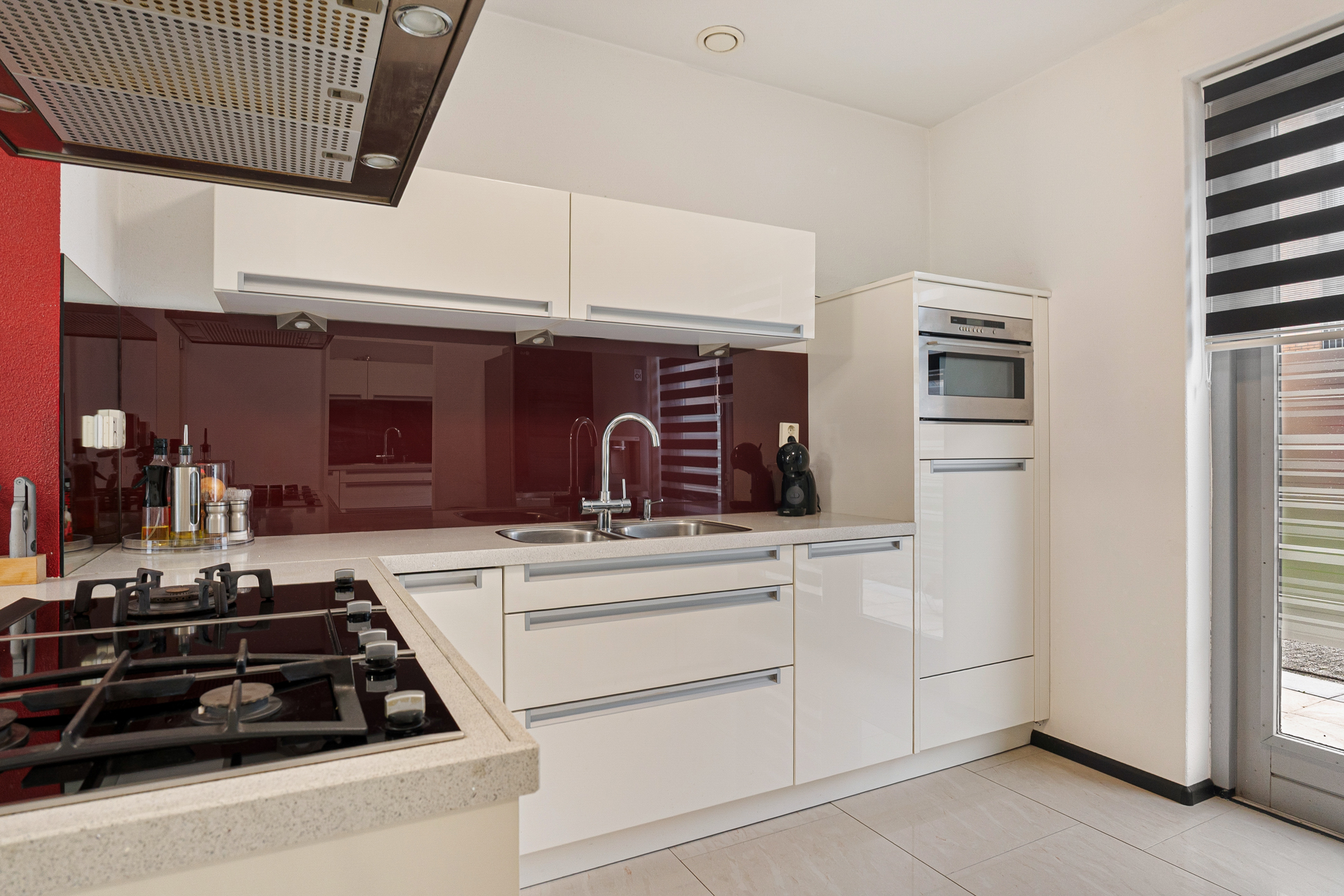 Je komt binnen in de hal met toilet, trapopgang en inpandige berging. Aan de voorzijde ligt de moderne keuken in hoekopstelling, compleet met inbouwapparatuur zoals een gaskookplaat, combimagnetron, vaatwasser, elektrische grill en voldoende opbergruimte.