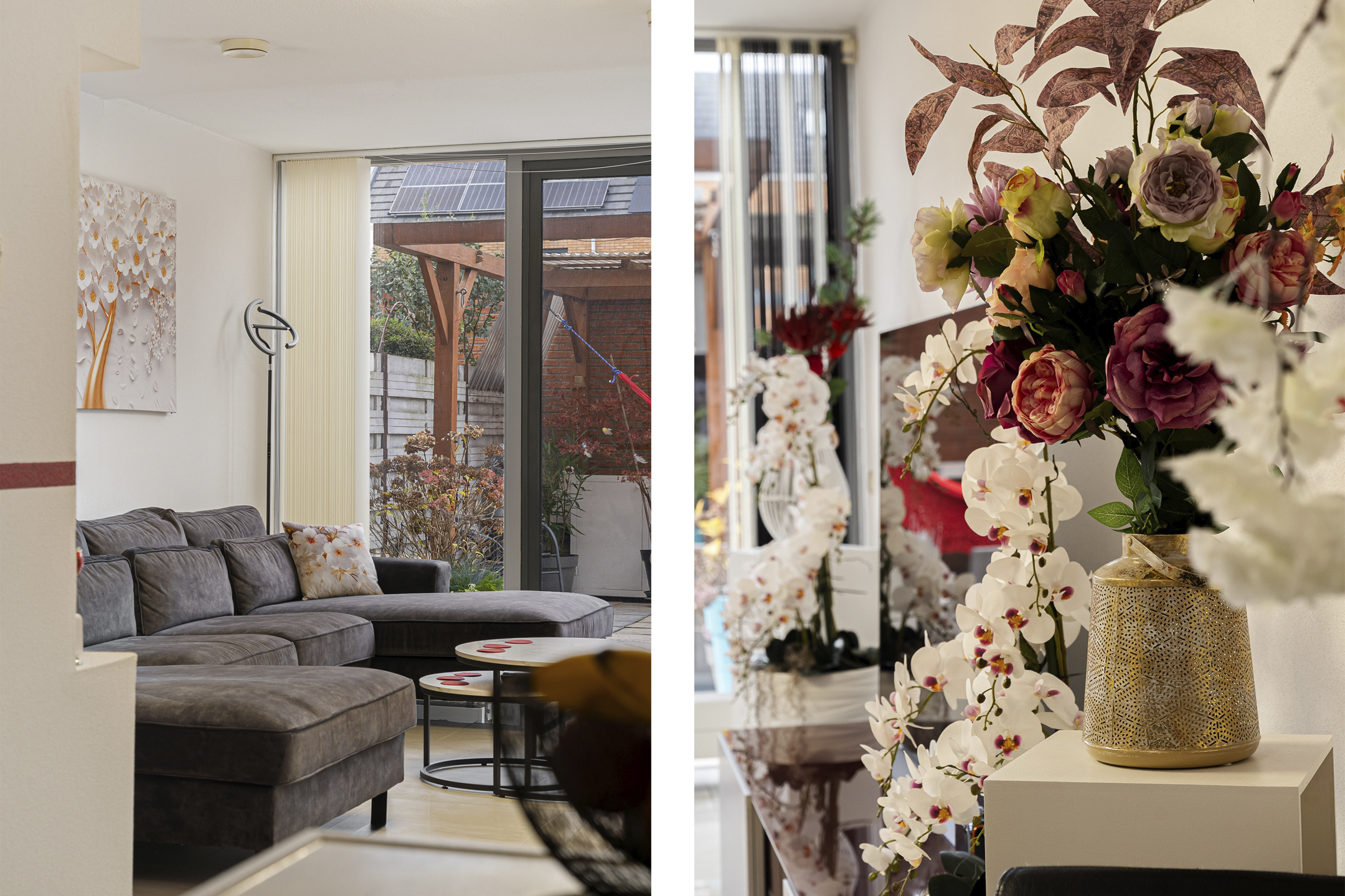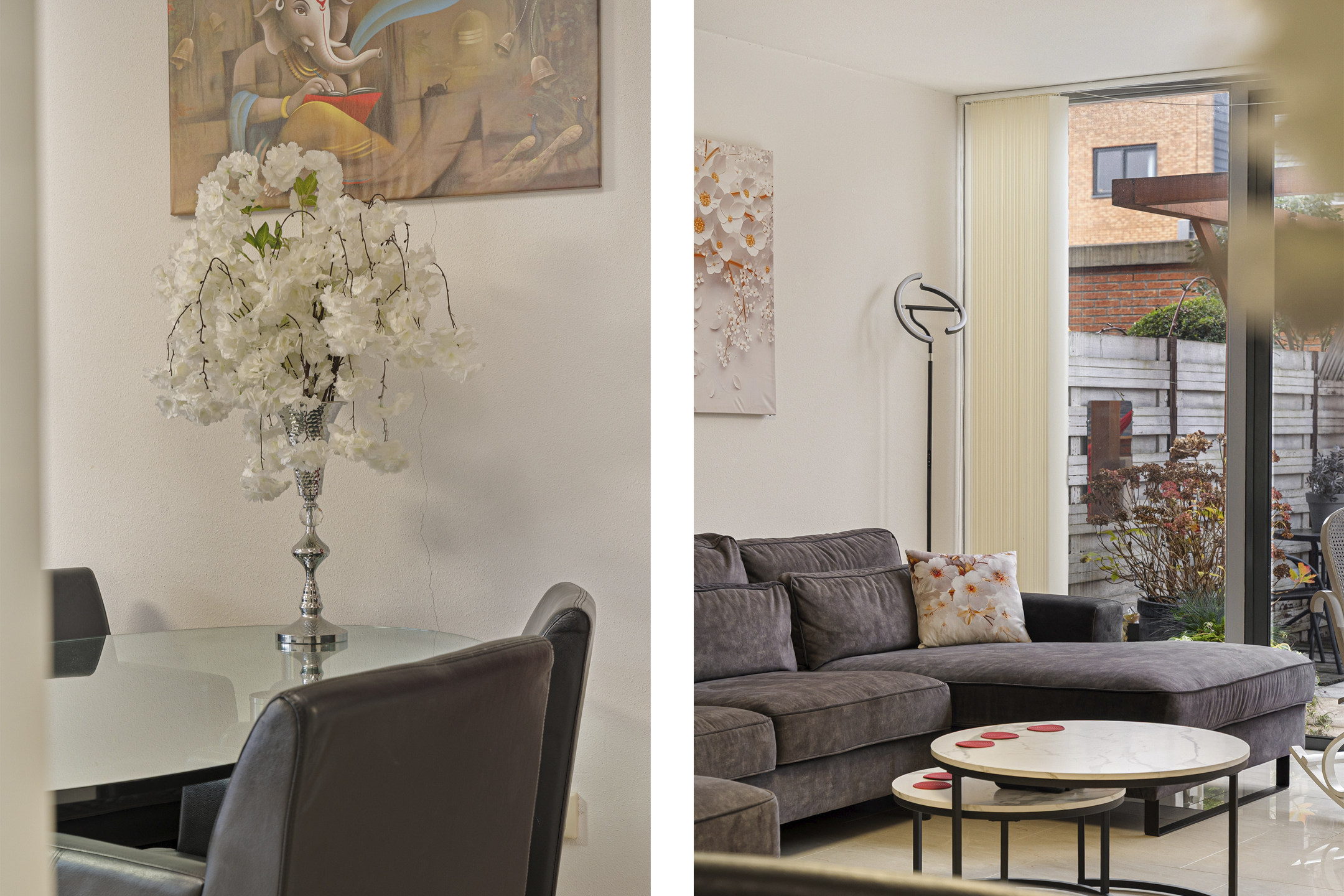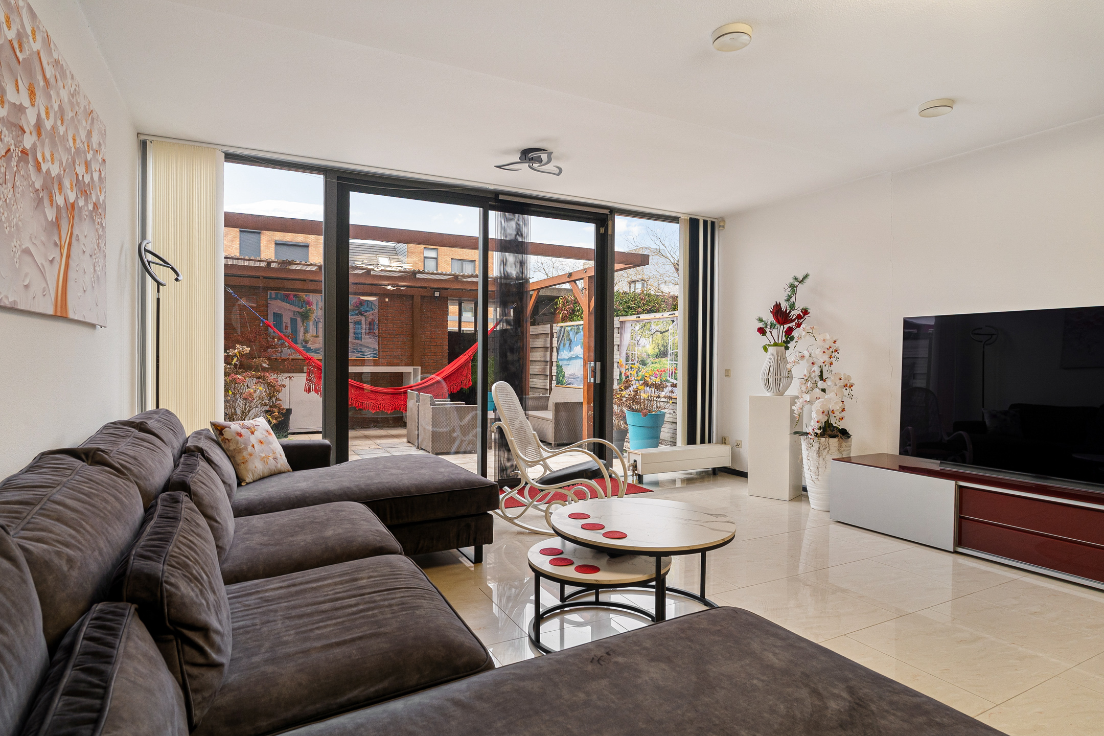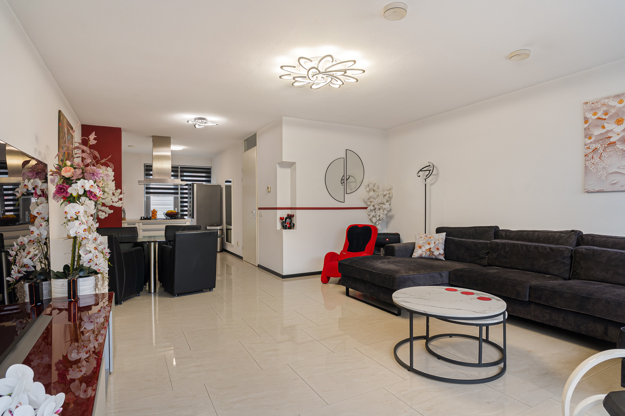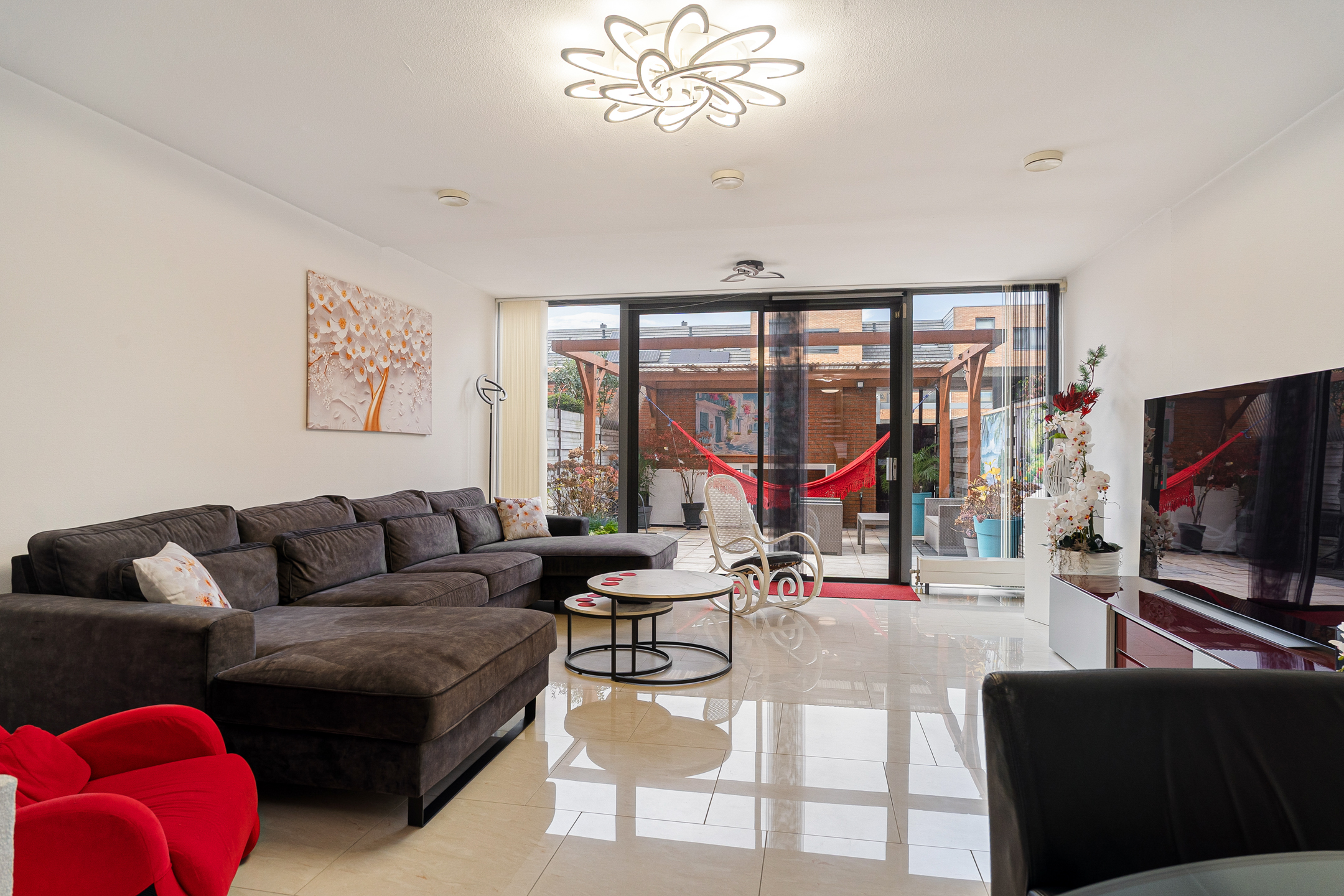 De royale woonkamer aan de achterzijde is licht en ruim, met een grote schuifpui naar de tuin die zorgt voor een fijne verbinding tussen binnen en buiten.