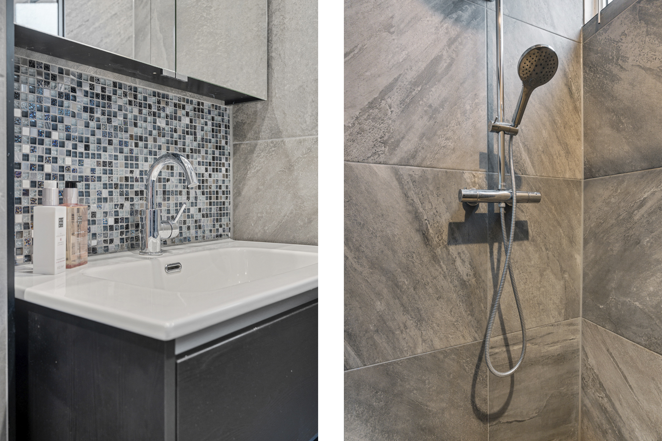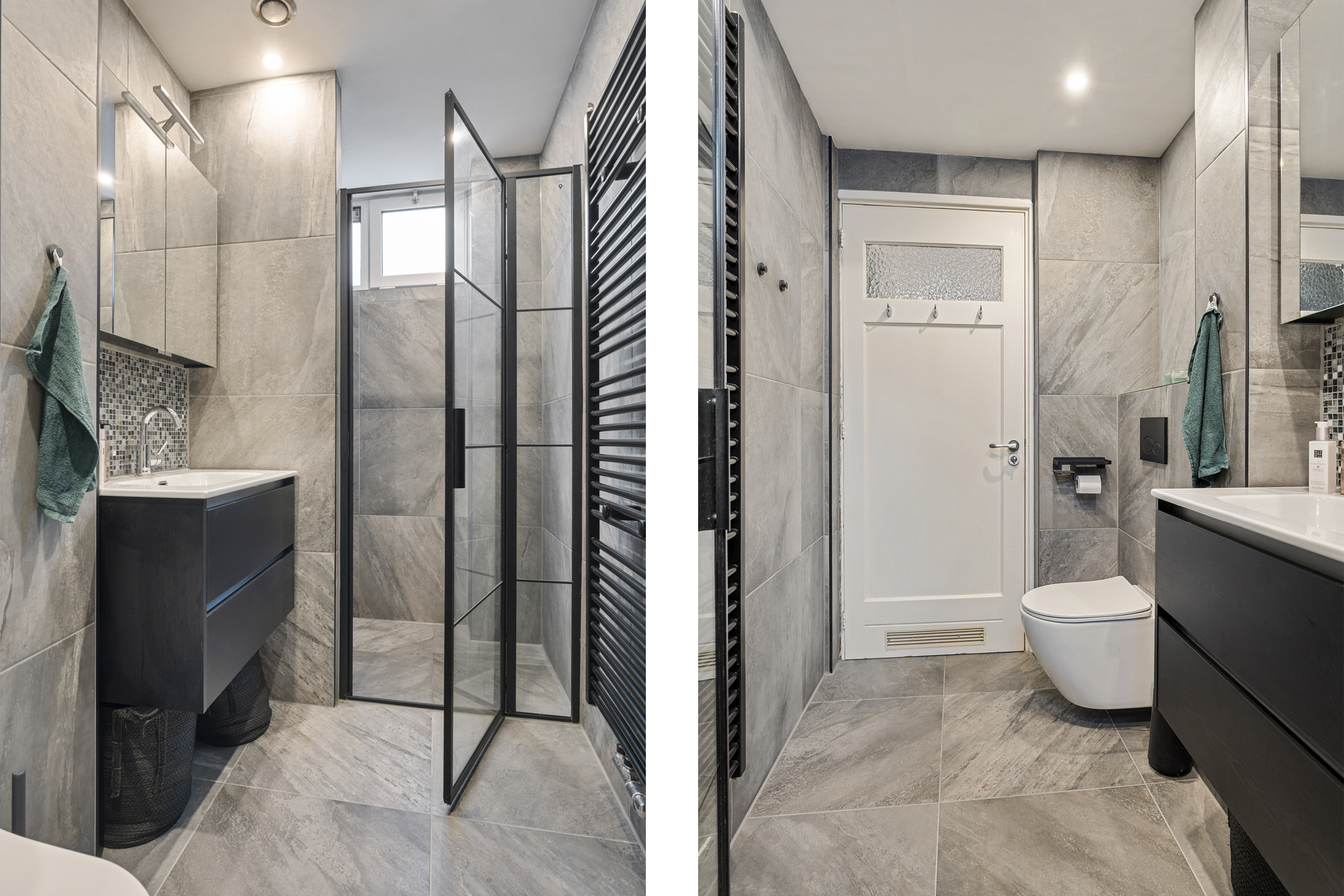 Bij binnenkomst via de voordeur bevindt de moderne en ruime badkamer zich direct aan de rechterzijde. De badkamer is strak afgewerkt en voorzien van een inloopdouche, spotjes, wastafelmeubel, spiegelkast, handdoekradiator, wandcloset en een raam voor natuurlijke ventilatie. De ruimte is volledig betegeld en praktisch ingericht.