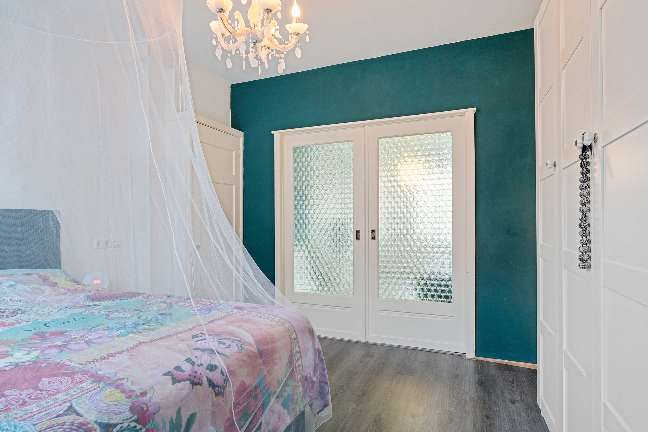 De hoofdslaapkamer is bereikbaar via de woonkamer middels twee schuifdeuren, maar ook via de hal. Deze kamer ligt aan de achterzijde en biedt via een deur toegang tot het balkon en de tuin. In de praktische inbouwkast is de cv-ketel opgesteld.