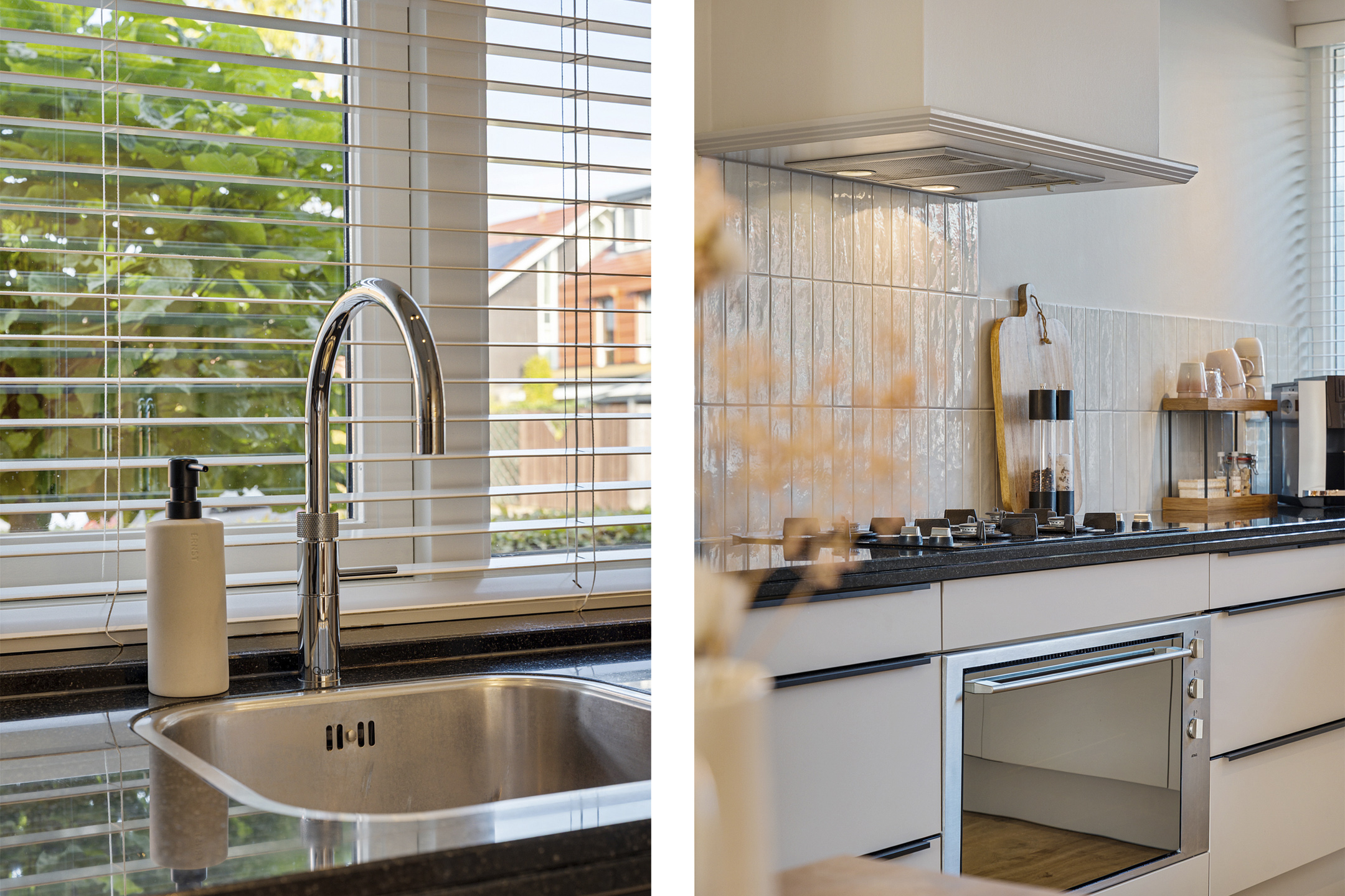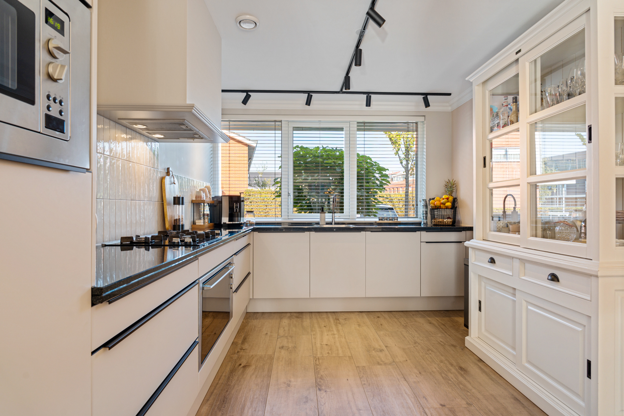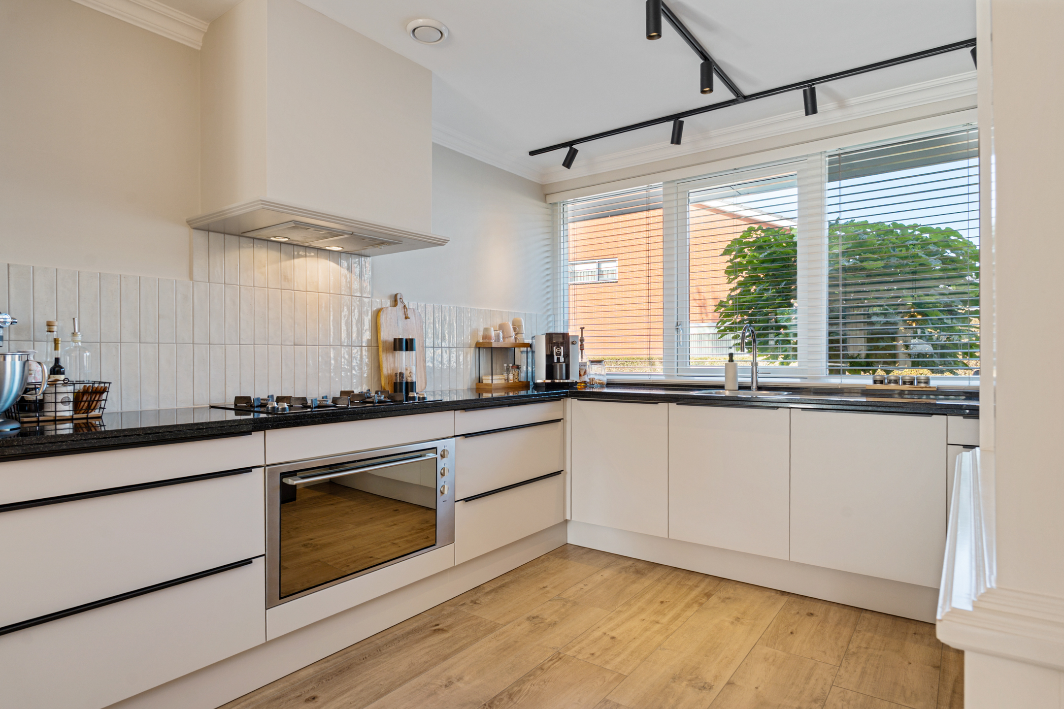 Aan de voorzijde bevindt zich de luxe keuken, uitgevoerd in een praktische hoekopstelling met inbouwapparatuur zoals een 4-pits gasfornuis, oven, magnetron, Quooker, vaatwasser, koelkast en vriezer. De keuken is stijlvol afgewerkt met hoogwaardige materialen en oogt fris en eigentijds.