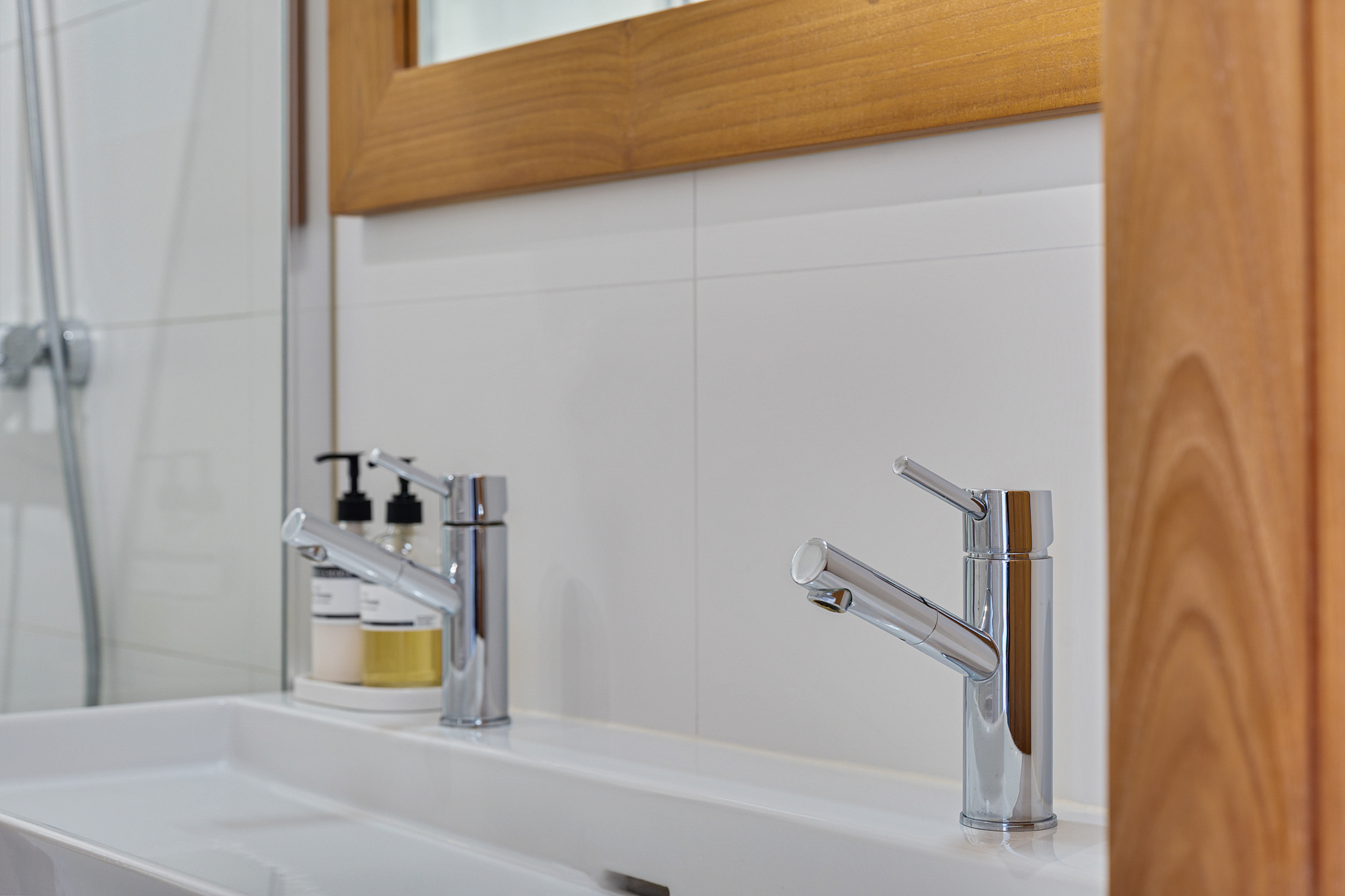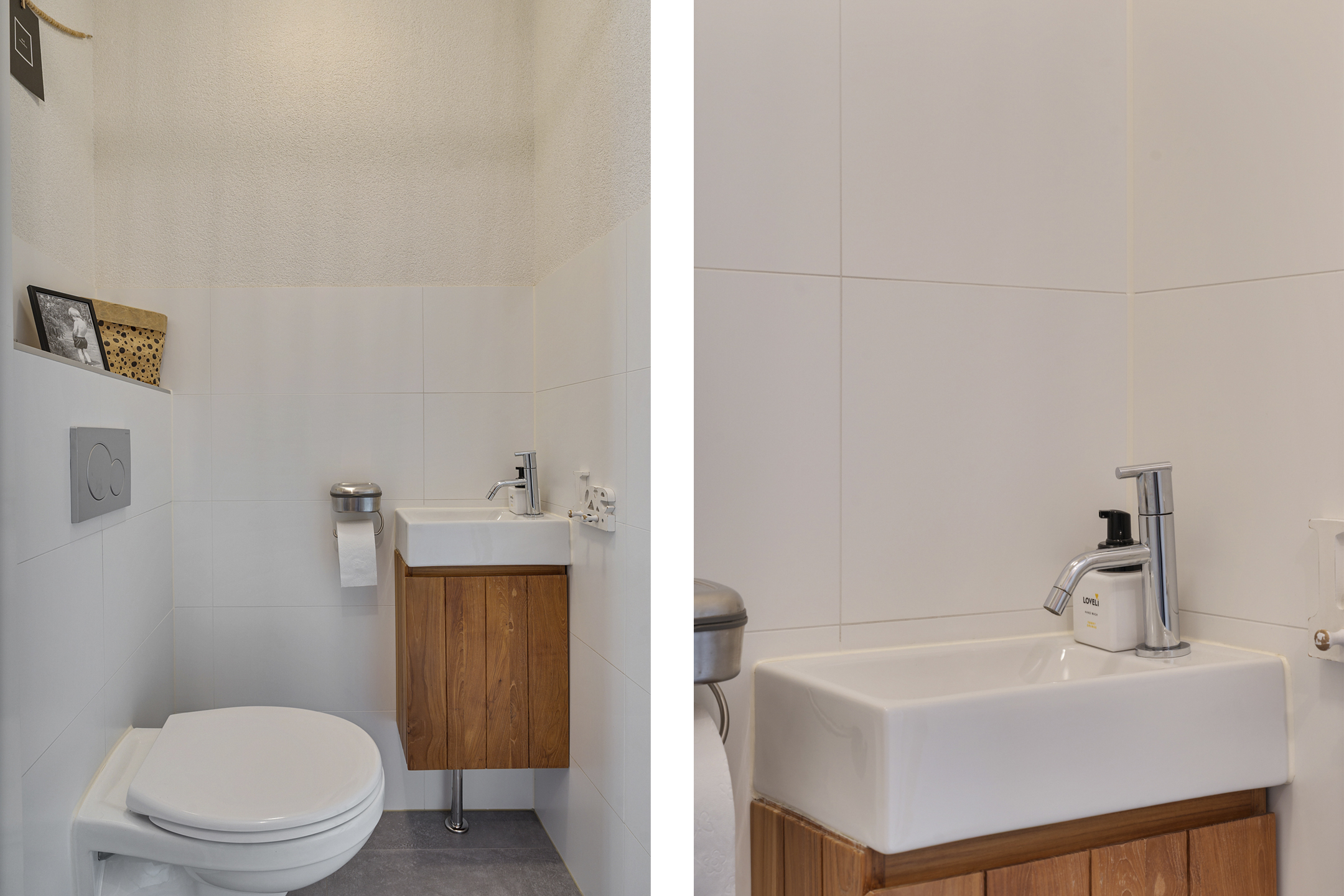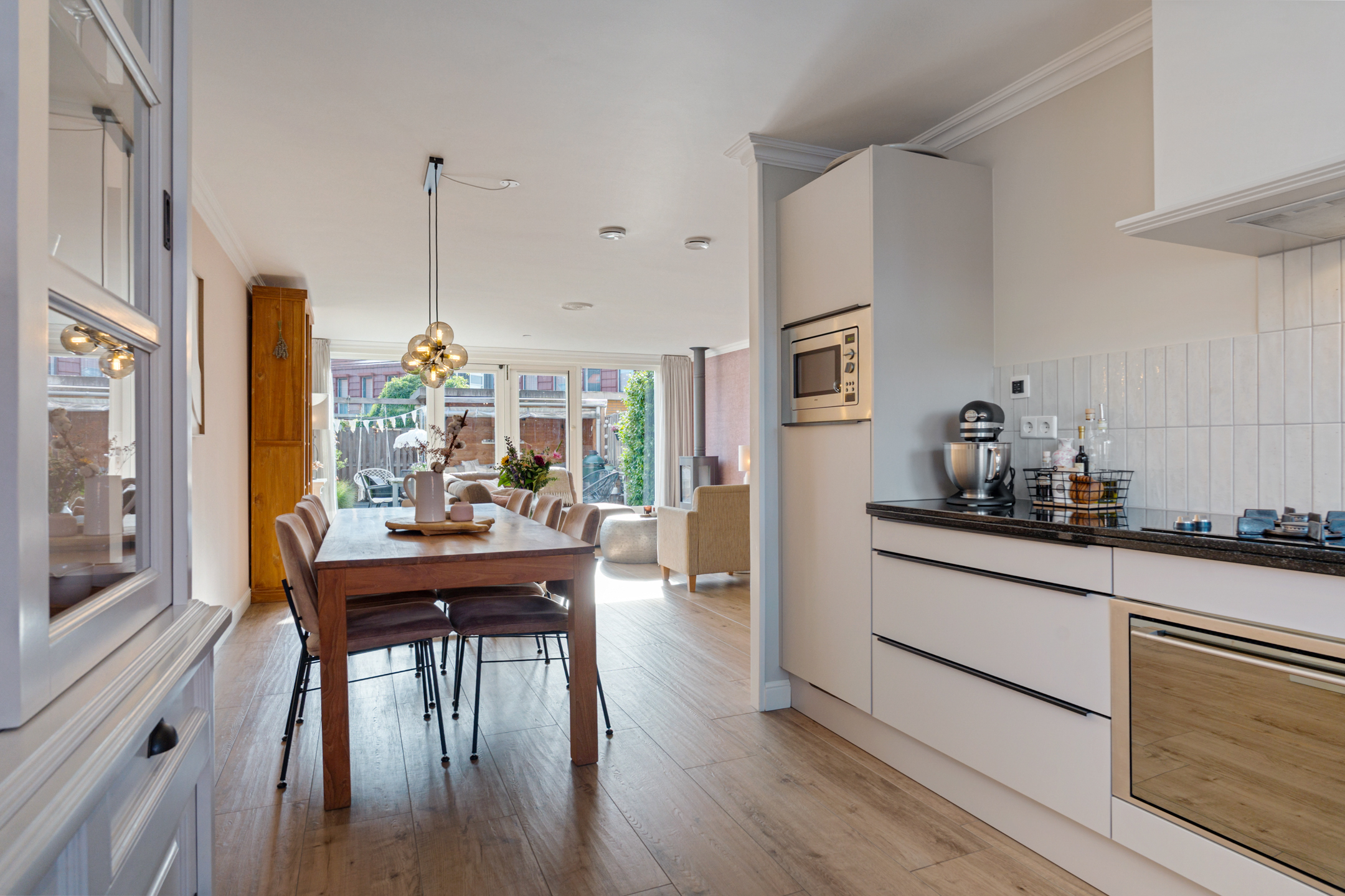 Aan de voorzijde bevindt zich de luxe keuken, uitgevoerd in een praktische hoekopstelling met inbouwapparatuur zoals een 4-pits gasfornuis, oven, magnetron, Quooker, vaatwasser, koelkast en vriezer. De keuken is stijlvol afgewerkt met hoogwaardige materialen en oogt fris en eigentijds.