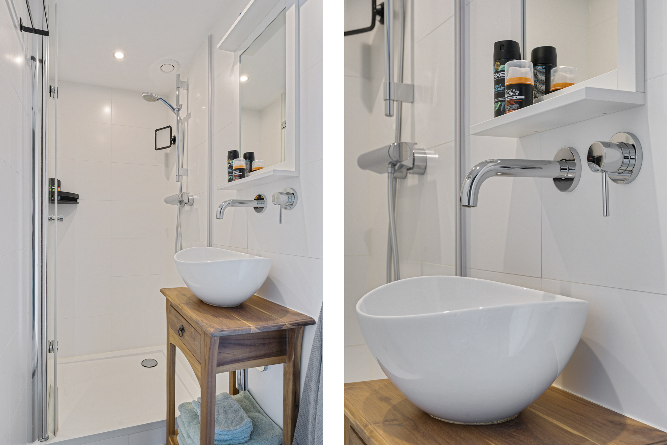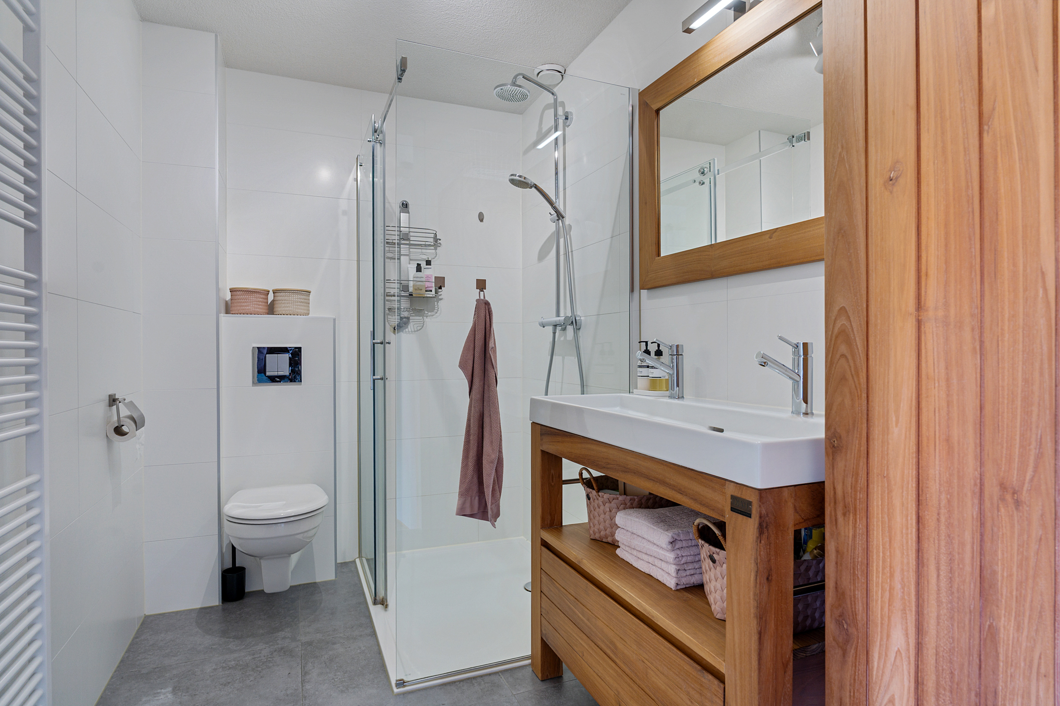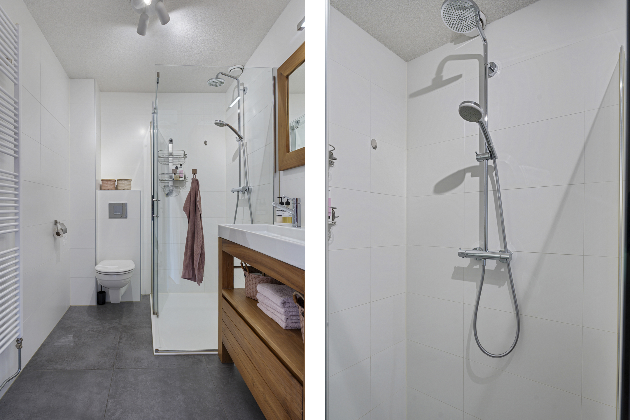 Op de eerste verdieping bevinden zich drie goed afgewerkte slaapkamers, allemaal voorzien van keurige vloeren en wanden. De ruime slaapkamer aan de voorzijde valt op door de brede raampartij en royale lichtinval. De badkamer, centraal op de verdieping, is modern ingericht met een inloopdouche met glazen wand, dubbele wastafel, handdoekradiator en toilet.