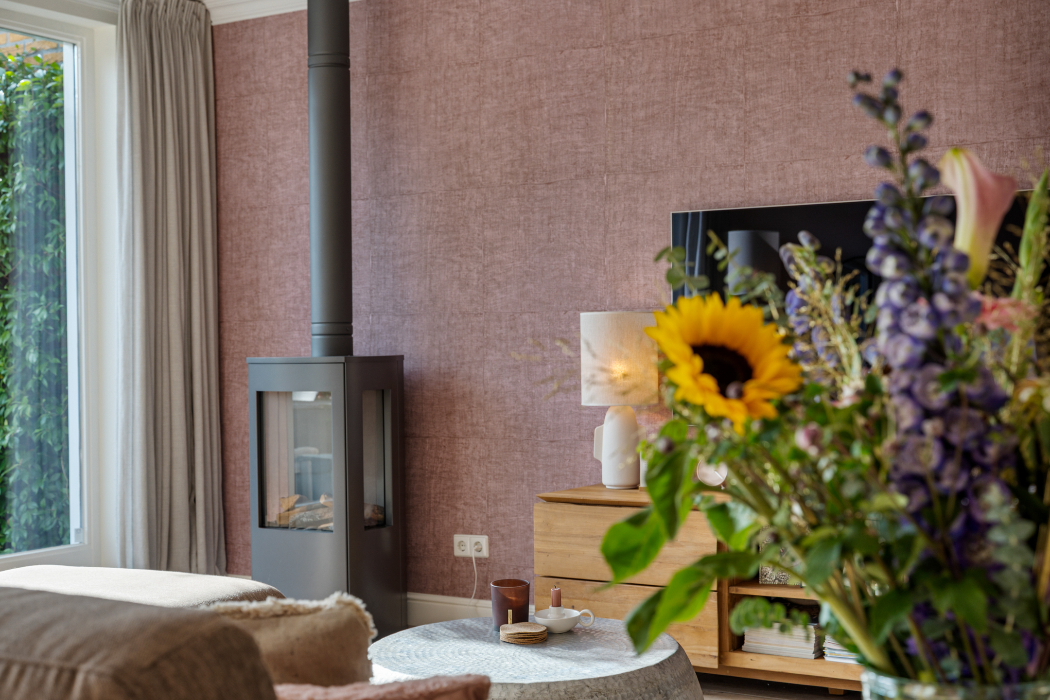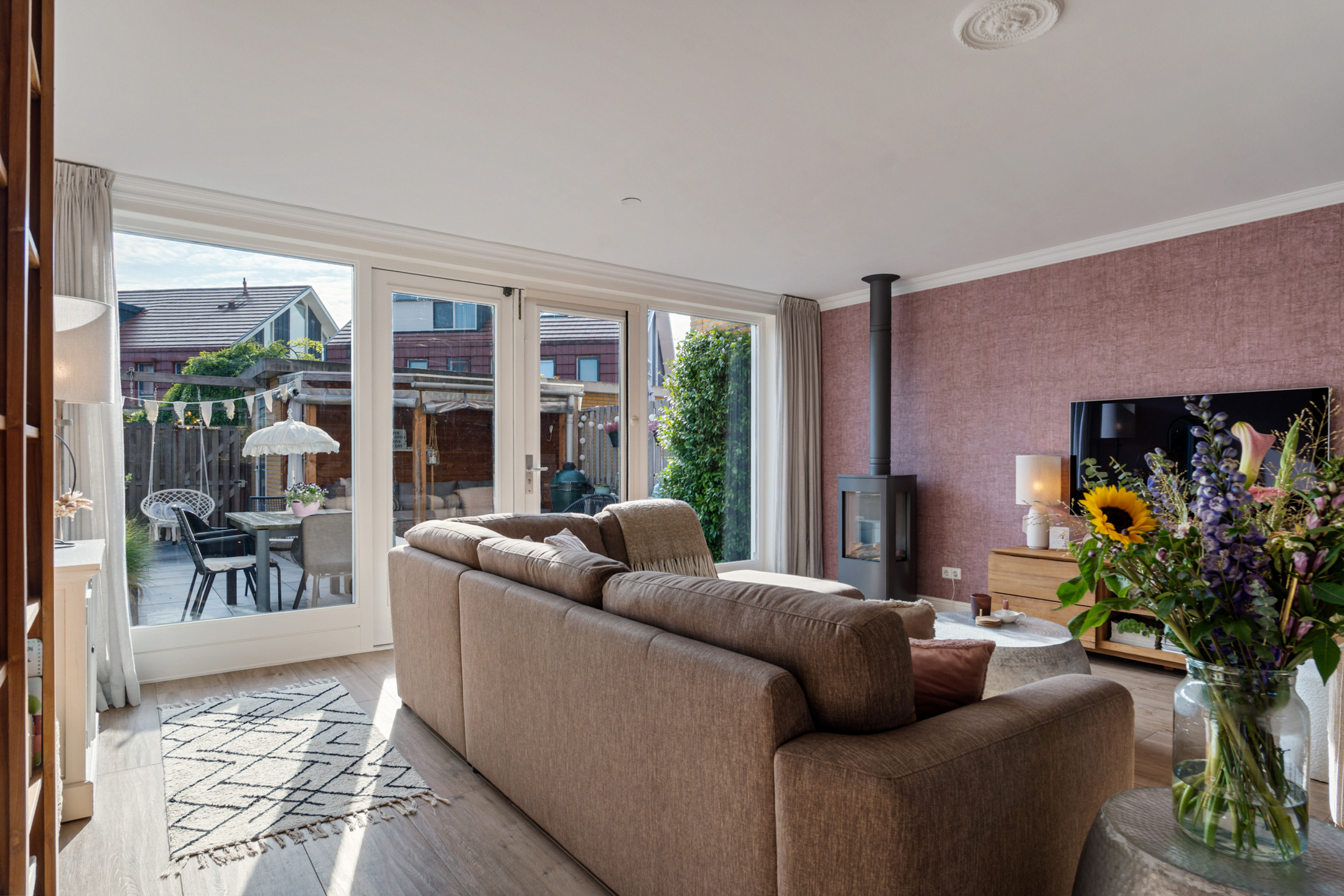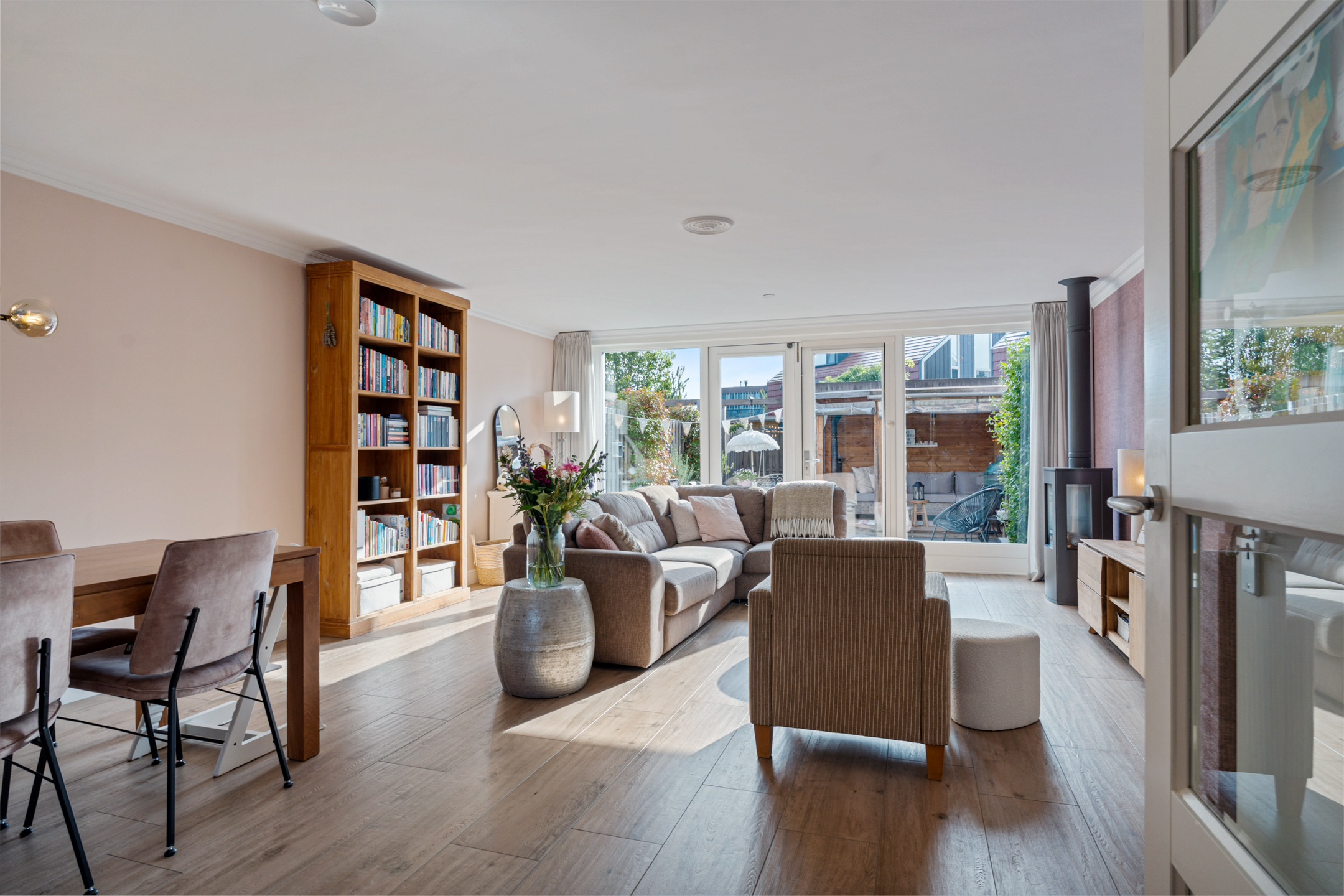 Via de nette voortuin stap je binnen in de hal met modern toilet (wandcloset), meterkast en toegang tot de woonkamer. De tuingerichte living is heerlijk licht door de grote raampartijen en openslaande deuren naar de achtertuin. De moderne plavuizenvloer met vloerverwarming, sfeervolle gashaard en de gladde wandafwerking zorgen voor een moderne uitstraling en een comfortabel woonklimaat.