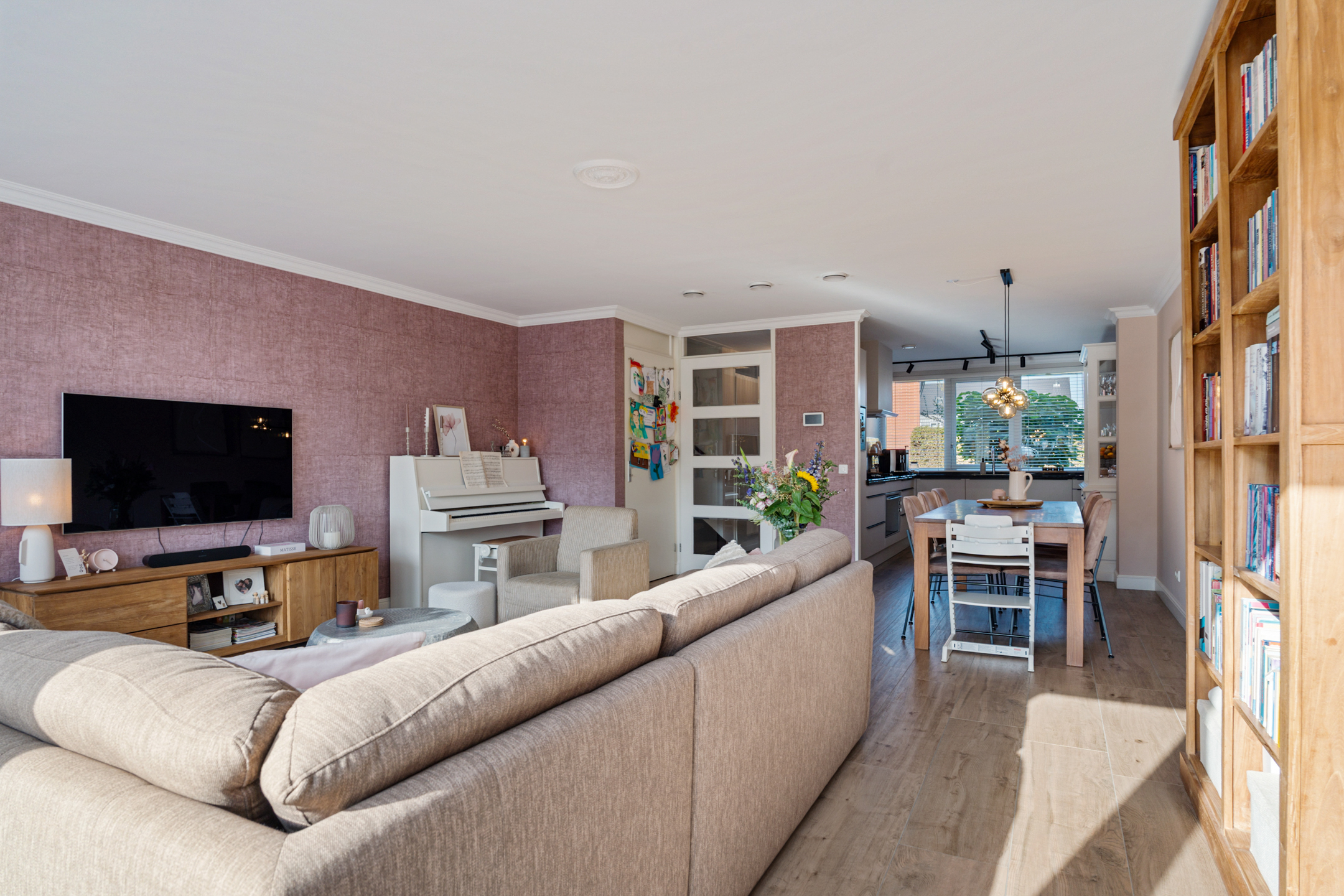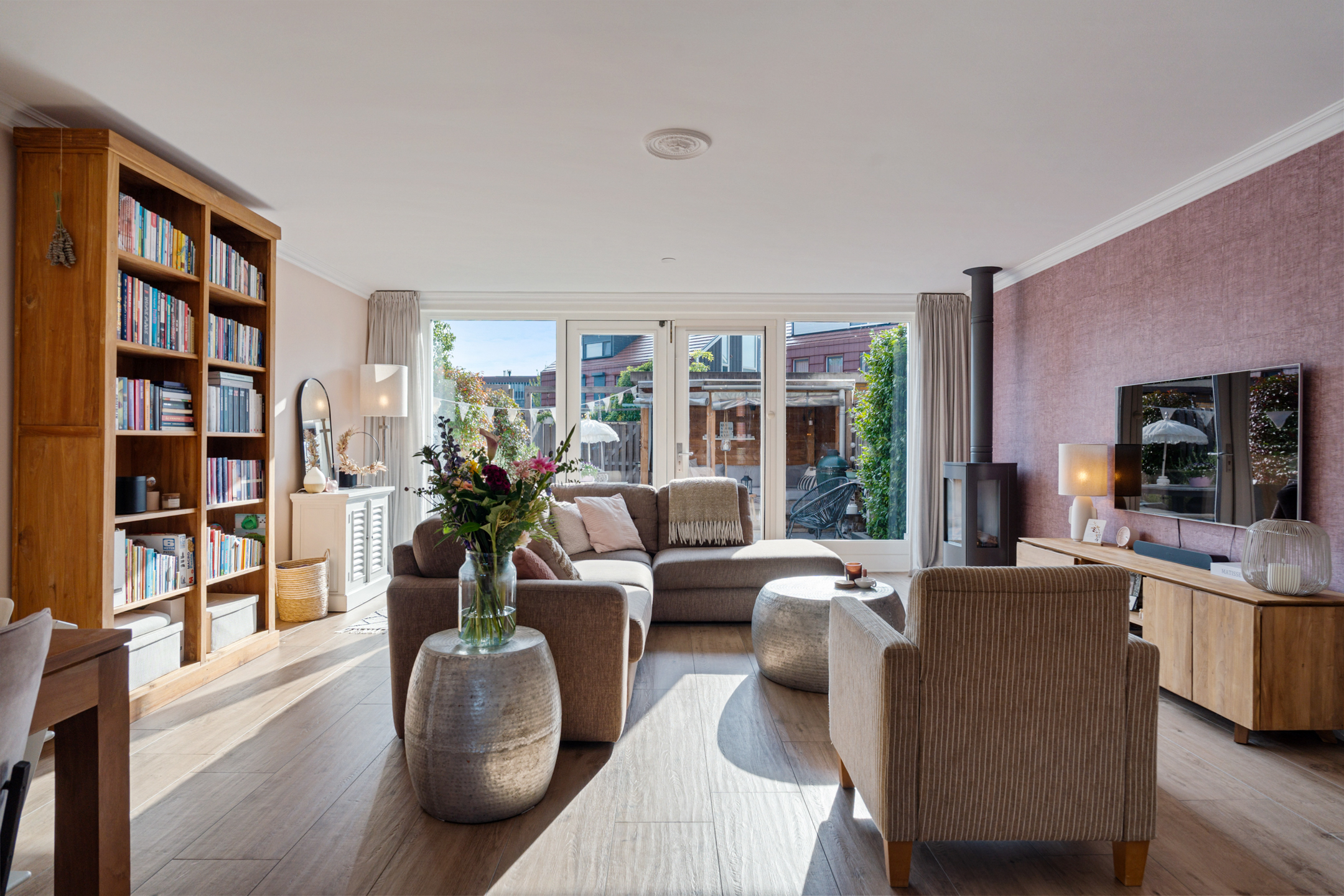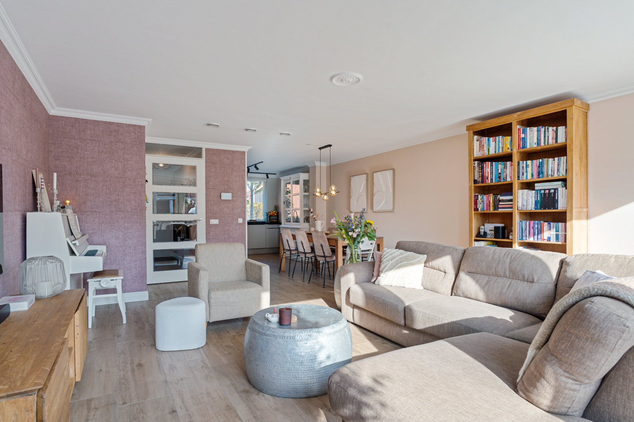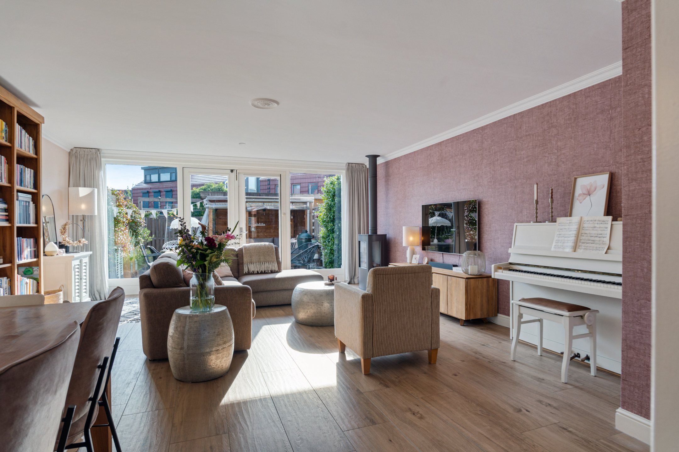 Via de nette voortuin stap je binnen in de hal met modern toilet (wandcloset), meterkast en toegang tot de woonkamer. De tuingerichte living is heerlijk licht door de grote raampartijen en openslaande deuren naar de achtertuin. De moderne plavuizenvloer met vloerverwarming, sfeervolle gashaard en de gladde wandafwerking zorgen voor een moderne uitstraling en een comfortabel woonklimaat.