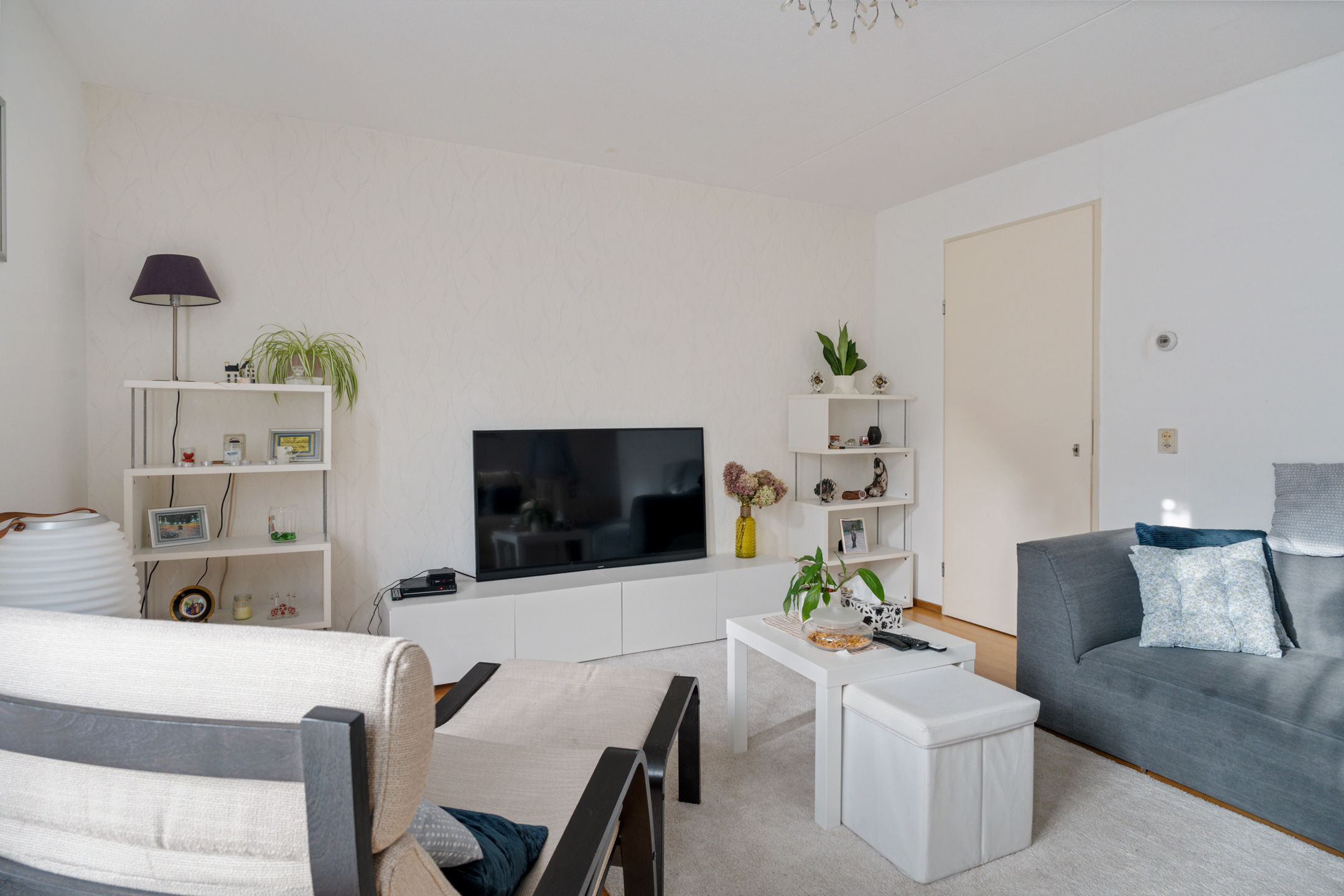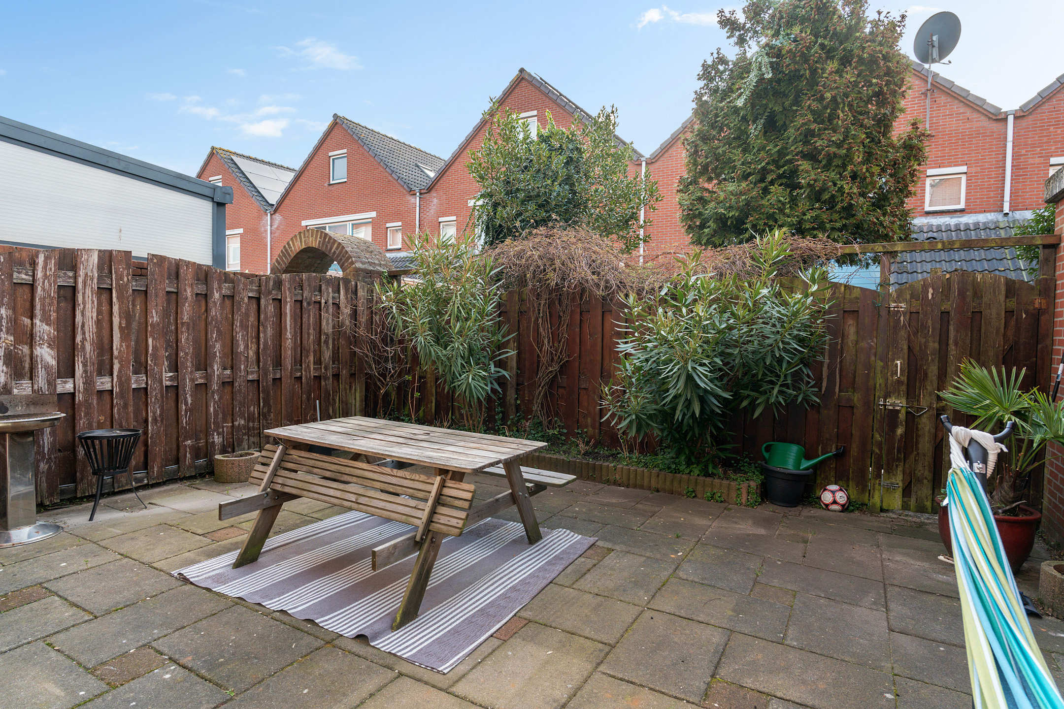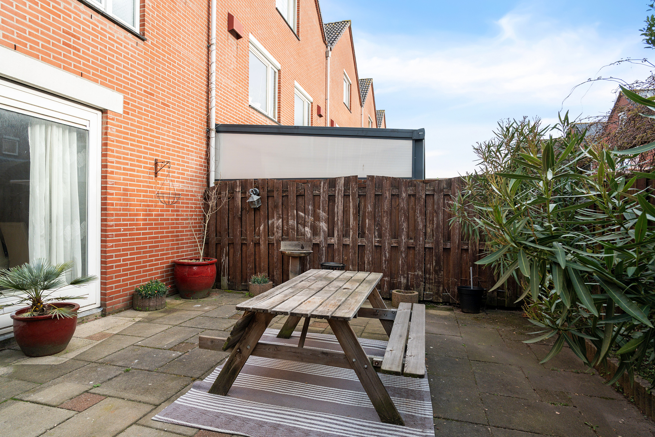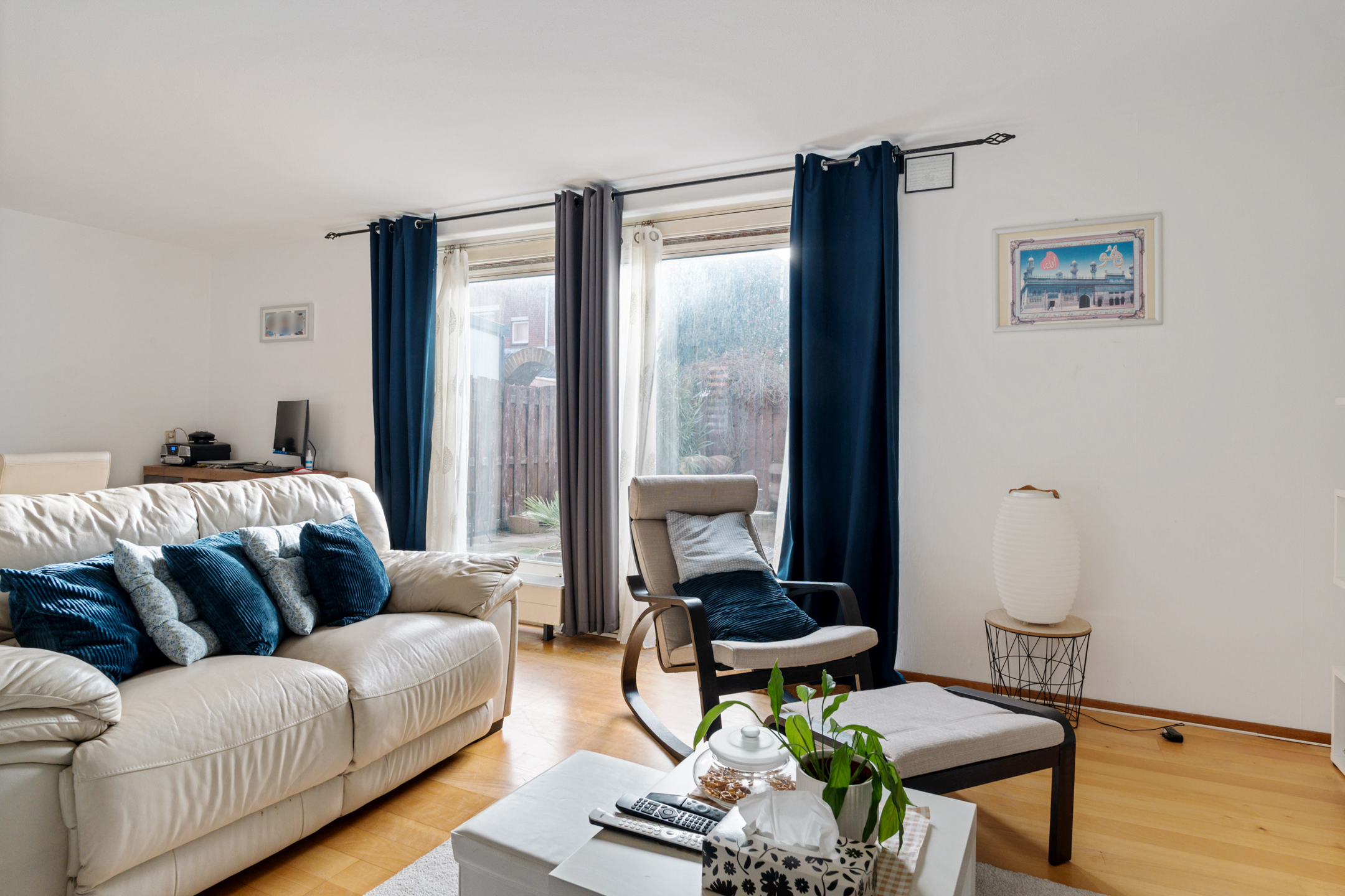 De woonkamer geeft toegang tot een diepe trap-/voorraadkast en tot de achtertuin op het zuidoosten. In de tuin vind je een berging en een achterom.