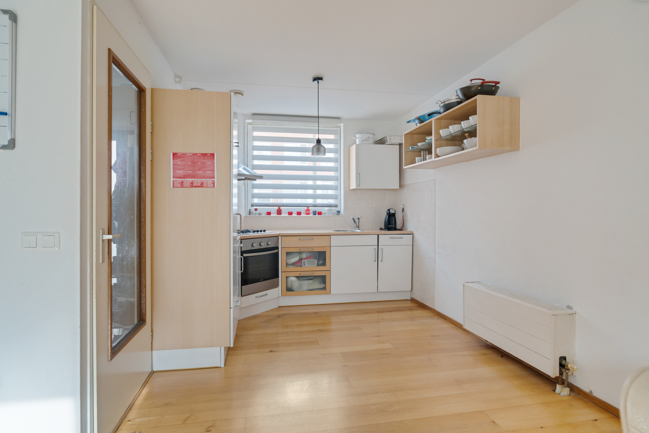 De royale woonkamer heeft een open keuken aan de voorzijde van de woning. De keuken is opgesteld in een hoekopstelling en voorzien van een gaskookplaat, oven, afzuigkap en koelkast.