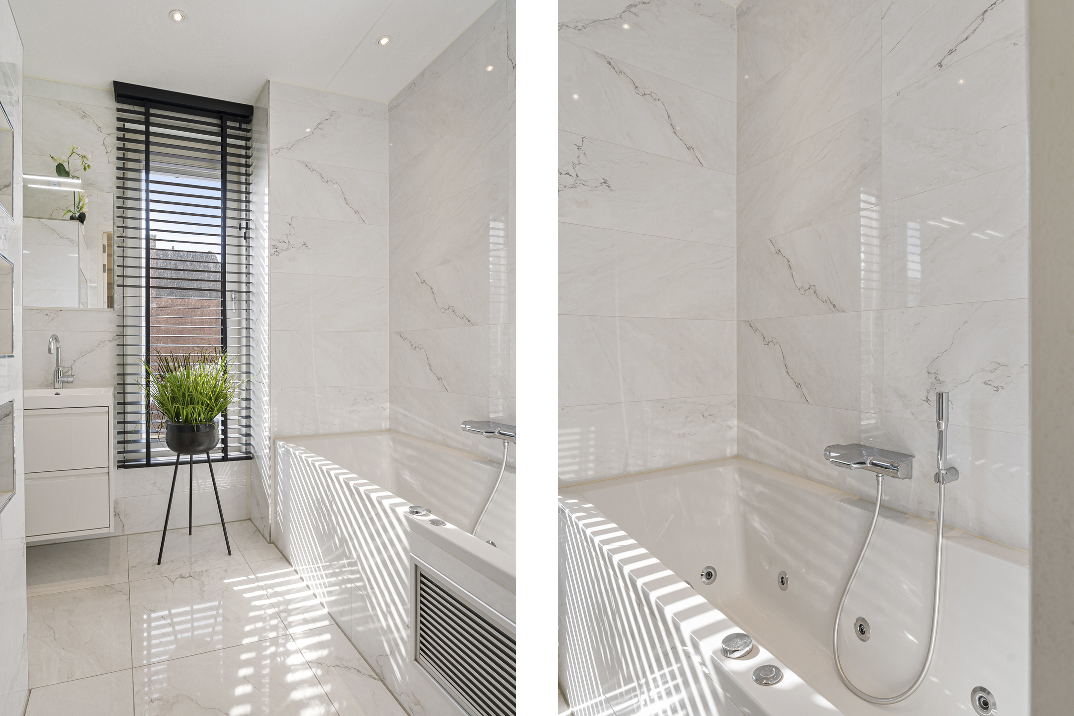 Centraal op de verdieping ligt de badkamer, uitgevoerd in een luxe en tijdloze stijl. De combinatie van grootformaat tegels, inbouwspots en een doordachte indeling zorgt voor een bijna wellnessachtige sfeer. De badkamer is voorzien van een ligbad met bubbelfunctie, een ruime inloopdouche, een dubbel wastafelmeubel en een raam voor natuurlijke ventilatie en daglicht. Een plek waar comfort en ontspanning moeiteloos samenkomen.