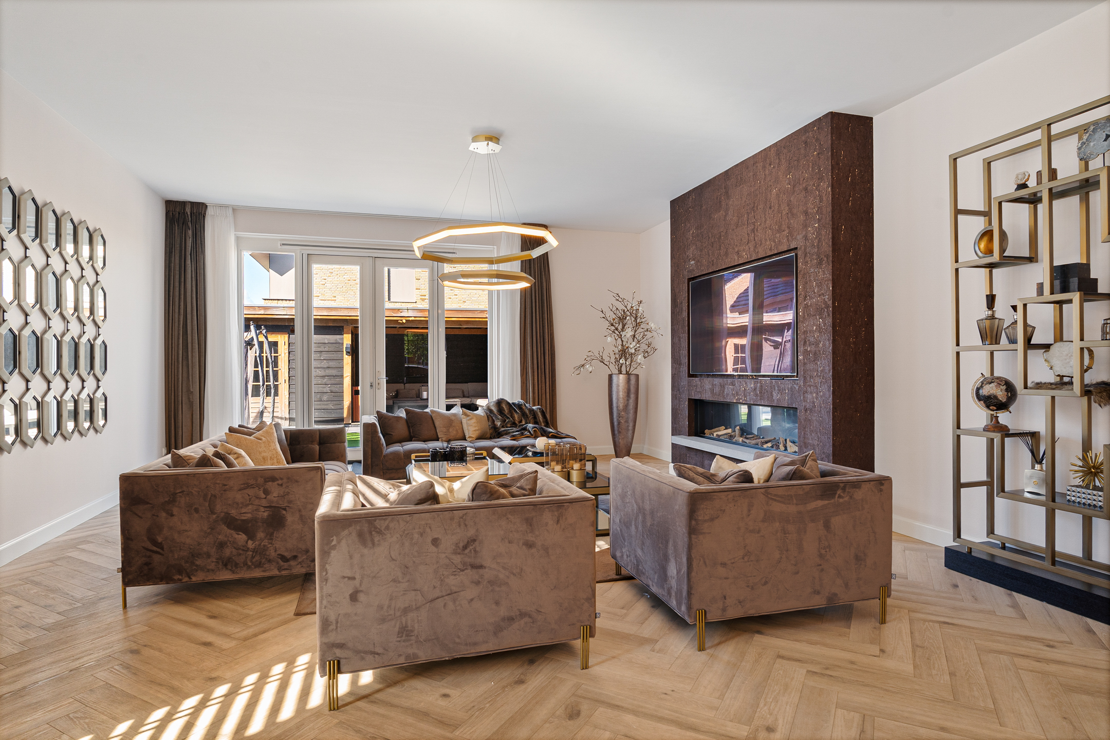 Aan de achterzijde ligt de sfeervolle woonkamer, waar rust en comfort centraal staan. De visgraatvloer, de stijlvolle cinewall met sfeerhaard en het zijraam zorgen voor een warme en luxe uitstraling. De openslaande deuren verbinden binnen en buiten op een natuurlijke manier en geven toegang tot de tuin.