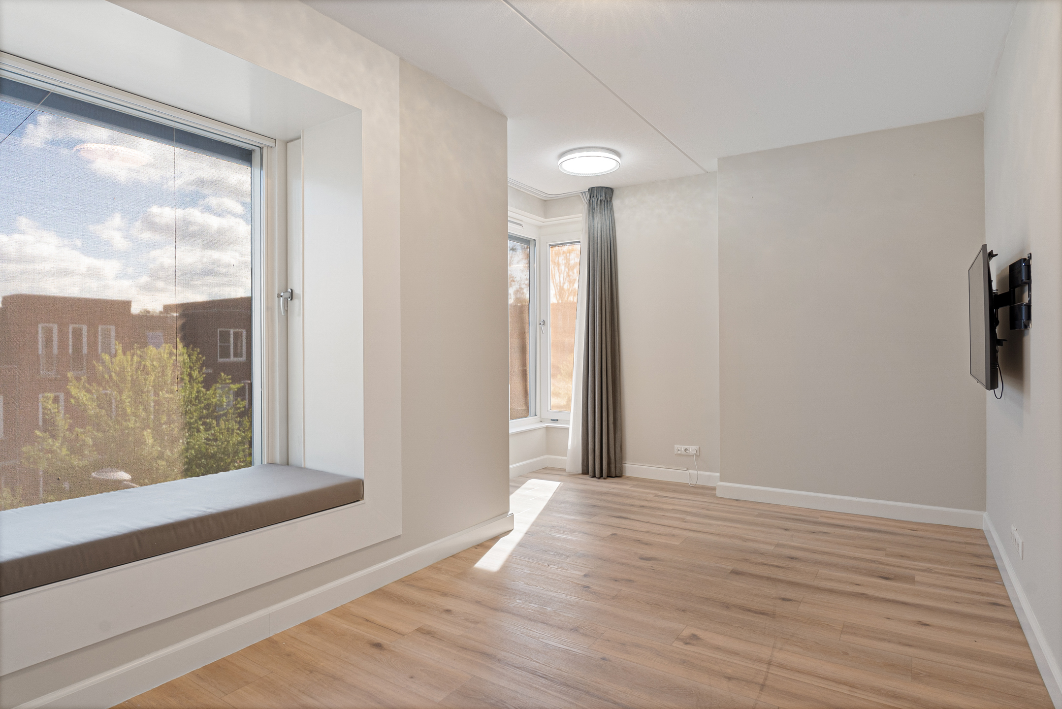 Aan de voorzijde bevindt zich de tweede slaapkamer. Dankzij de speelse indeling en de karakteristieke hoek is dit geen standaard ruimte, maar juist een kamer met mogelijkheden. Ideaal als slaapkamer, werkkamer of bijvoorbeeld luxe kleedruimte. De kamer beschikt over een eigen balkon, bereikbaar via openslaande deuren. Dit is een fijne plek om de dag rustig te beginnen of juist af te sluiten. Ook hier is de temperatuur individueel regelbaar via de vloerverwarming.