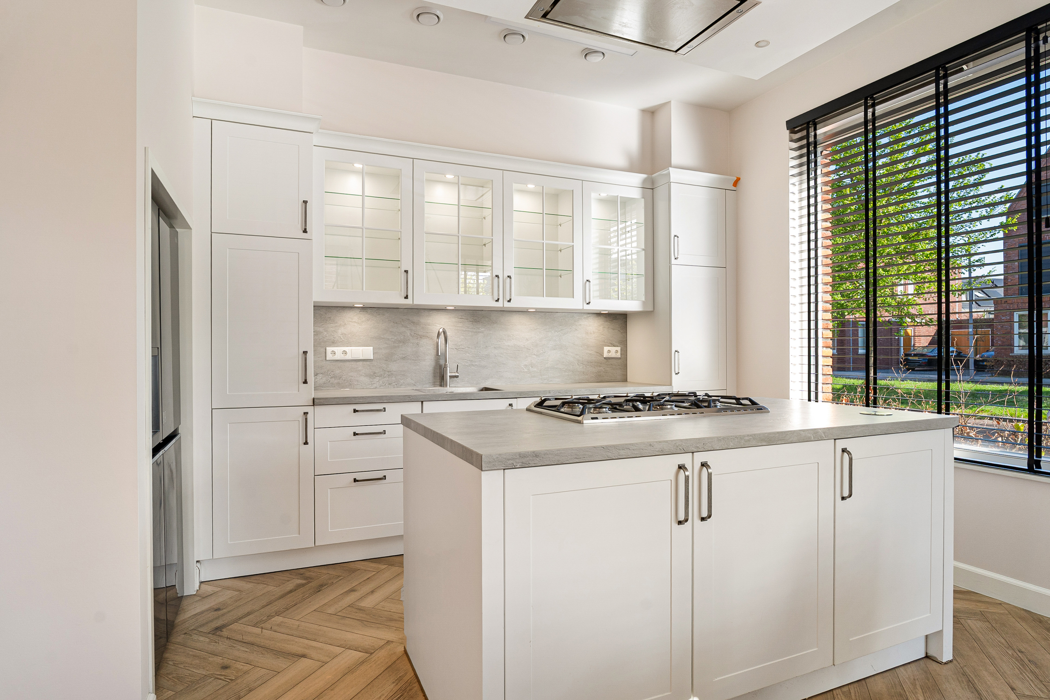 Aan de voorzijde bevindt zich de royale woonkeuken, een plek waar koken en samenzijn moeiteloos samenkomen. Het kookeiland met 5-pits gasfornuis vormt het hart van de ruimte en wordt aangevuld met luxe apparatuur, waaronder twee Smeg-ovens, een bordenwarmer, vaatwasser, Quooker met groot boilervat en een ruime koel-/vriescombinatie. De vele kastruimte en de mogelijkheid voor een grote eettafel maken dit tot een volwaardige leefkeuken. Dankzij de ramen aan twee zijden is de ruimte bovendien heerlijk licht.