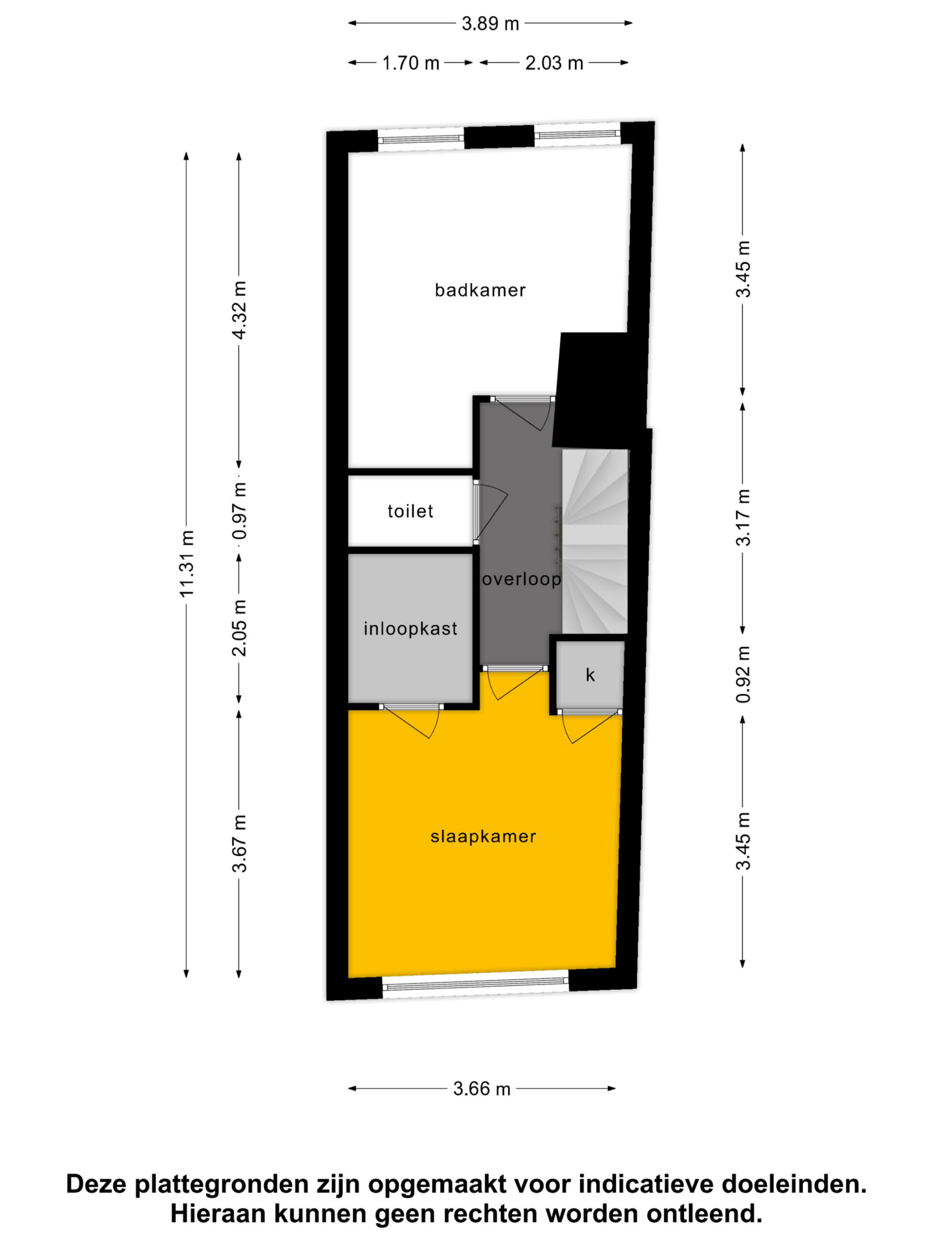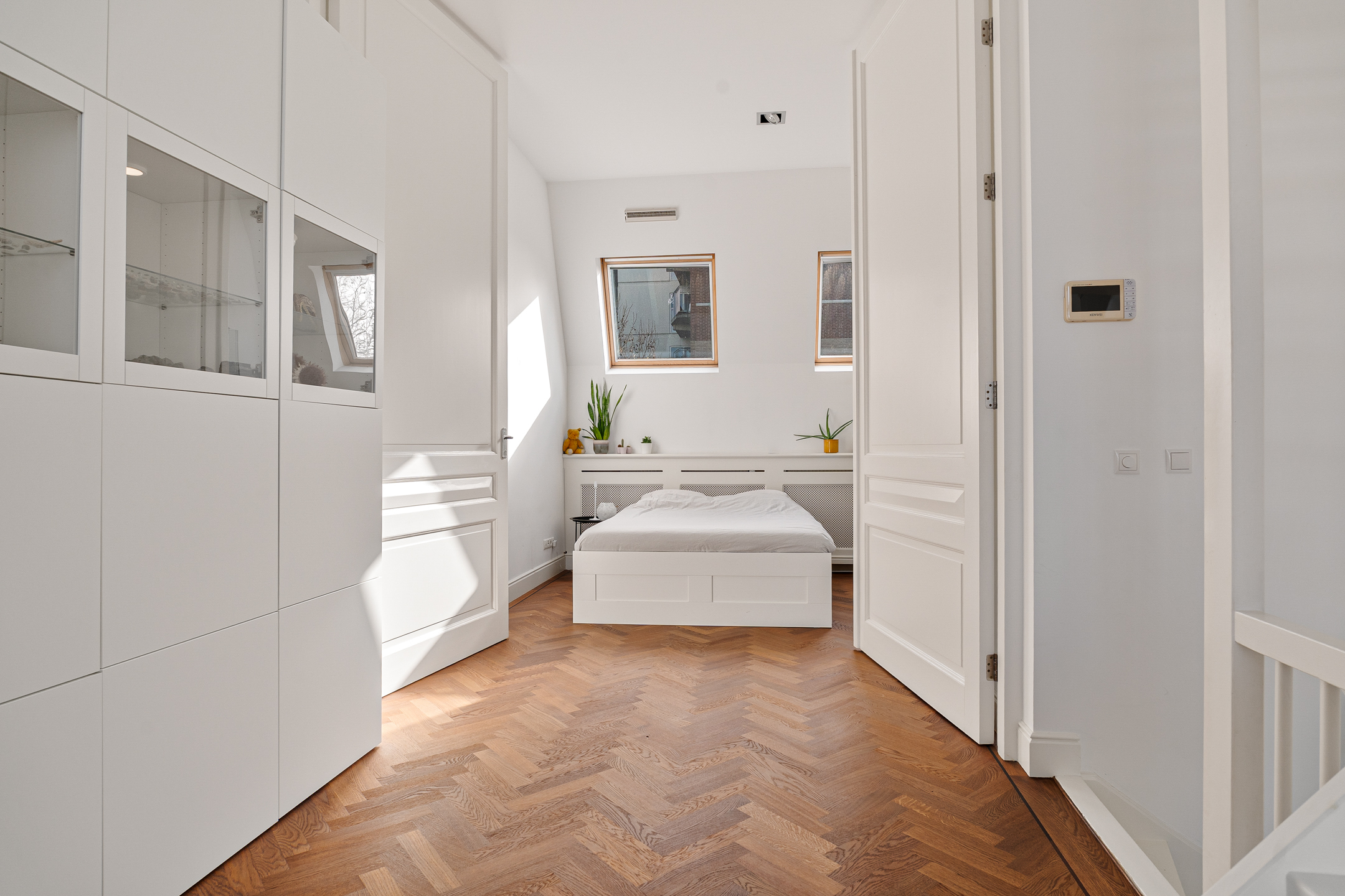De ruime slaapkamer op de eerste verdieping beschikt over een inloopgarderobekast en een vaste kast met opstelplaats voor de wasmachine en droger.