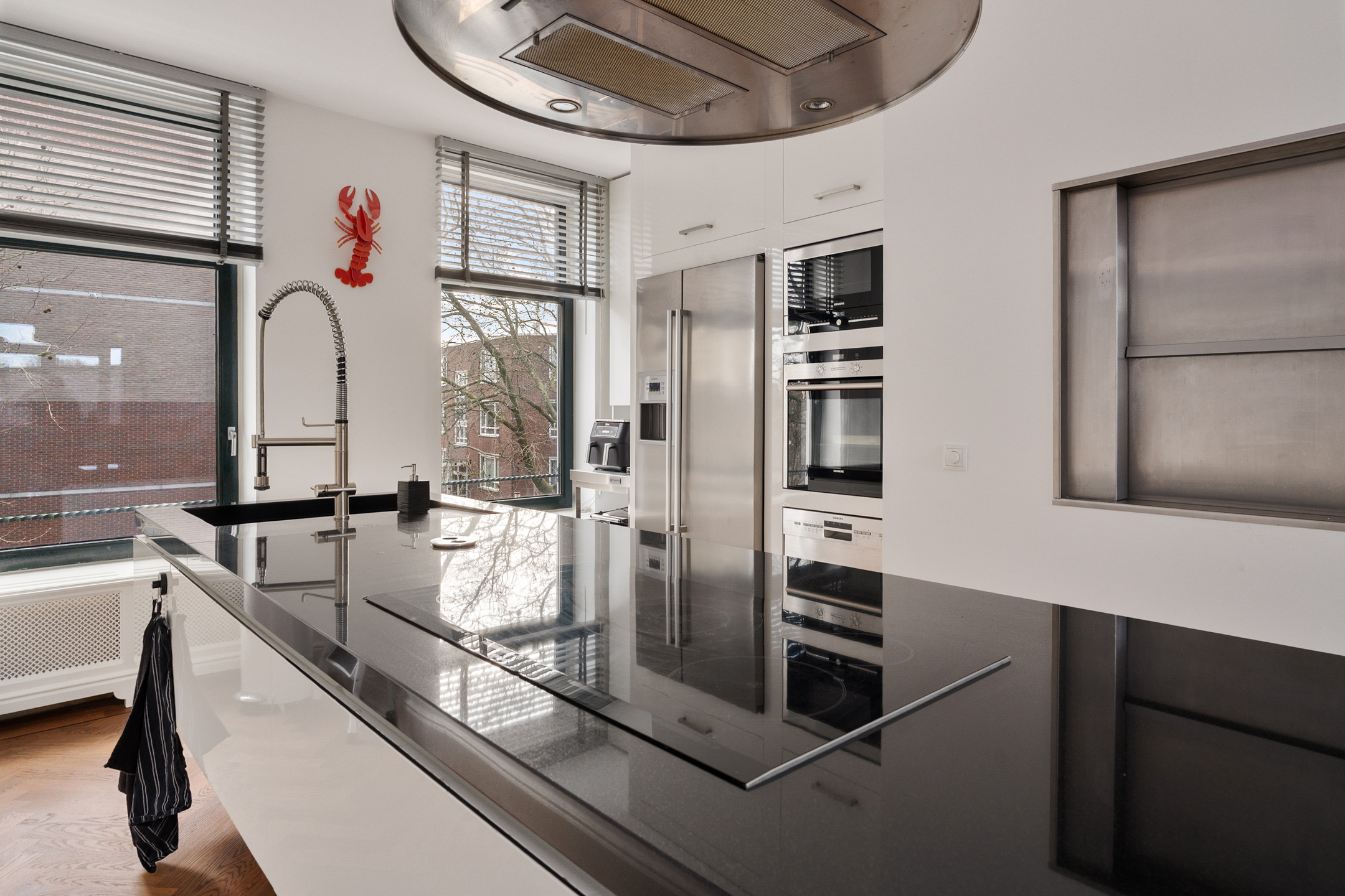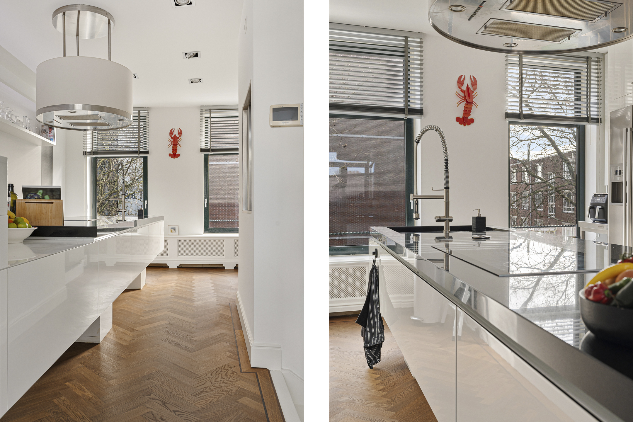 Op de tweede verdieping vallen direct de hoge raampartijen en de woonkeuken met een op maat gemaakt kookeiland op. De keuken kan worden ingeschoven om extra ruimte te creëren, ideaal voor feestelijke gelegenheden.