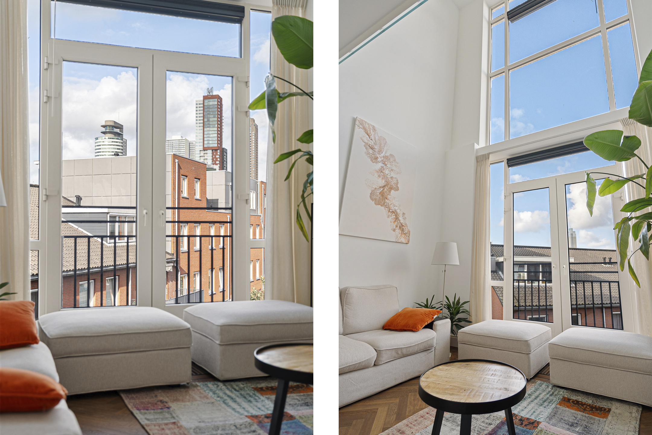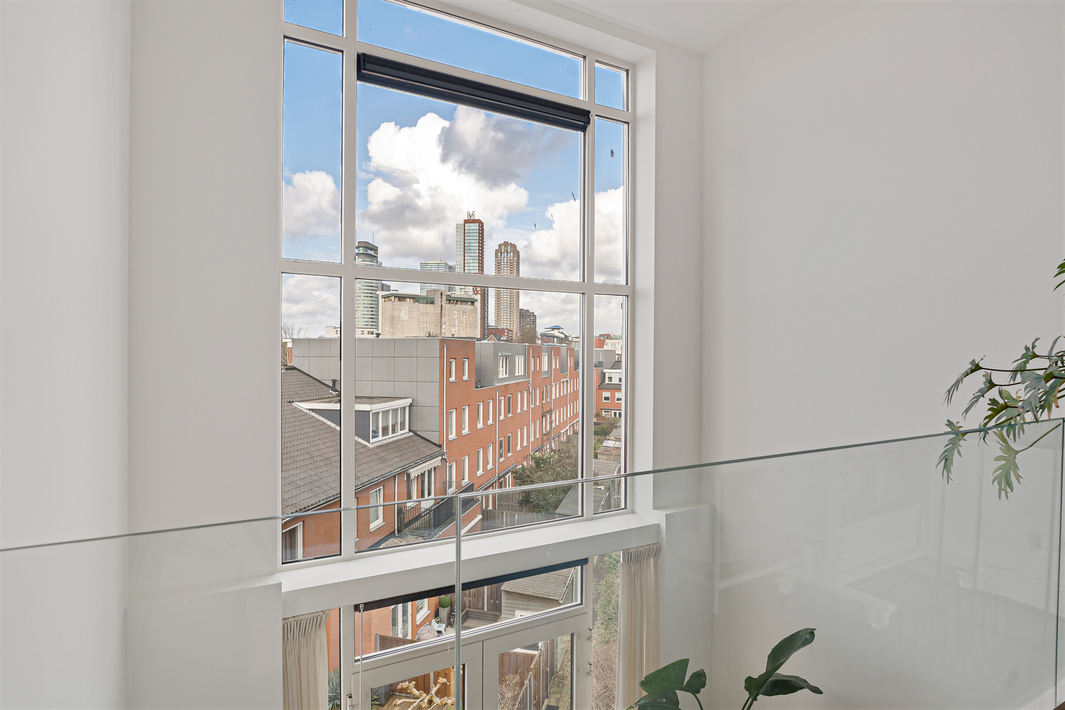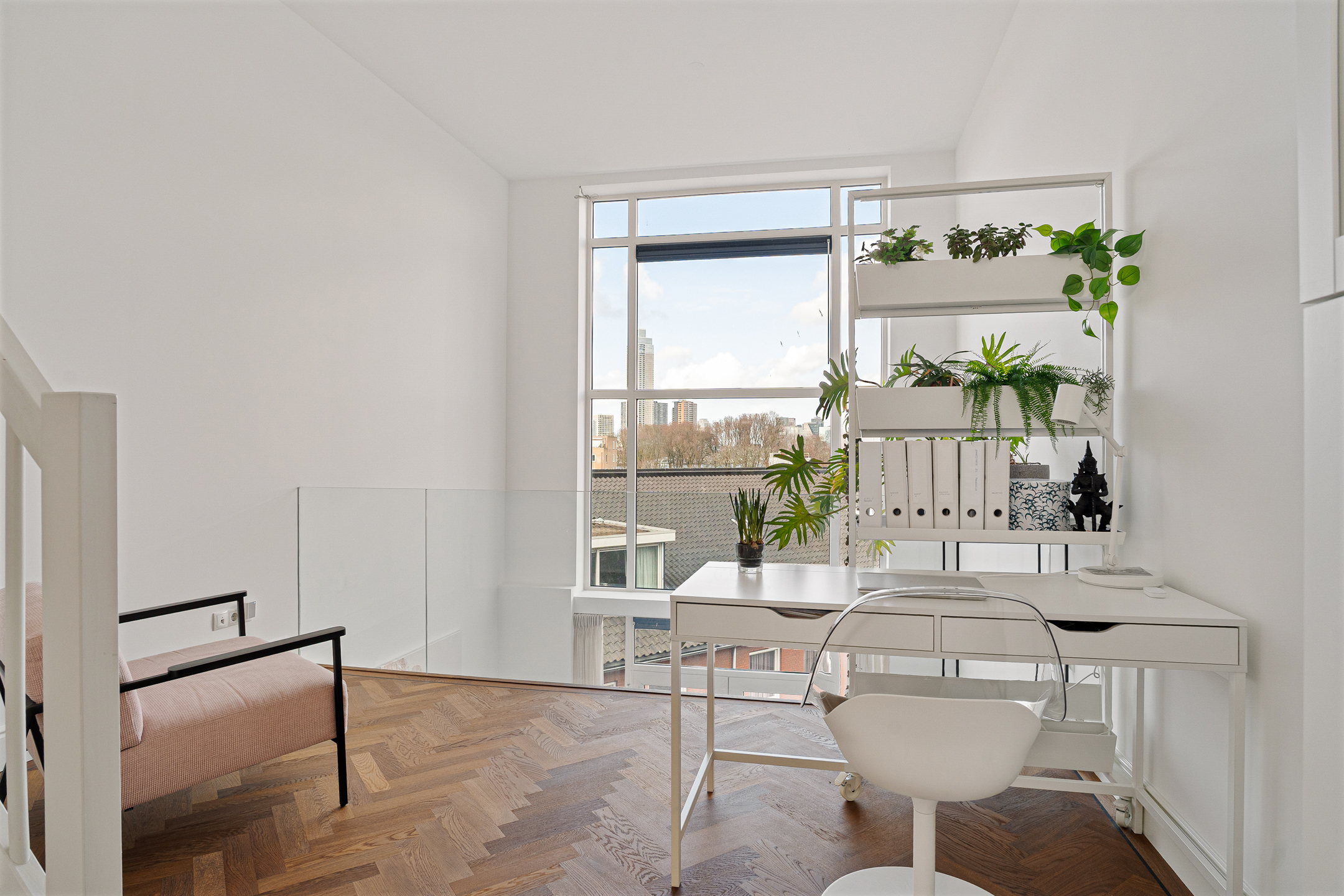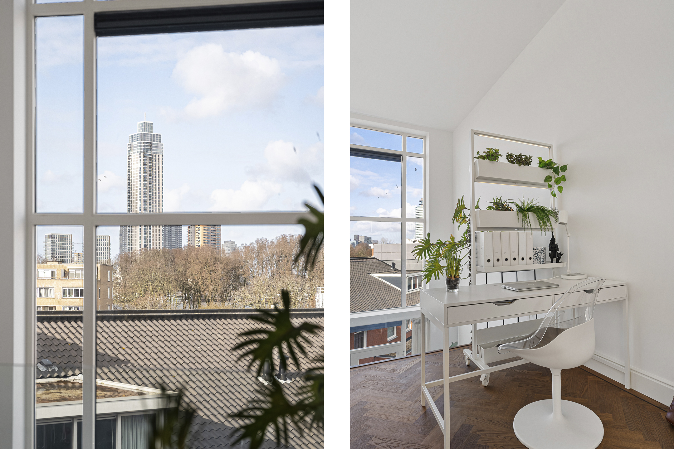 De werkhoek en het zitje bieden uitzicht op de tuien van de Erasmusbrug en de Zalmhaventoren. Twee grote openslaande deuren leiden naar de logeerkamer met douche en wastafel. Het is mogelijk om deze brede en hoge deuren volledig tegen de wand te openen, waardoor er één grote open ruimte ontstaat. Zelfs vanuit bed geniet je hier van een panoramisch uitzicht over Rotterdam.