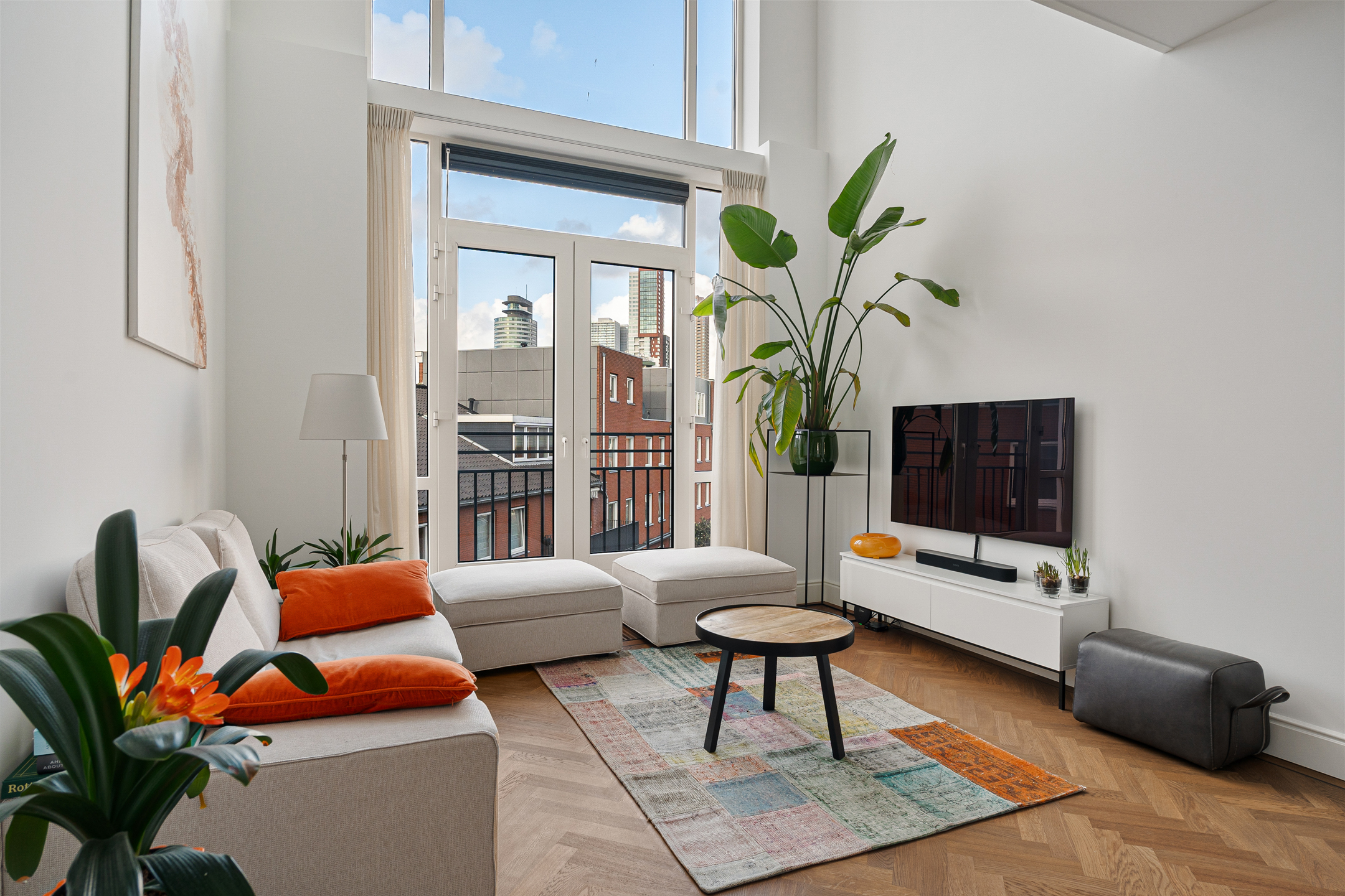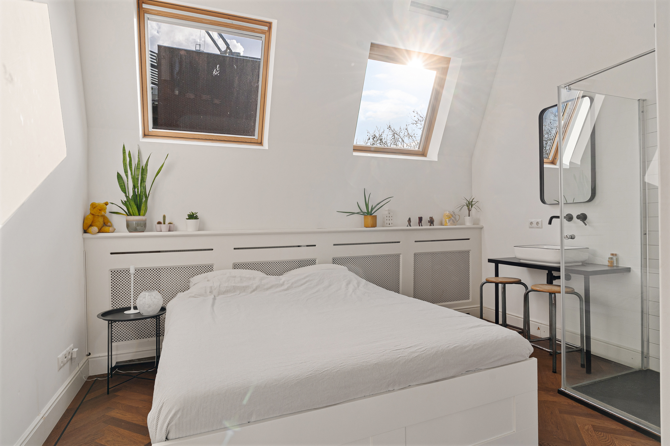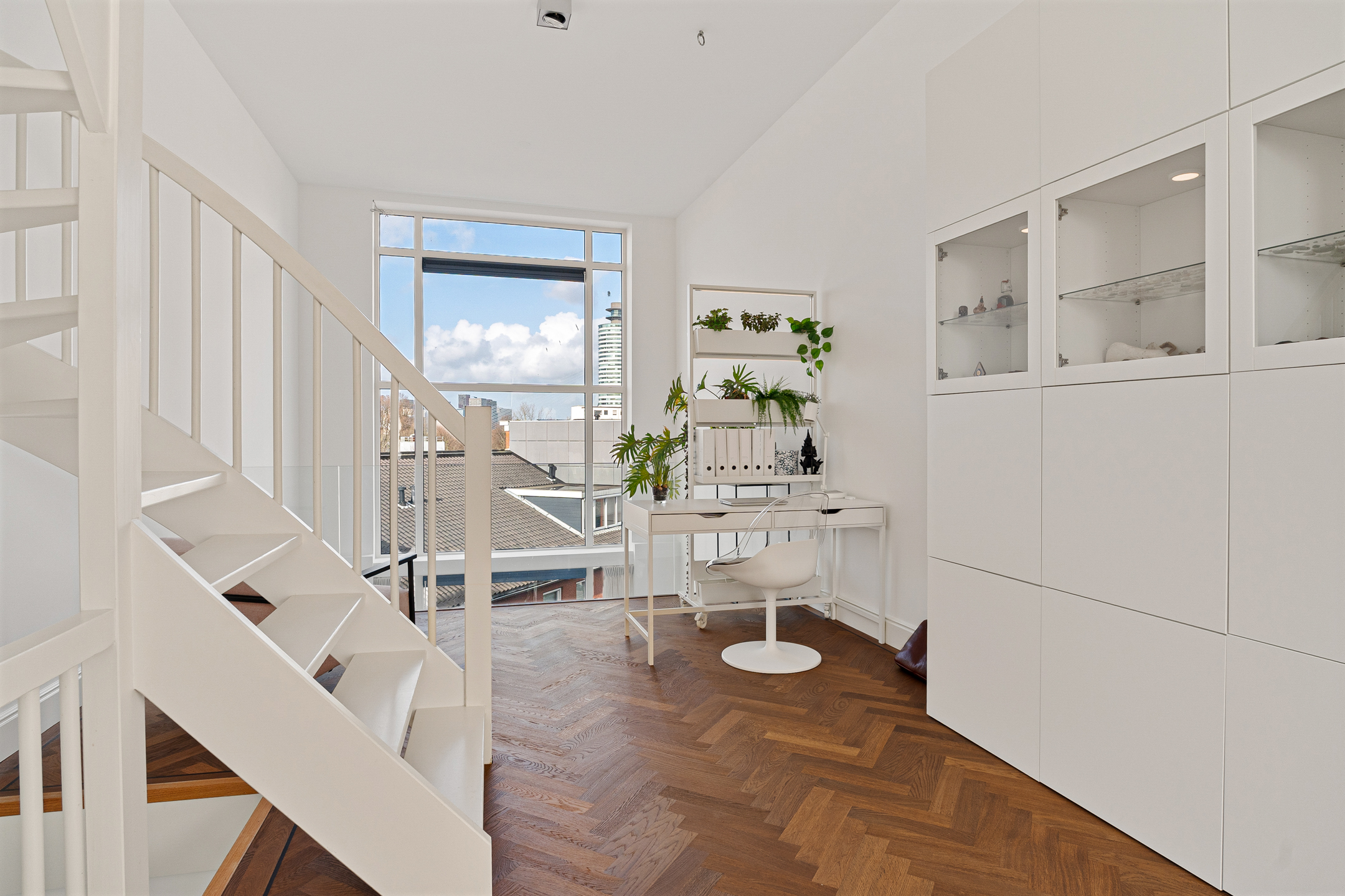 De werkhoek en het zitje bieden uitzicht op de tuien van de Erasmusbrug en de Zalmhaventoren. Twee grote openslaande deuren leiden naar de logeerkamer met douche en wastafel. Het is mogelijk om deze brede en hoge deuren volledig tegen de wand te openen, waardoor er één grote open ruimte ontstaat. Zelfs vanuit bed geniet je hier van een panoramisch uitzicht over Rotterdam.