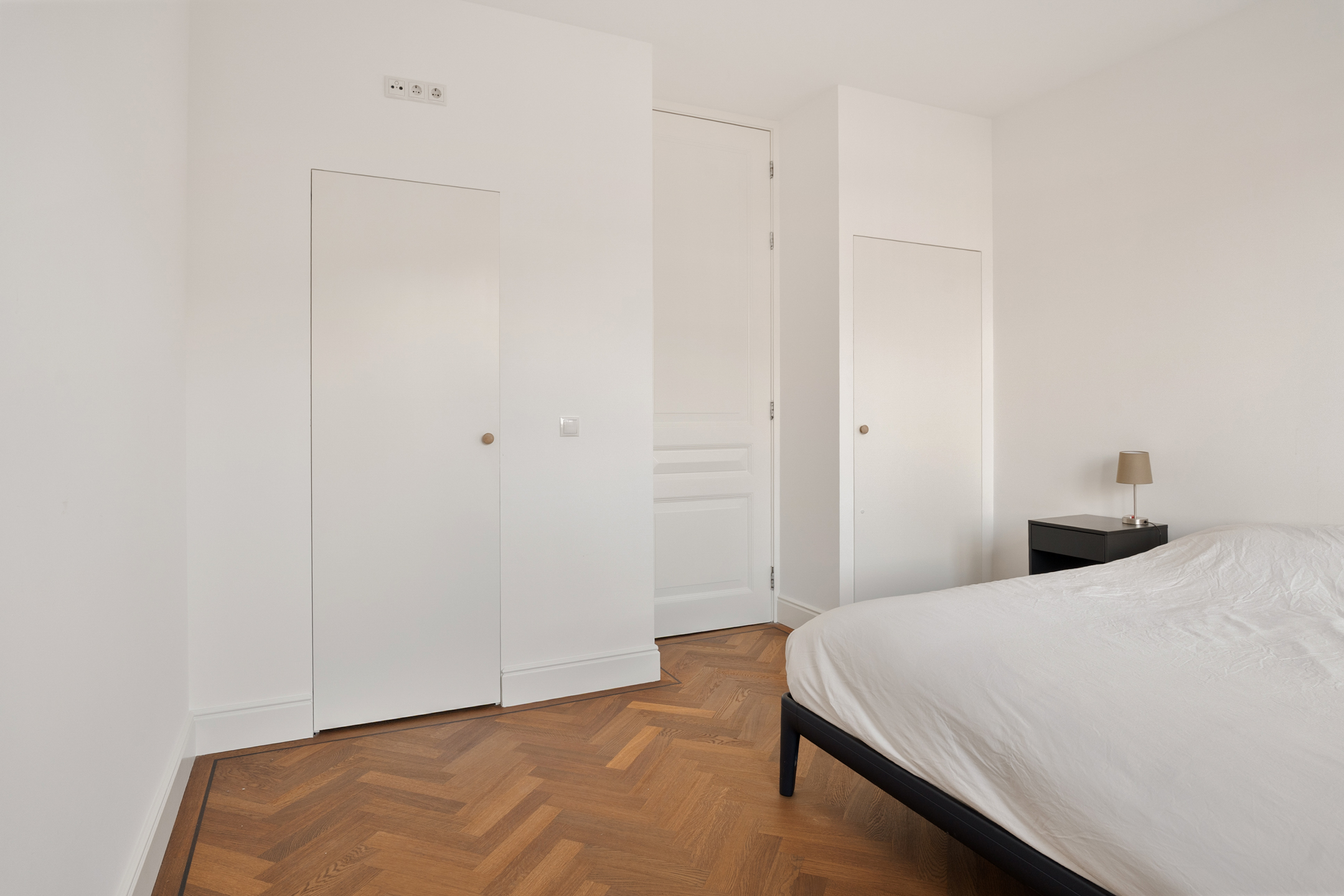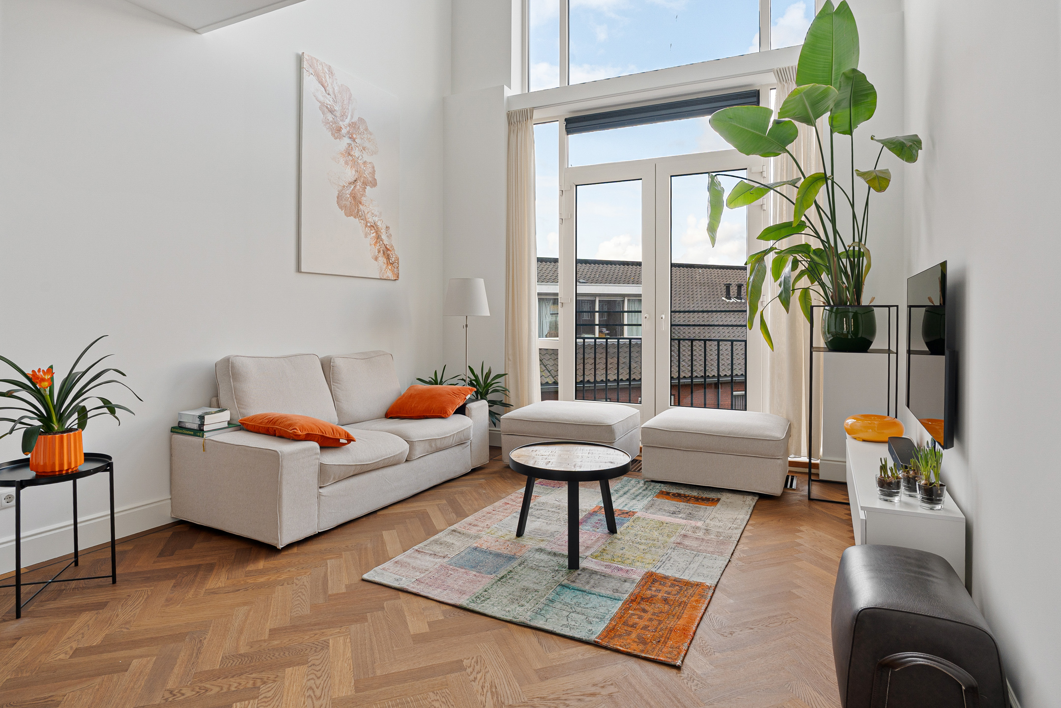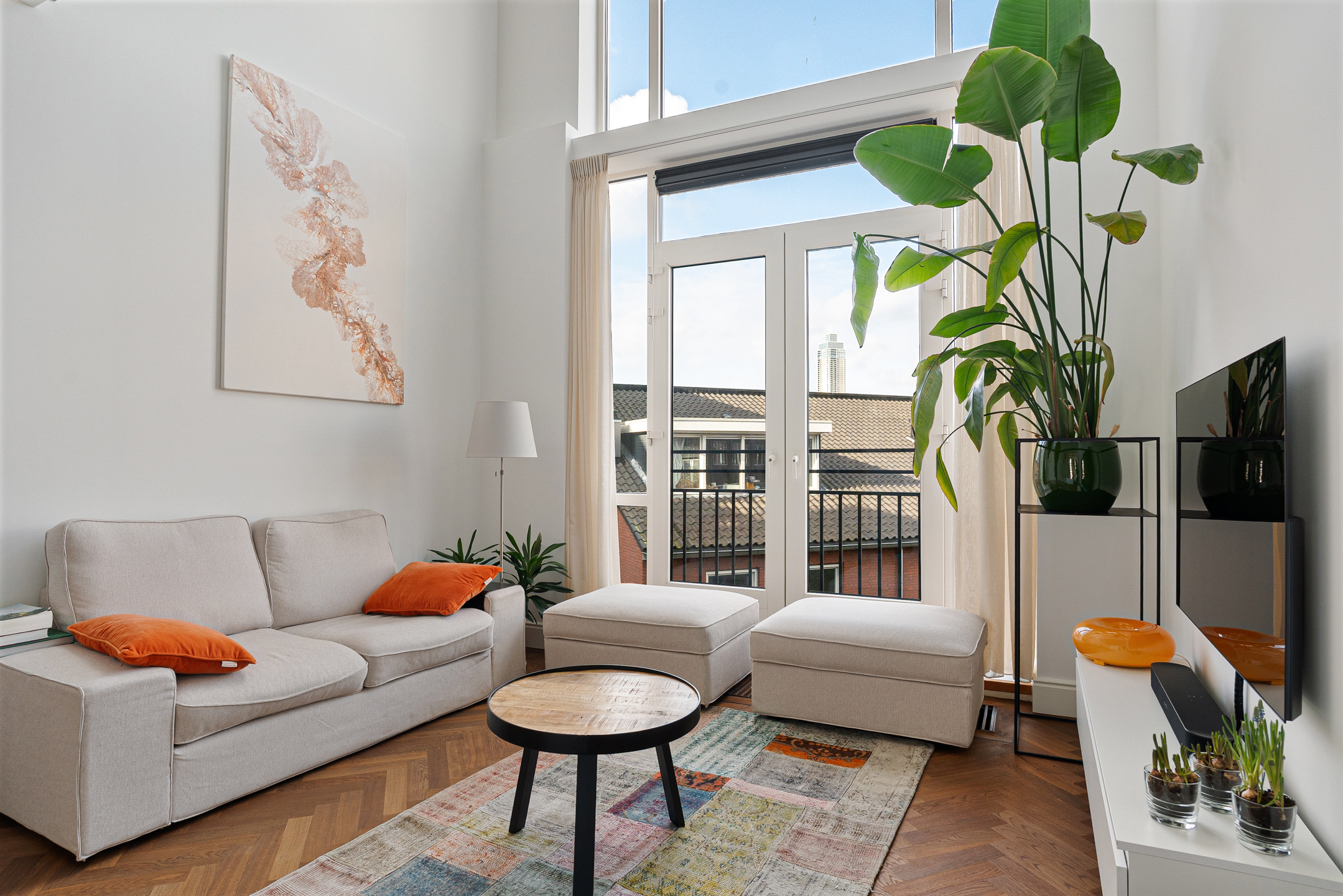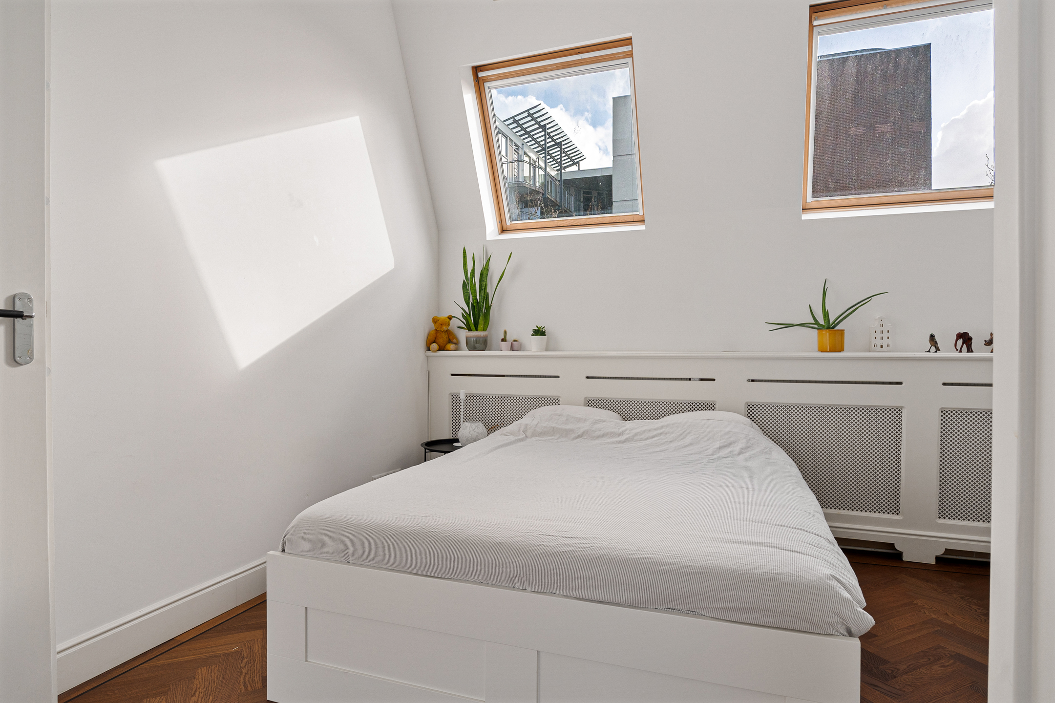 De werkhoek en het zitje bieden uitzicht op de tuien van de Erasmusbrug en de Zalmhaventoren. Twee grote openslaande deuren leiden naar de logeerkamer met douche en wastafel. Het is mogelijk om deze brede en hoge deuren volledig tegen de wand te openen, waardoor er één grote open ruimte ontstaat. Zelfs vanuit bed geniet je hier van een panoramisch uitzicht over Rotterdam.