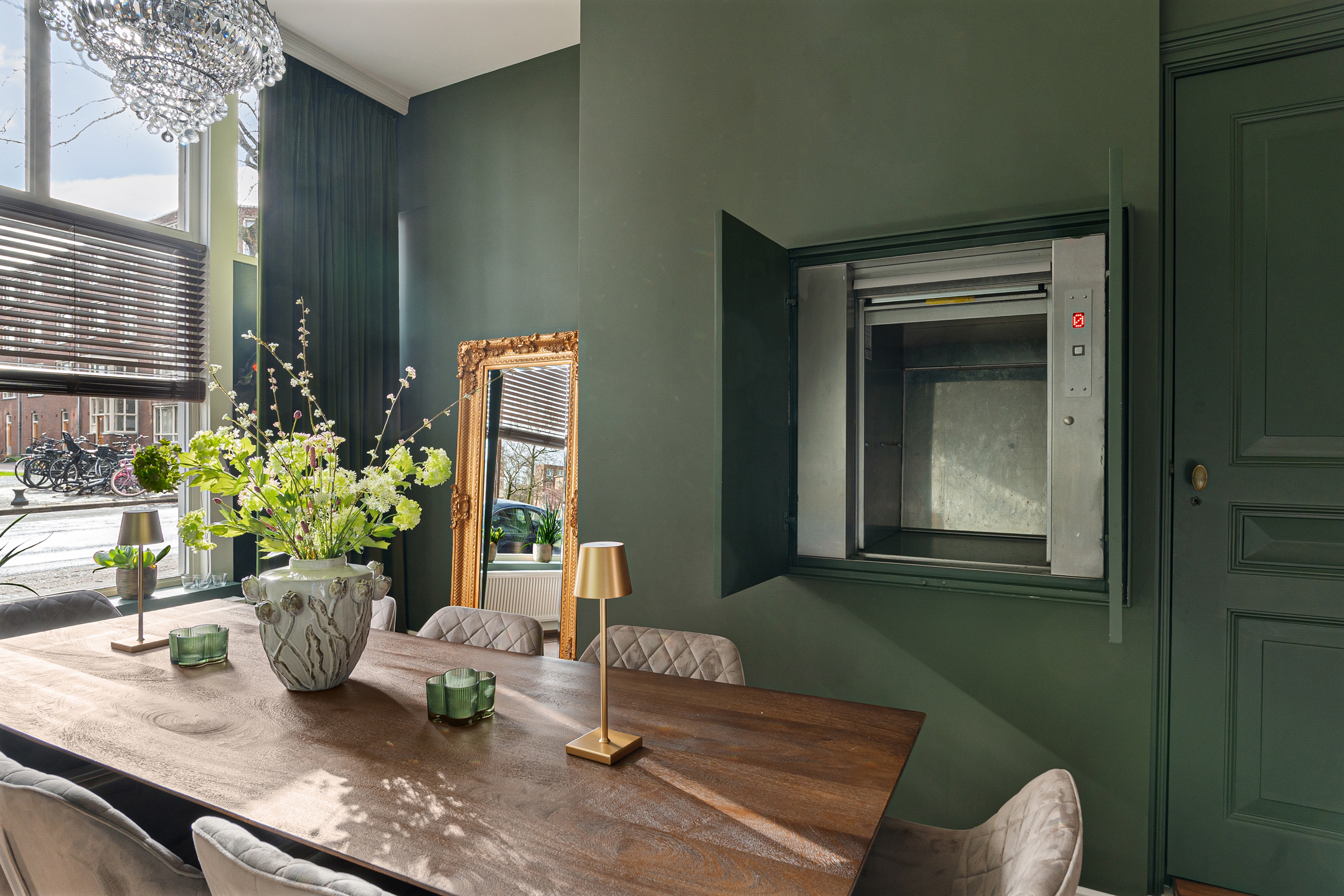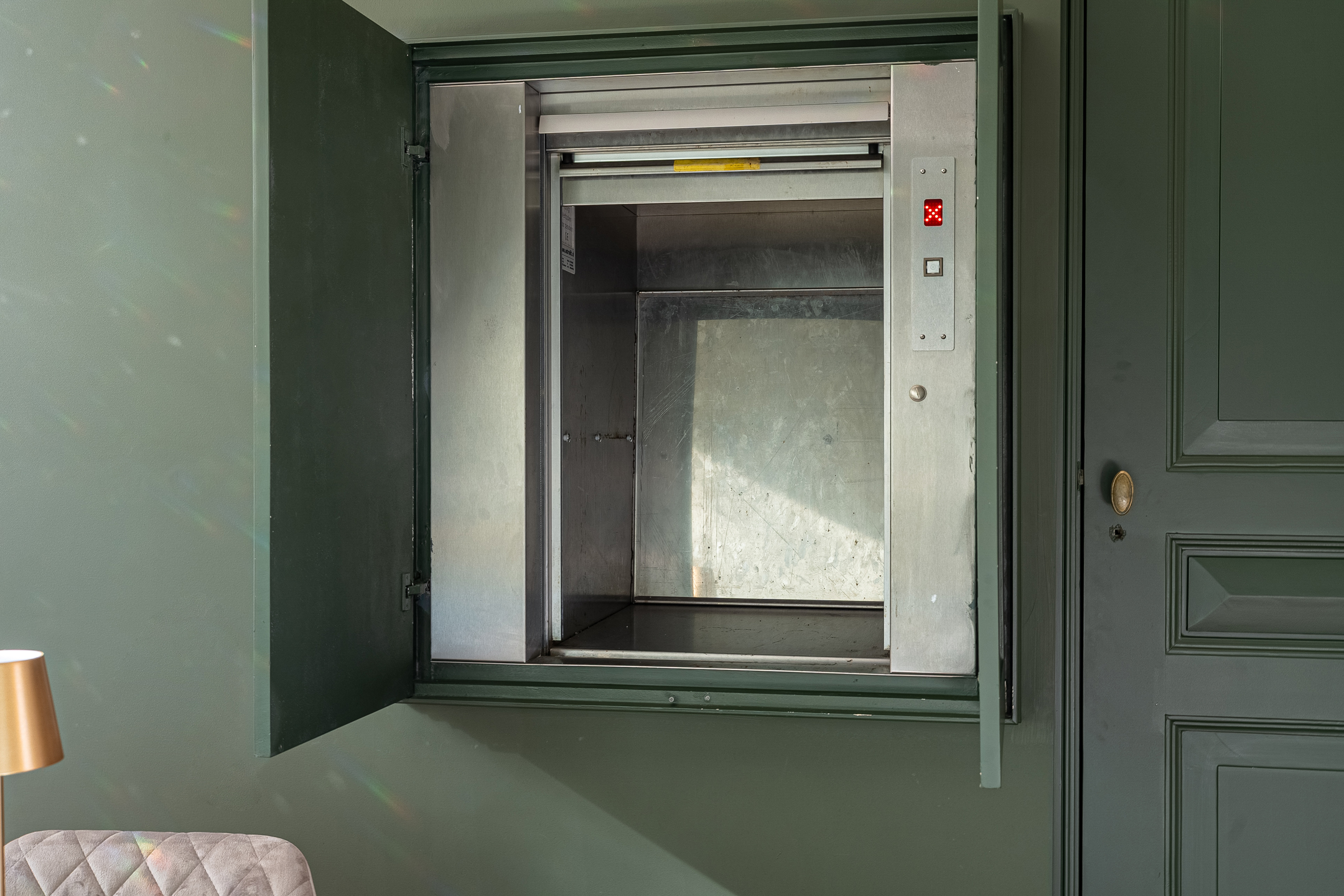 Bijzonder praktisch (en uniek) is de ruime goederenlift die vanuit de kamer naar de keuken op de tweede verdieping en het dakterras leidt. Zo hoef je geen boodschappen de trap op te dragen.