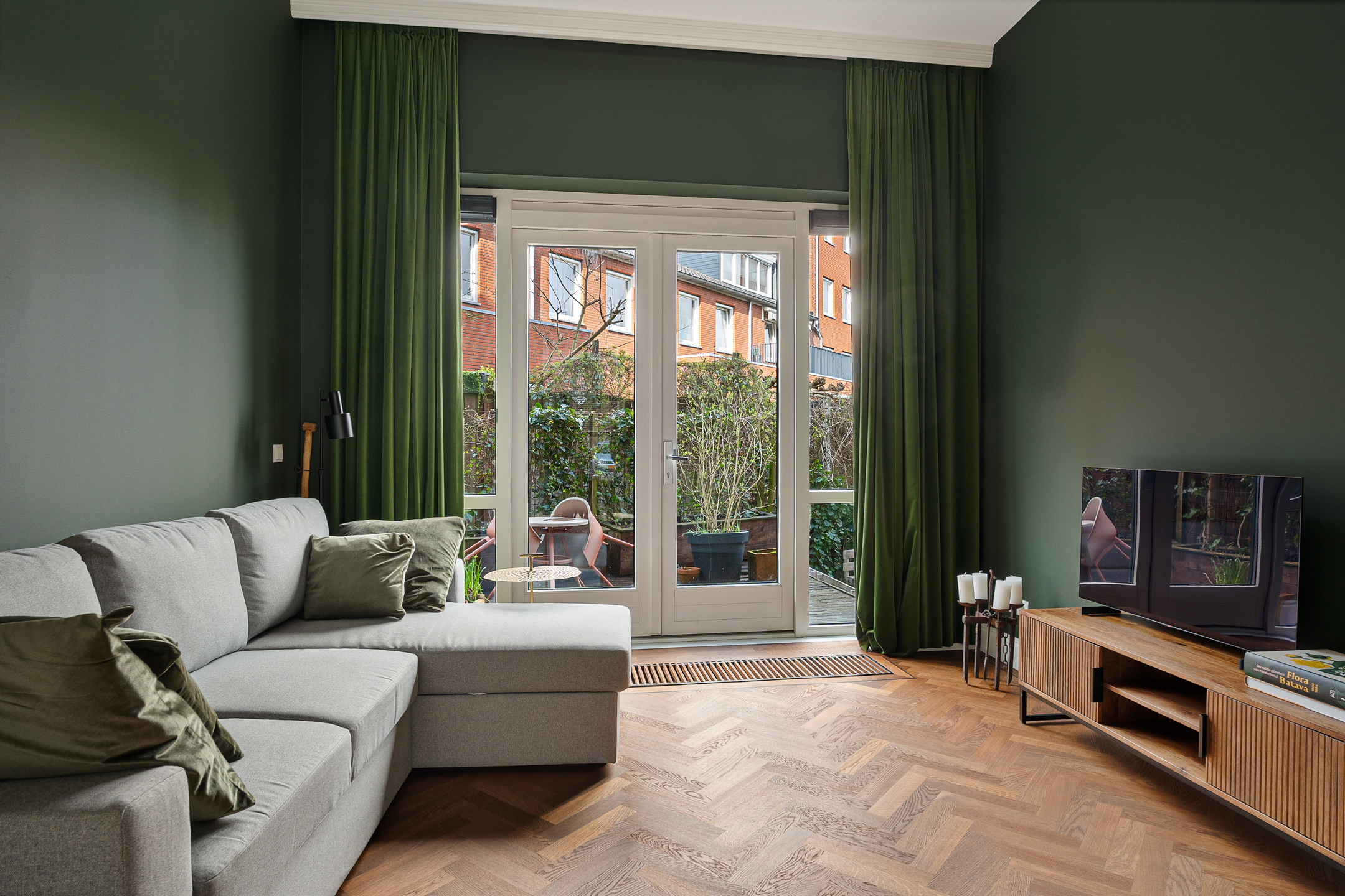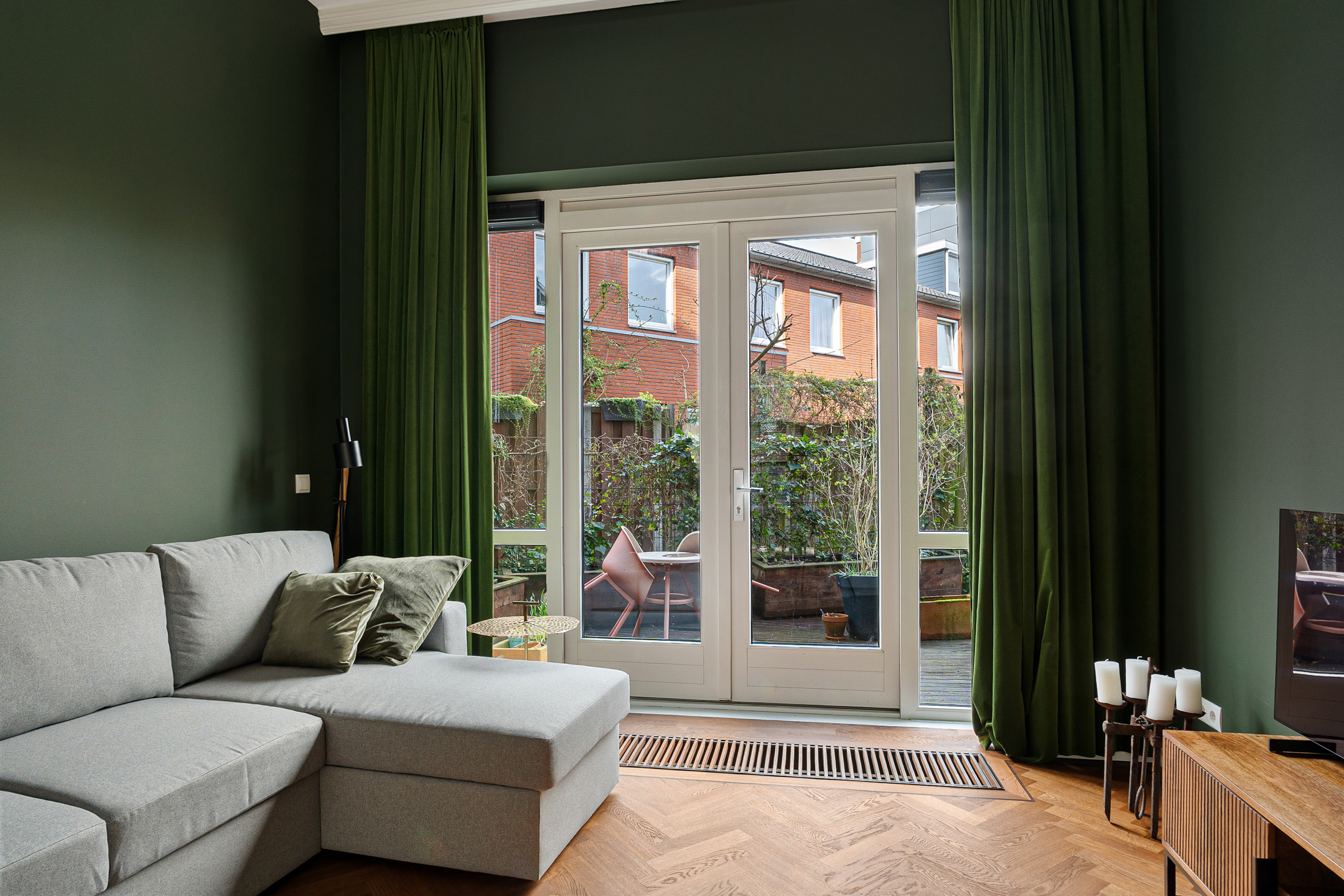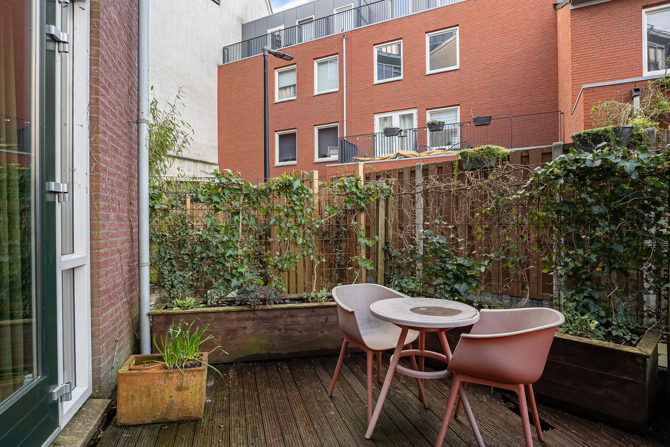 Aan de achterzijde ligt een terras waar je kunt genieten van de ochtendzon, met doorgang naar de gezellige gemeenschappelijke binnentuin. In de middag schijnt de zon aan de voorzijde van de woning. De woonkamers kunnen desgewenst moeiteloos worden ingericht als werkruimtes.