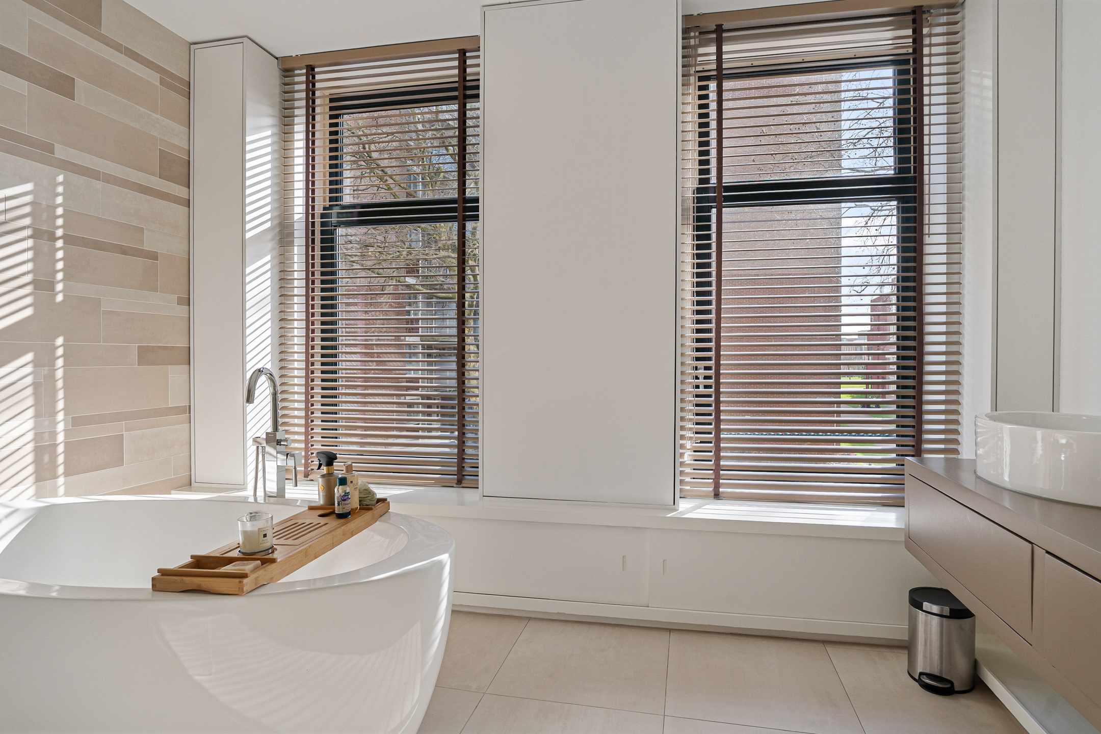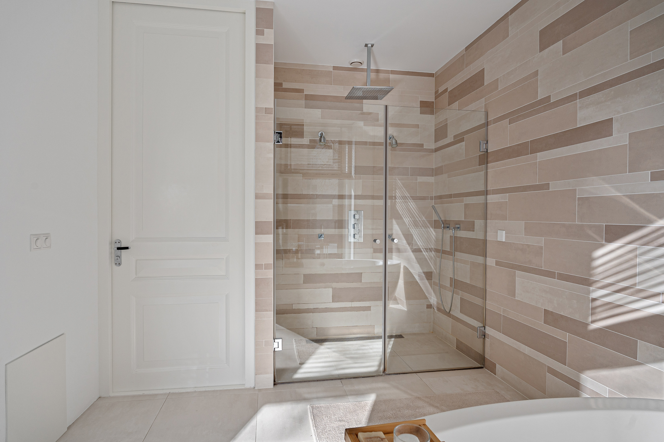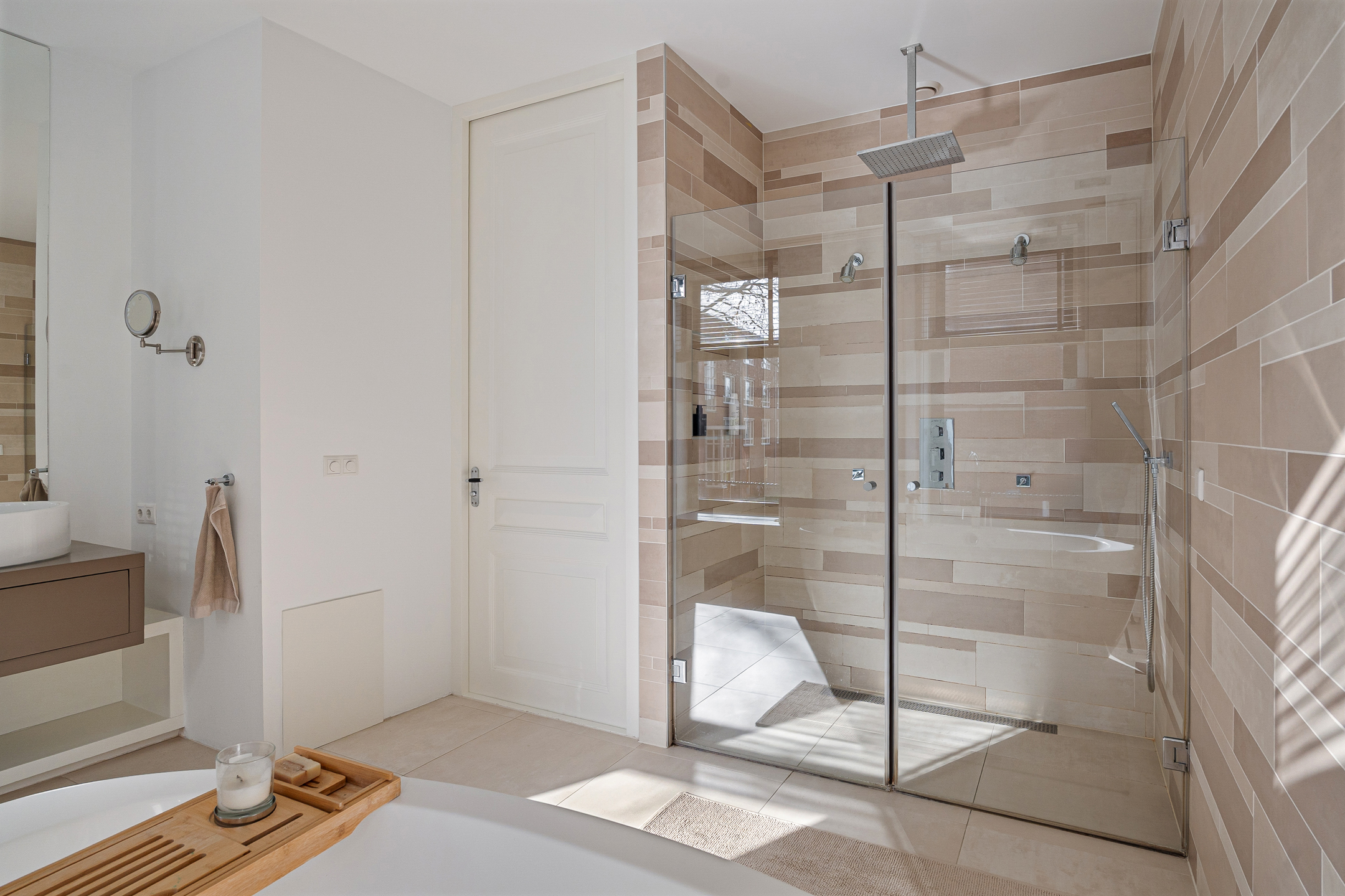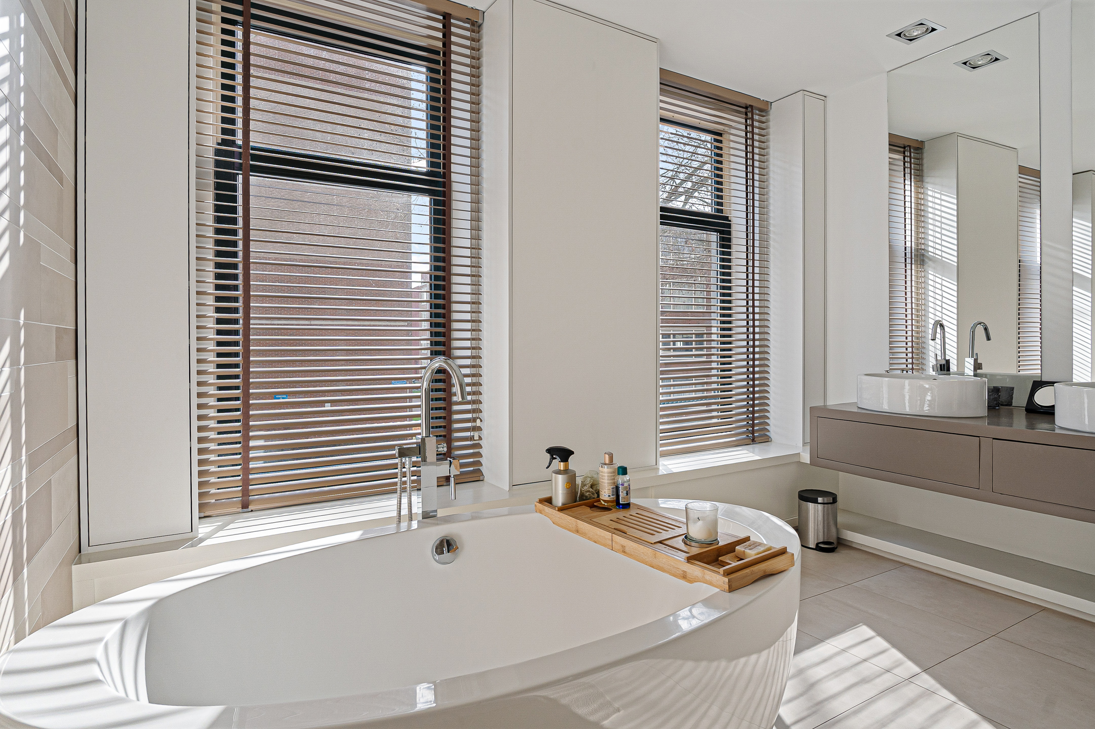 De werkelijk schitterende, riante badkamer is voorzien van een vrijstaand bad, een dubbel badkamermeubel en een inloopdouche met twee douchekoppen: een handdouche en een centrale regendouche. Op deze verdieping vind je daarnaast een separaat toilet op de overloop.