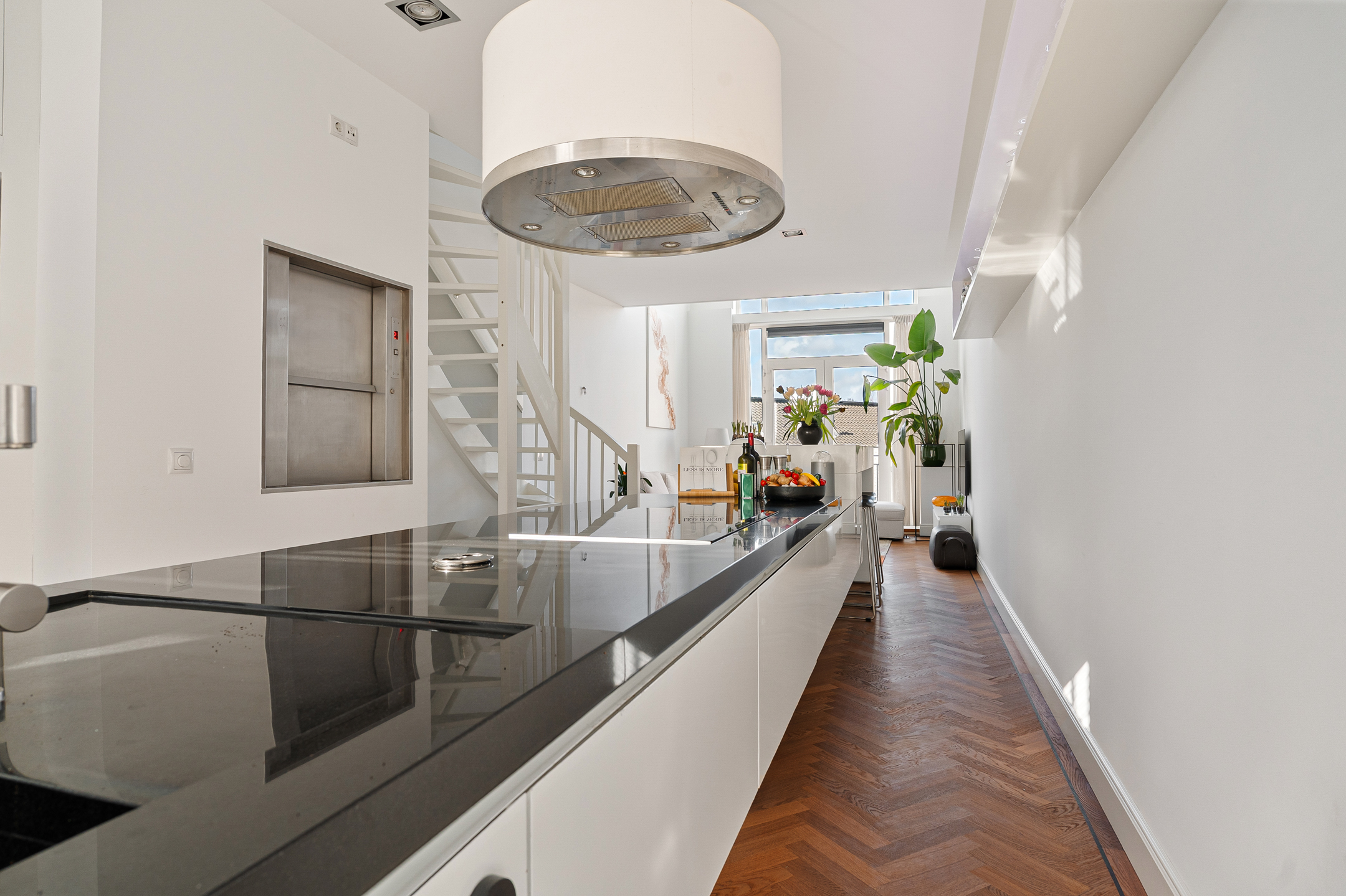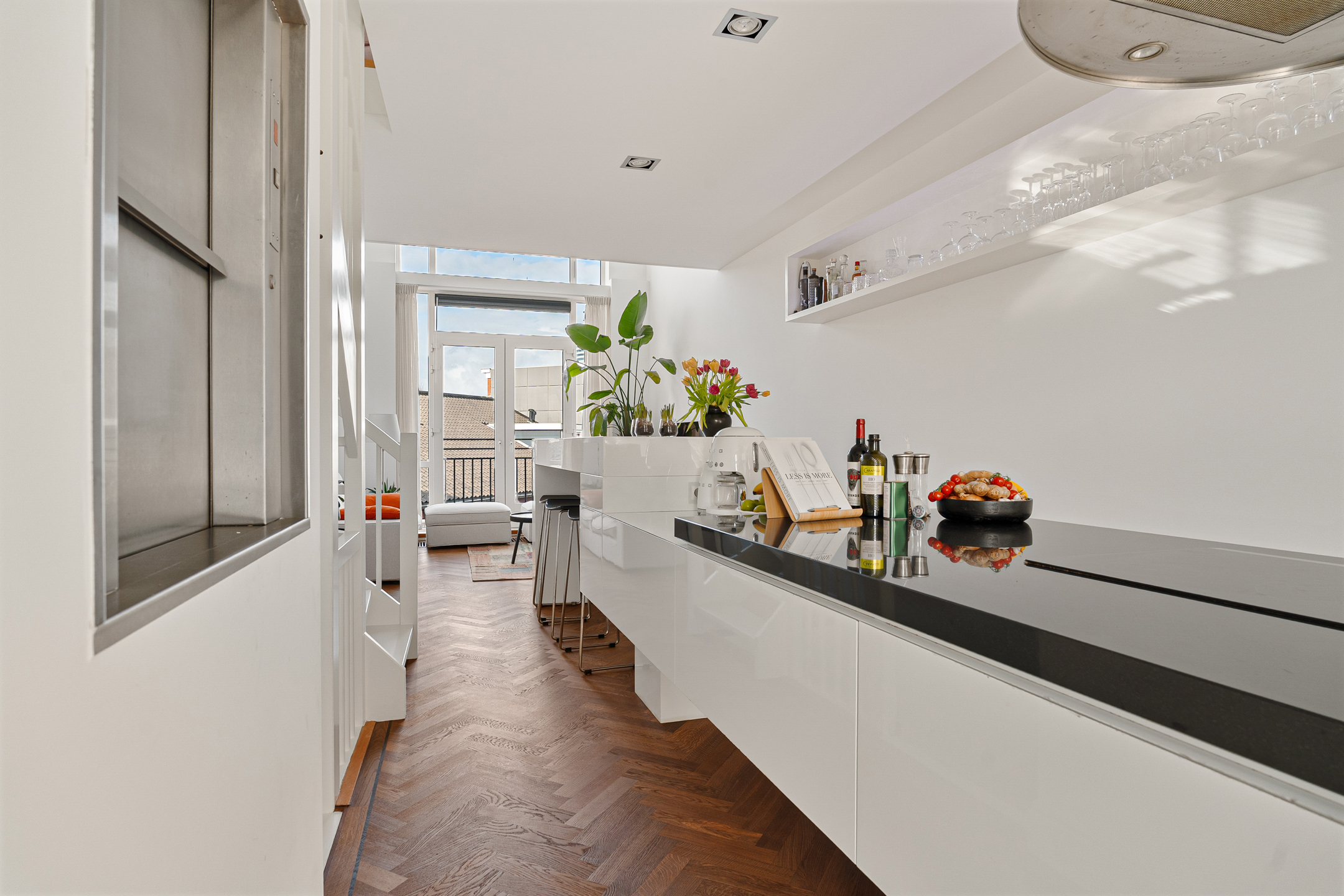 Met de goederenlift verplaats je hapjes en drankjes vanuit de keuken eenvoudig naar de begane grond of het dakterras. De woonkeuken krijgt extra stedelijke allure door de vide die deze verdieping met de derde verdieping verbindt.
