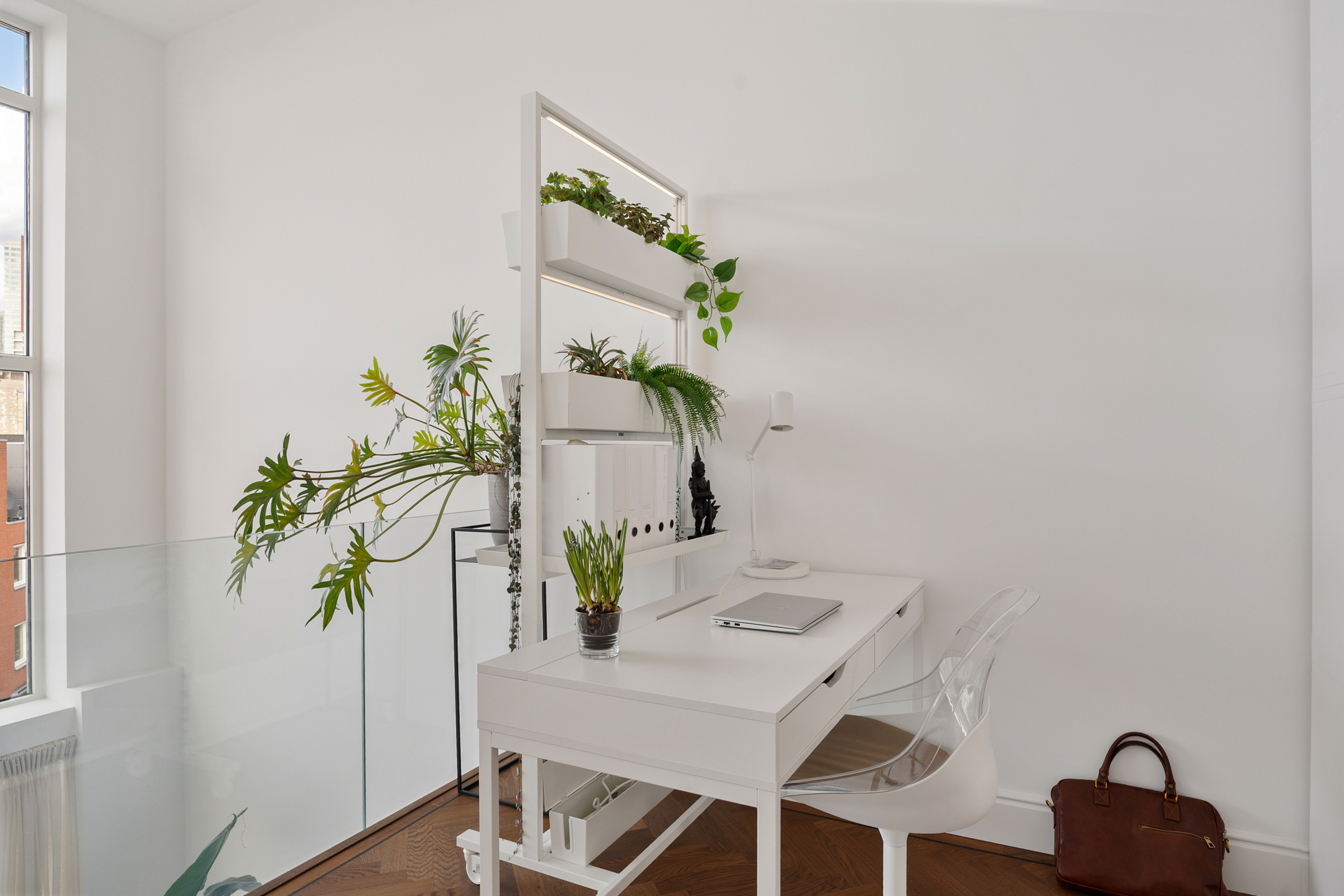 De vide op deze verdieping heeft, net als de andere woonlagen, een prachtige parketvloer en een ruimtelijke uitstraling dankzij de imposante hoogte en de hardglazen balustrade.