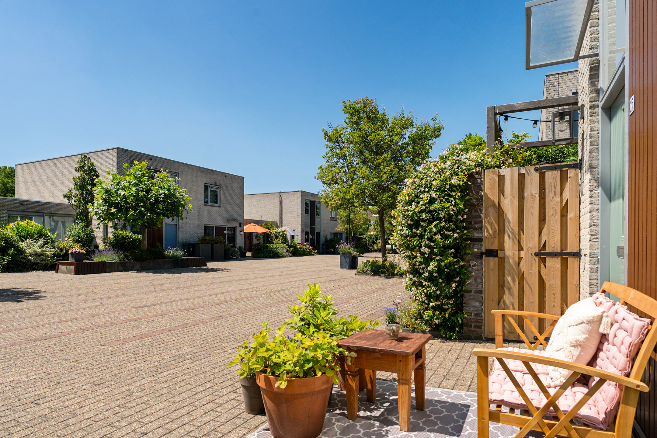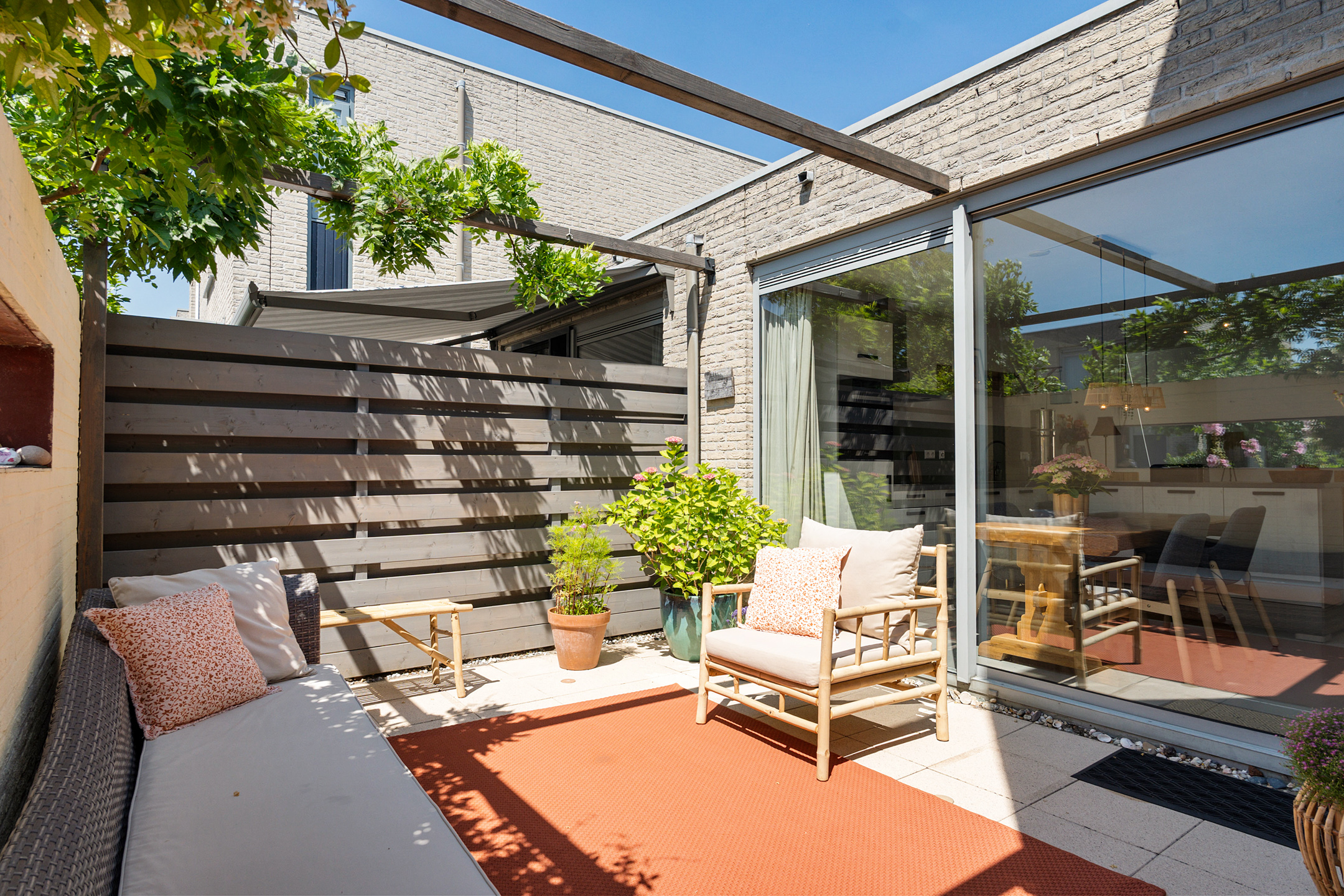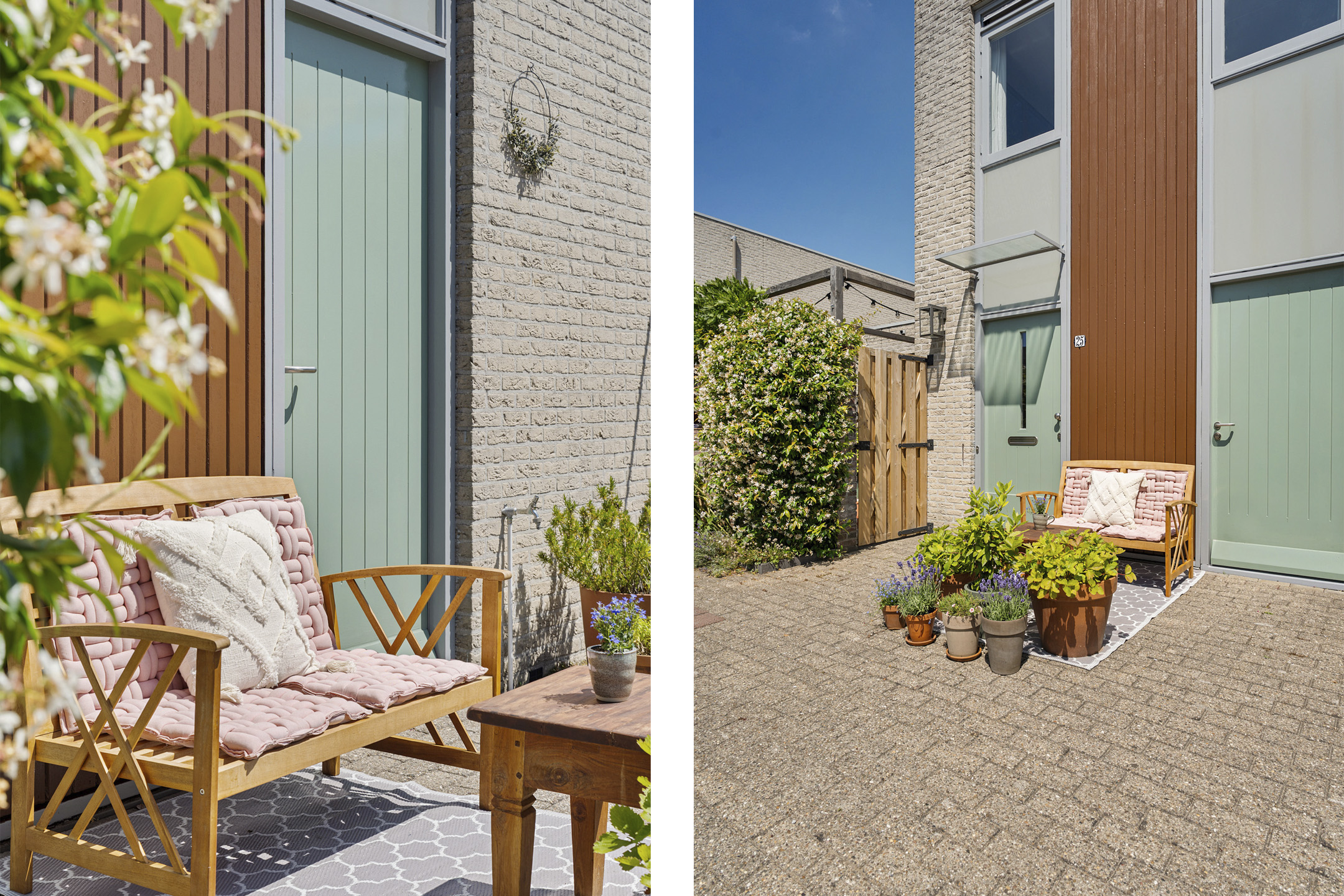 De patio aan de voorzijde ligt op het zuiden en is bereikbaar via een schuifpui in de woonkeuken. Hierdoor verbind je binnen en buiten moeiteloos met elkaar. Aan de achterzijde bevindt zich nog een tweede patio met achterom. Beide buitenruimtes bieden veel privacy en zijn onderhoudsvriendelijk ingericht.