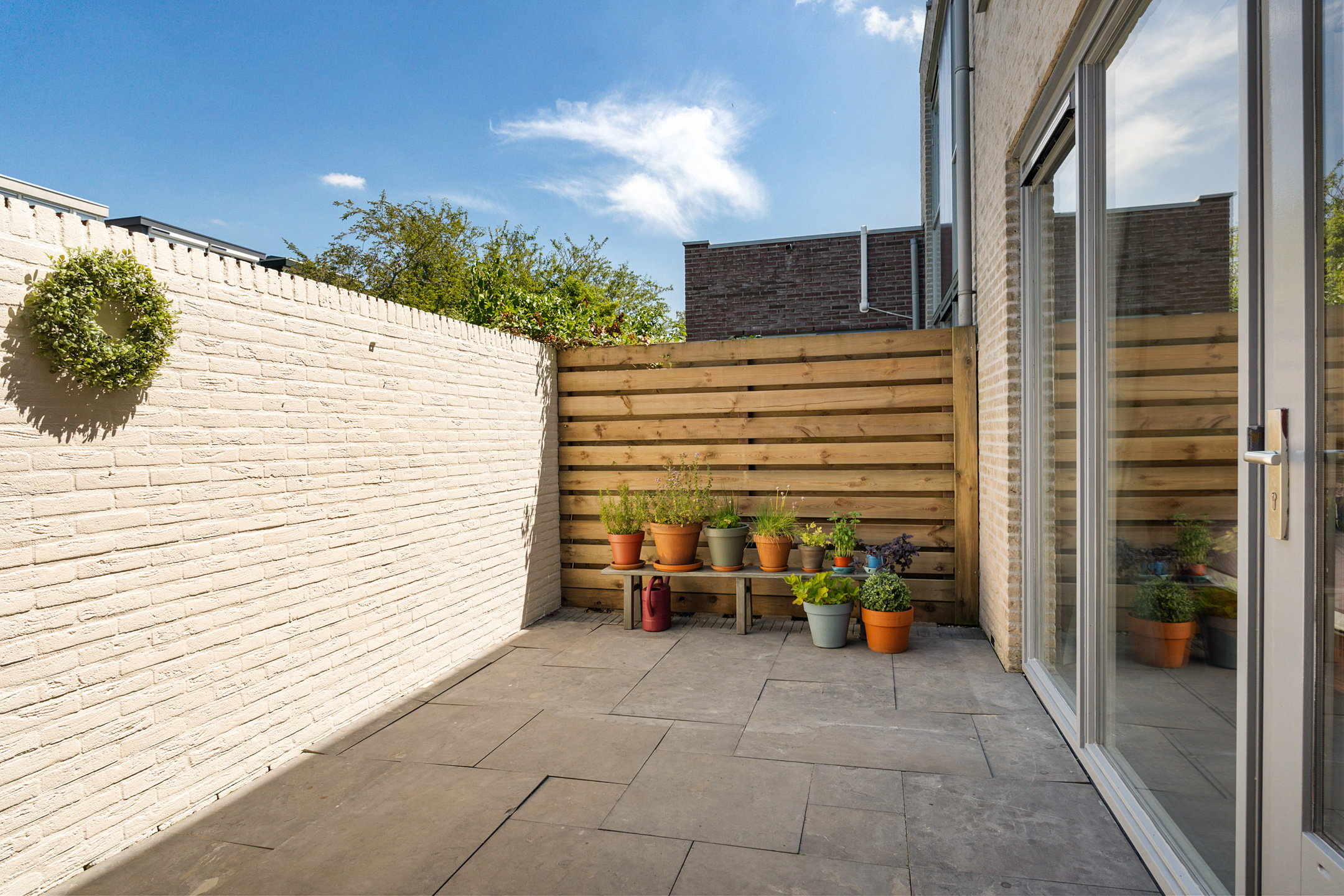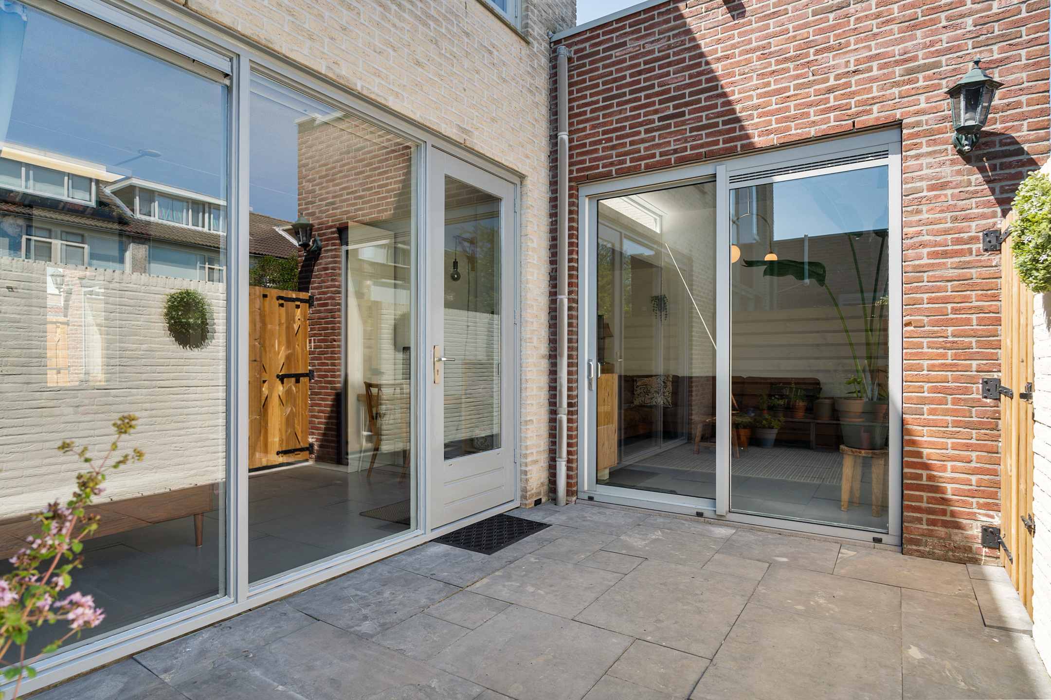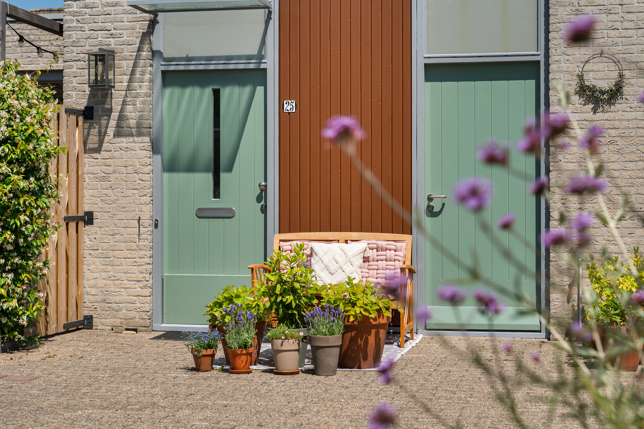 De patio aan de voorzijde ligt op het zuiden en is bereikbaar via een schuifpui in de woonkeuken. Hierdoor verbind je binnen en buiten moeiteloos met elkaar. Aan de achterzijde bevindt zich nog een tweede patio met achterom. Beide buitenruimtes bieden veel privacy en zijn onderhoudsvriendelijk ingericht.