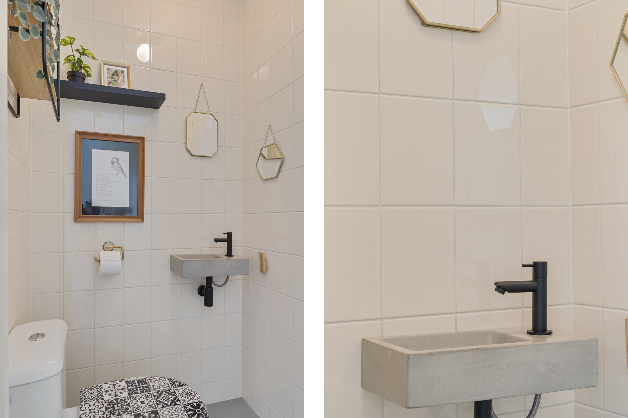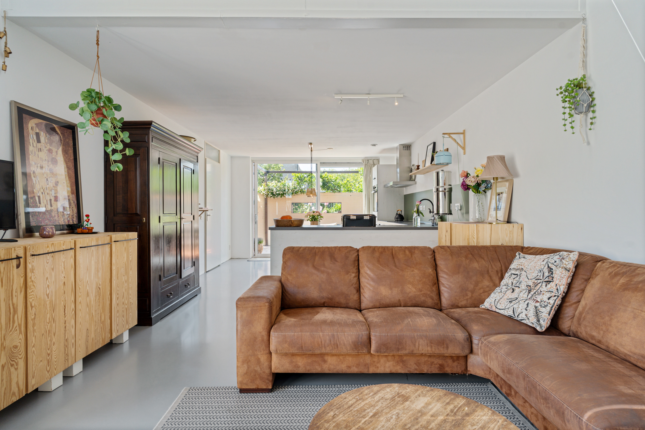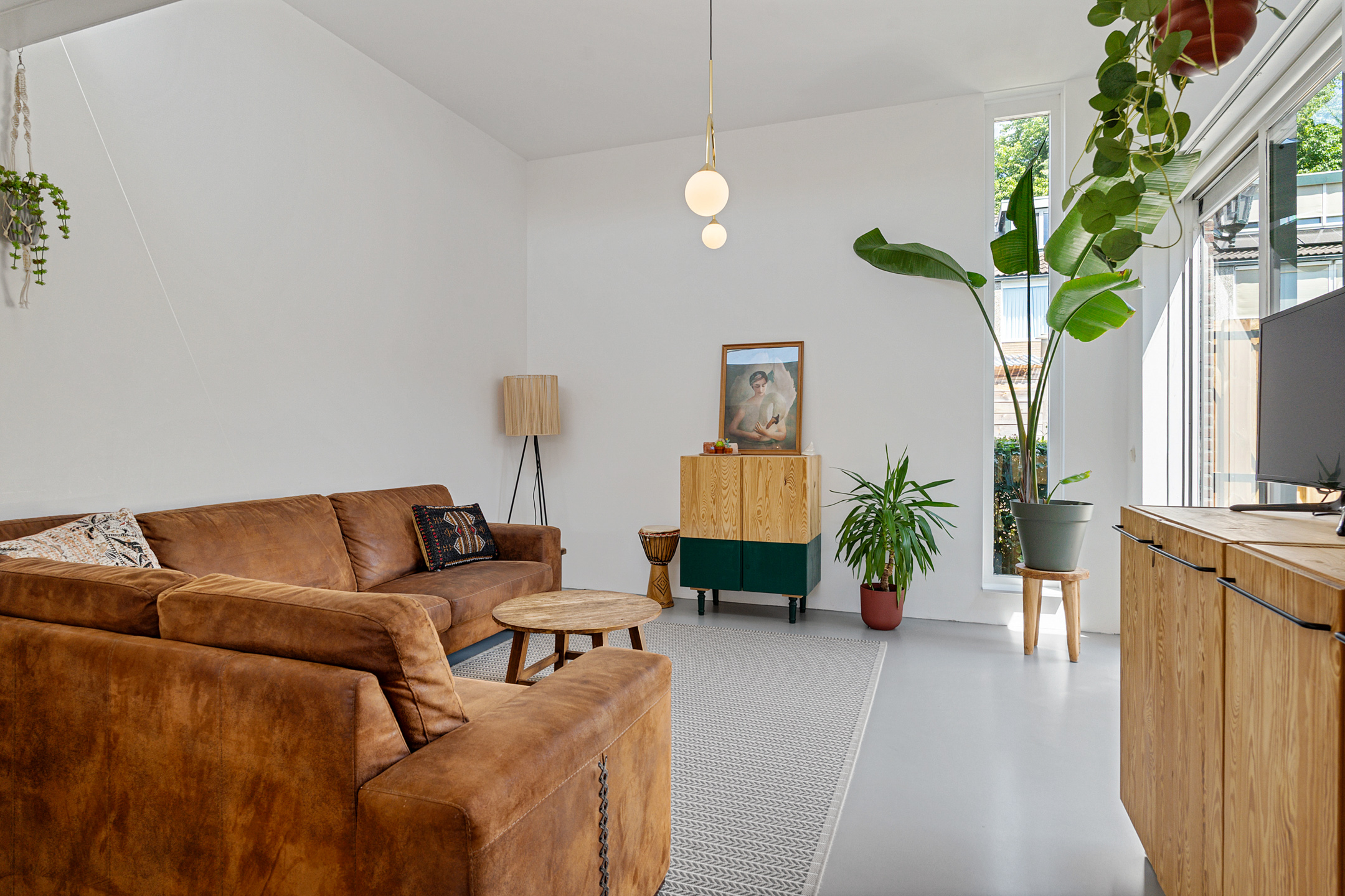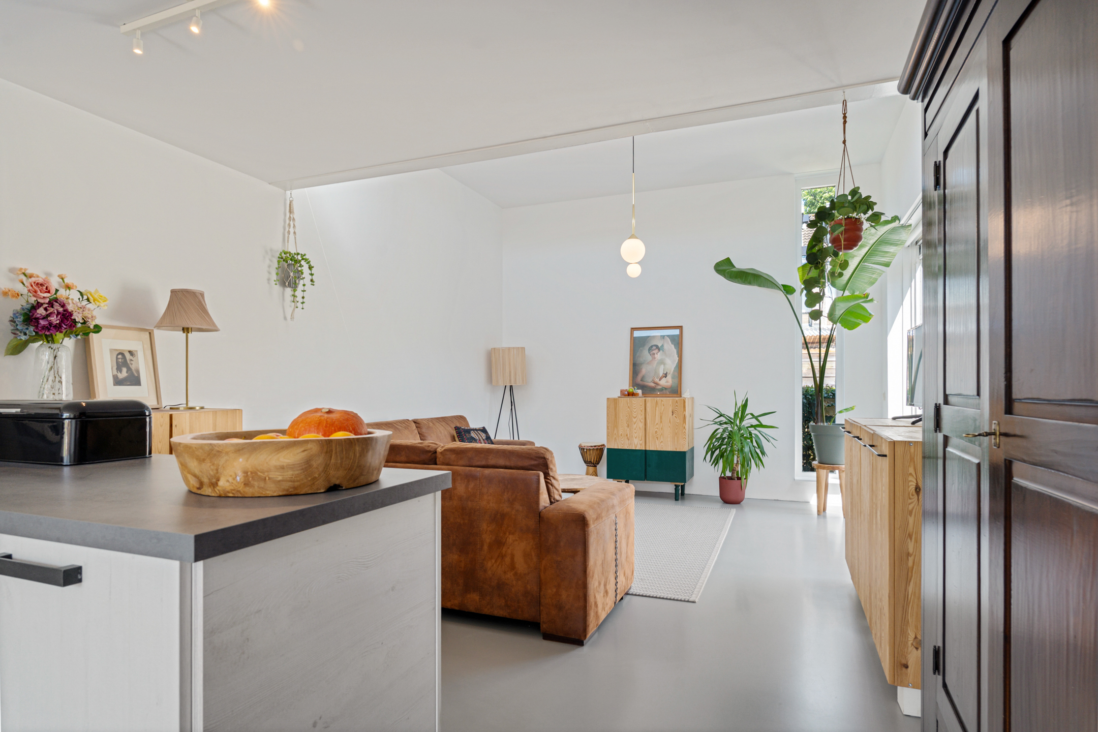 Je komt binnen in een ruime hal met de meterkast (gemoderniseerd, met 6 groepen en een dubbele groep voor de kookplaat), het toilet en de trap naar boven. De lichte woonkamer heeft een indrukwekkende lichtstraat en is afgewerkt met een strakke grijze gietvloer voorzien van vloerverwarming en isolatie. Deze ruimte voelt ruim en sfeervol aan, mede dankzij de neutrale kleurstelling en de fraaie lichtinval.