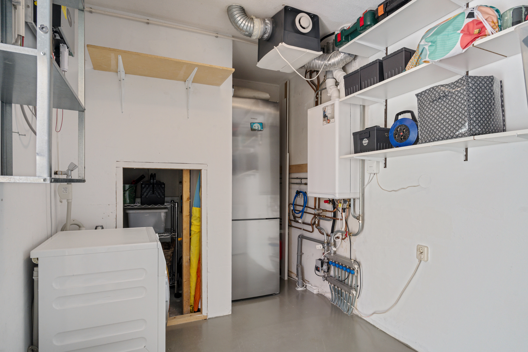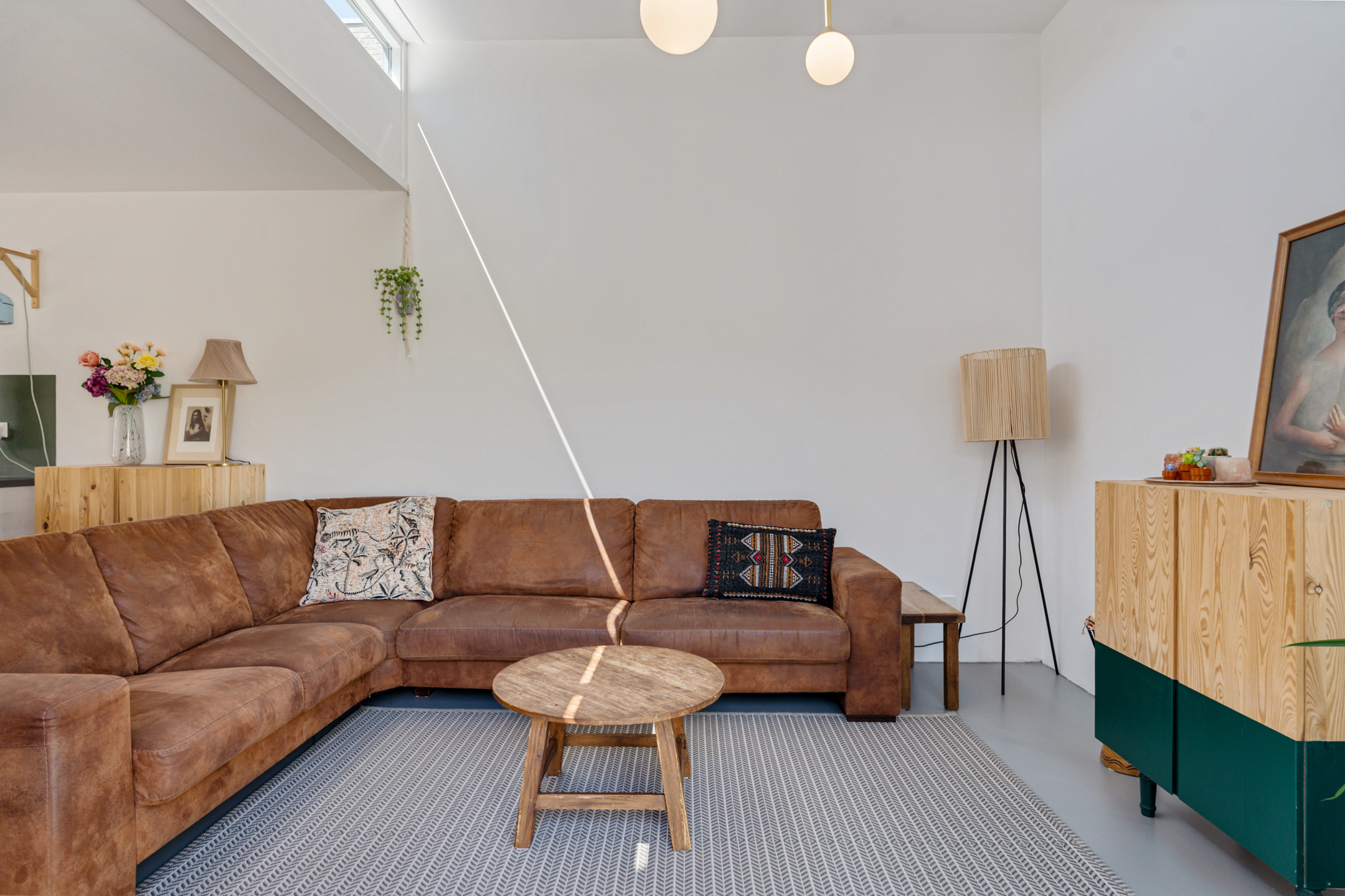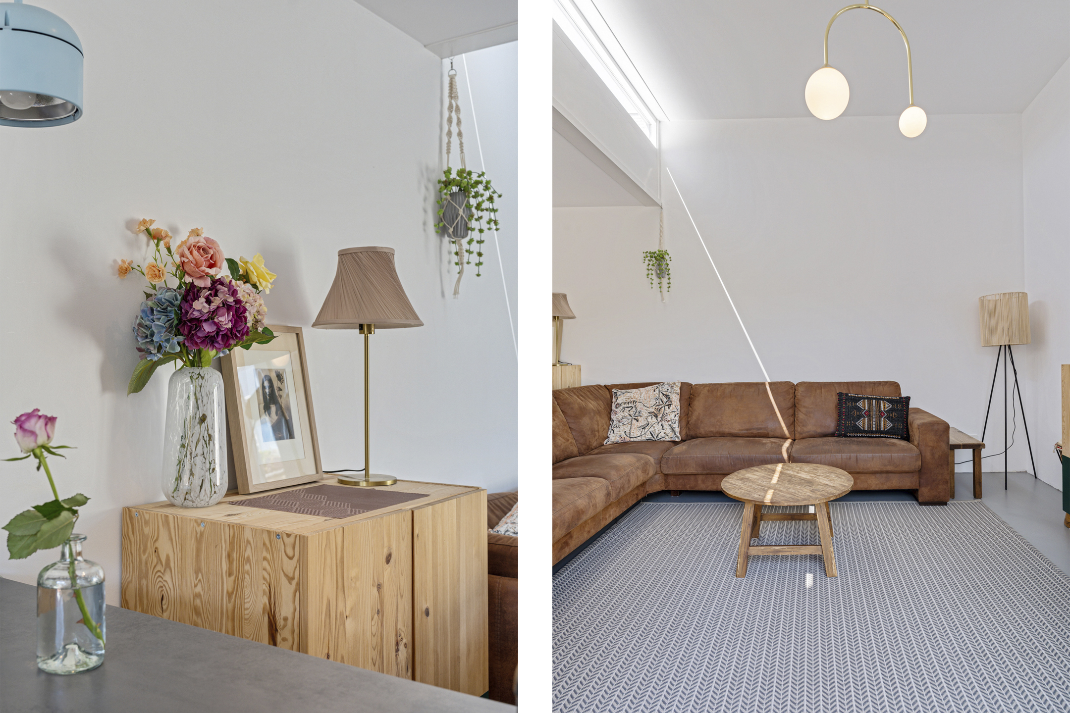 Je komt binnen in een ruime hal met de meterkast (gemoderniseerd, met 6 groepen en een dubbele groep voor de kookplaat), het toilet en de trap naar boven. De lichte woonkamer heeft een indrukwekkende lichtstraat en is afgewerkt met een strakke grijze gietvloer voorzien van vloerverwarming en isolatie. Deze ruimte voelt ruim en sfeervol aan, mede dankzij de neutrale kleurstelling en de fraaie lichtinval.