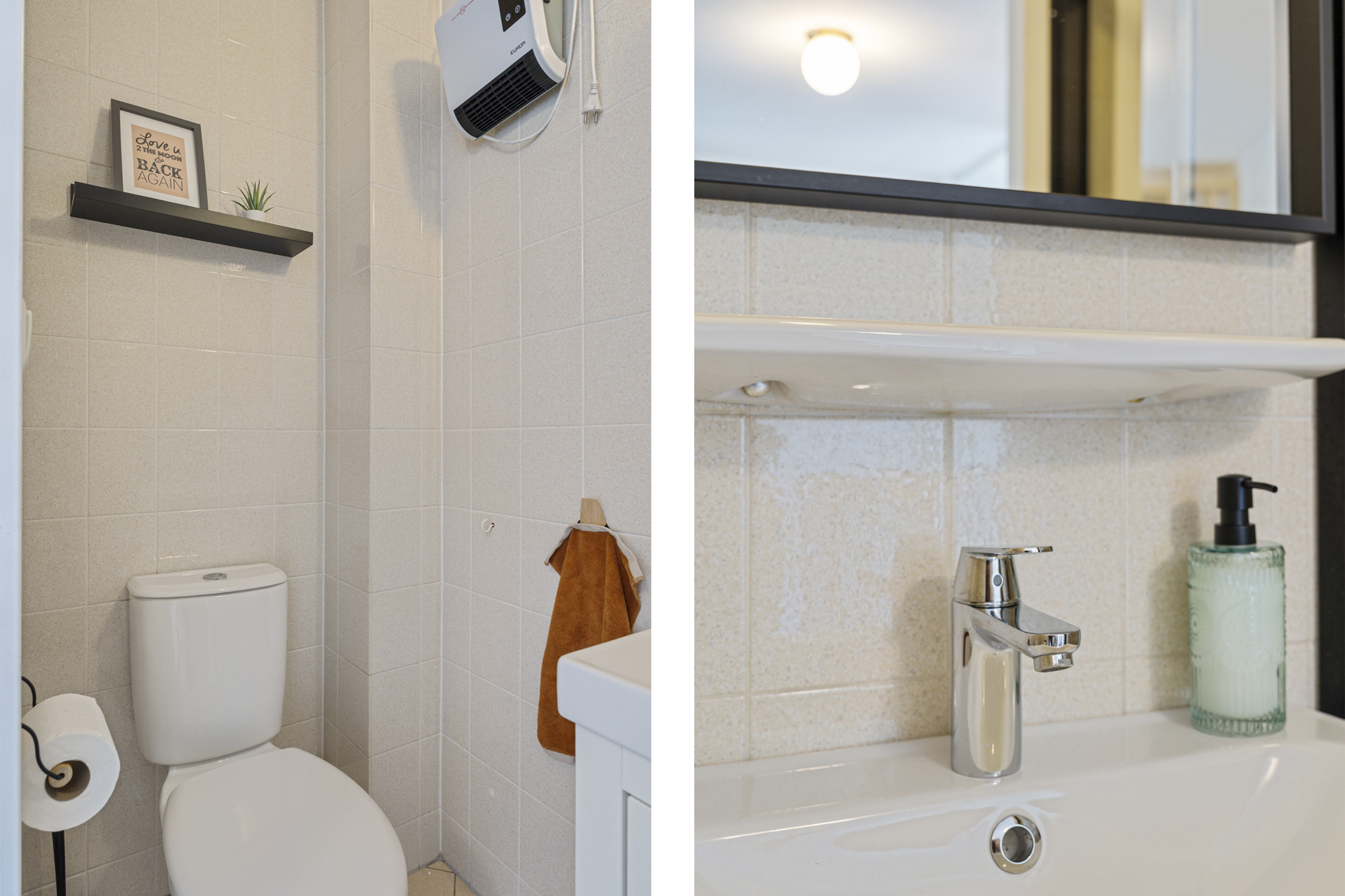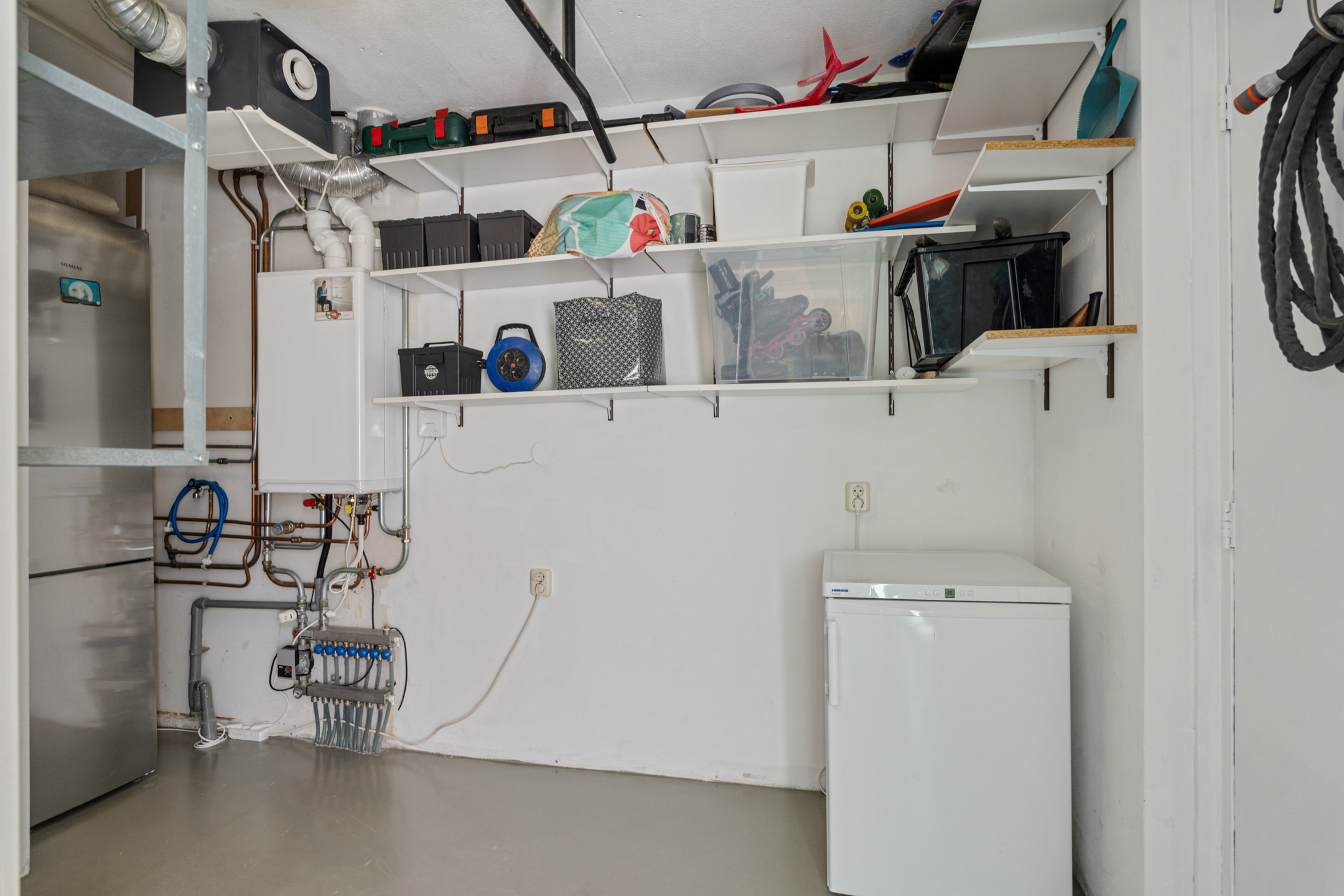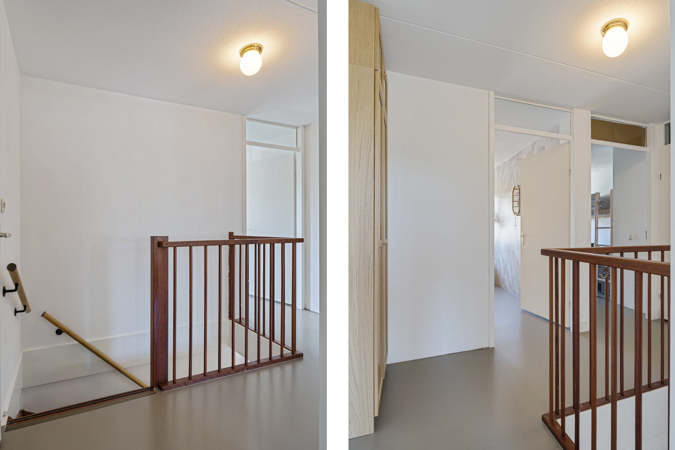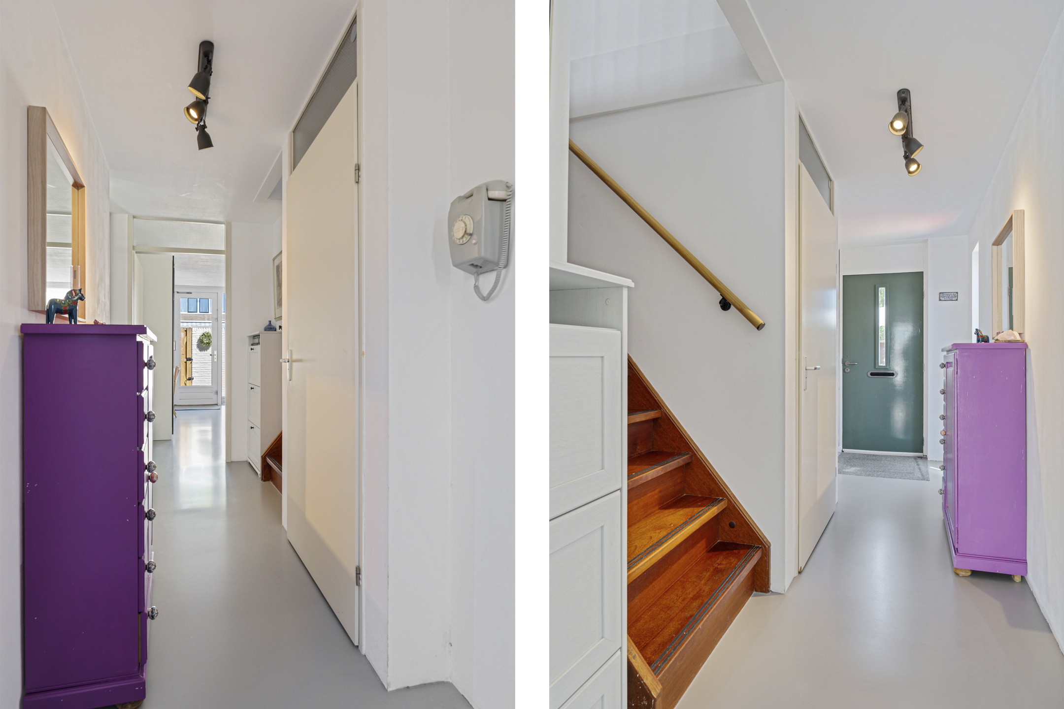 Je komt binnen in een ruime hal met de meterkast (gemoderniseerd, met 6 groepen en een dubbele groep voor de kookplaat), het toilet en de trap naar boven. De lichte woonkamer heeft een indrukwekkende lichtstraat en is afgewerkt met een strakke grijze gietvloer voorzien van vloerverwarming en isolatie. Deze ruimte voelt ruim en sfeervol aan, mede dankzij de neutrale kleurstelling en de fraaie lichtinval.