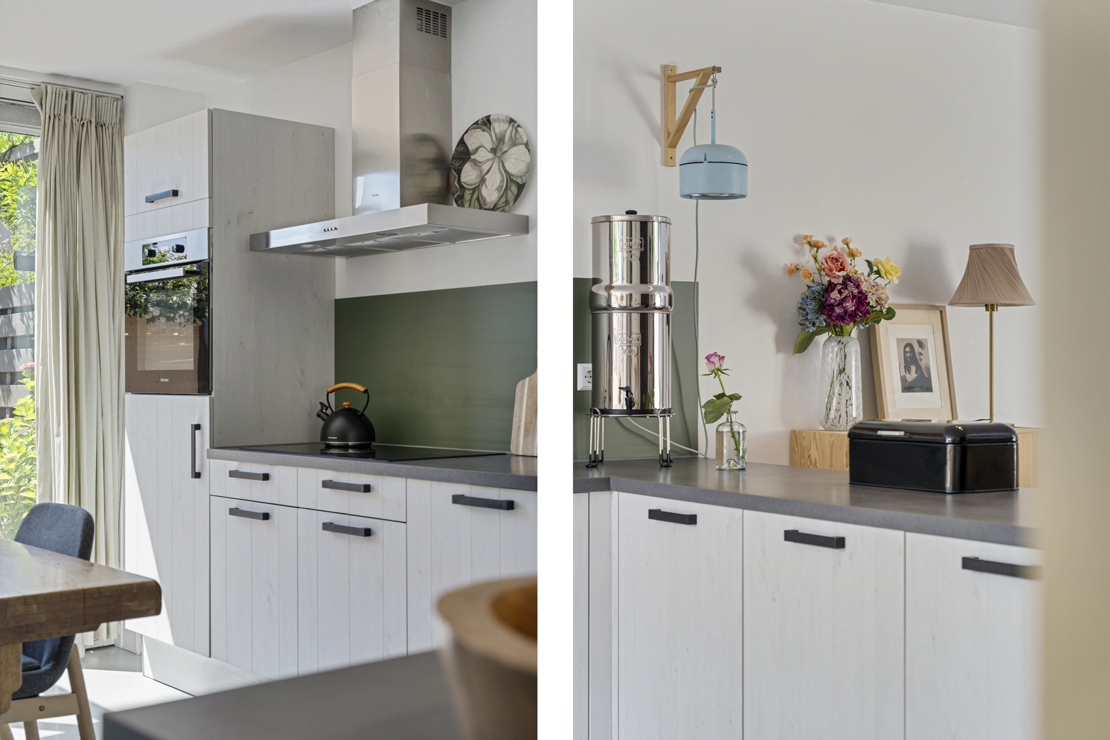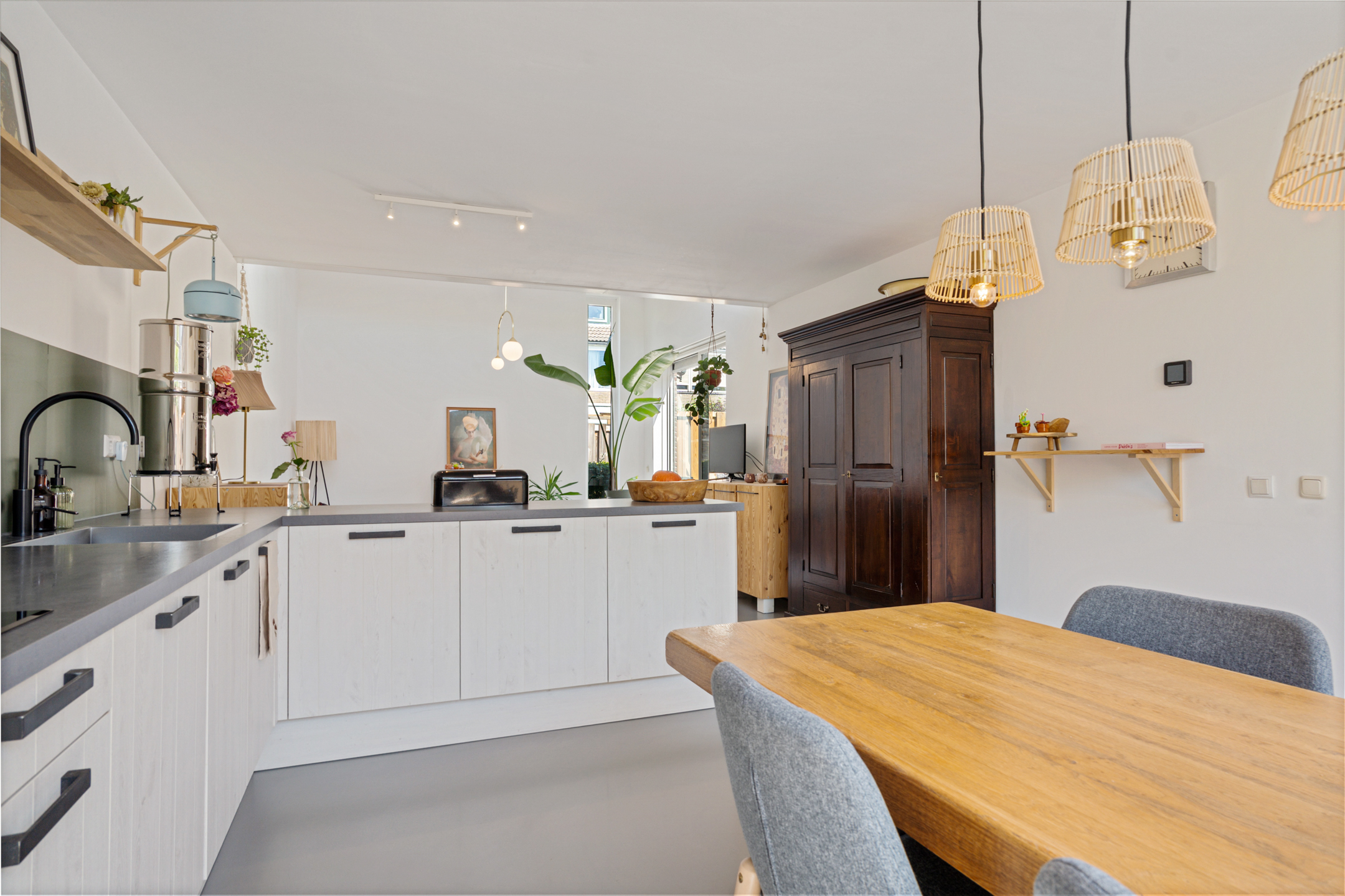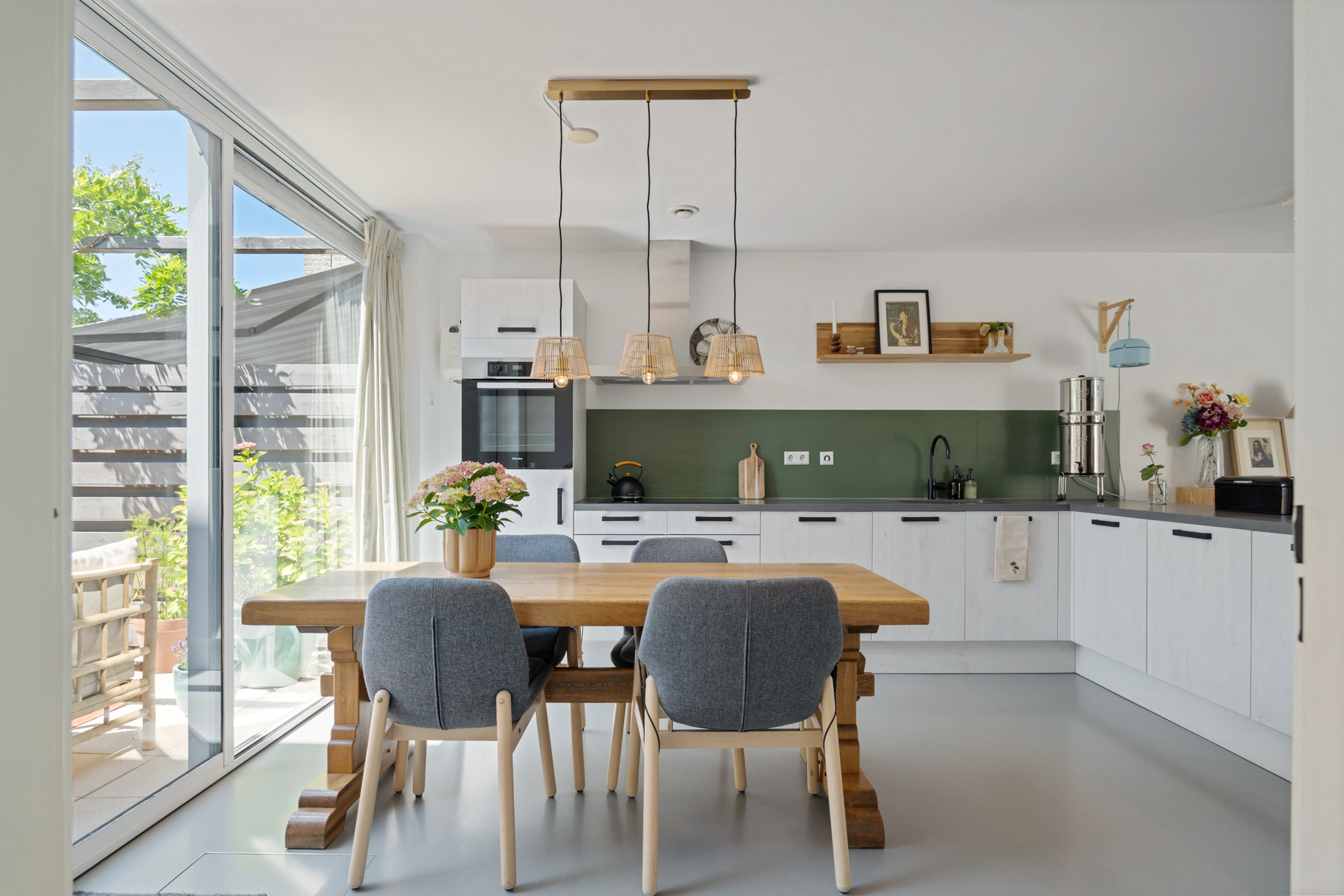 Aan de voorzijde ligt de royale woonkeuken met uitzicht op de patio. De keuken is modern vormgegeven en voorzien van hoogwaardige inbouwapparatuur. Zwarte details zoals de kraan, handgrepen en de RVS spoelbak geven de keuken een eigentijdse uitstraling.