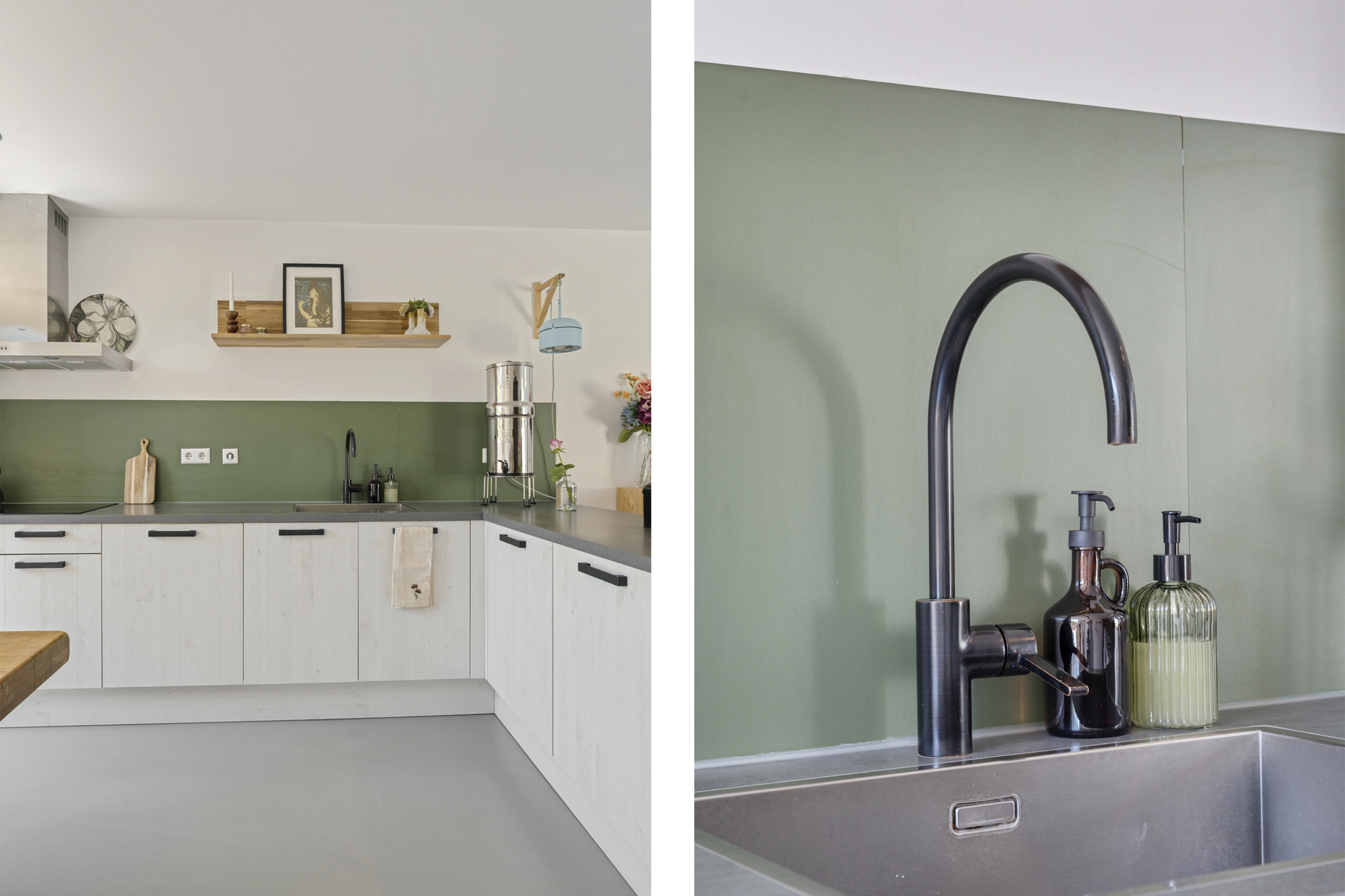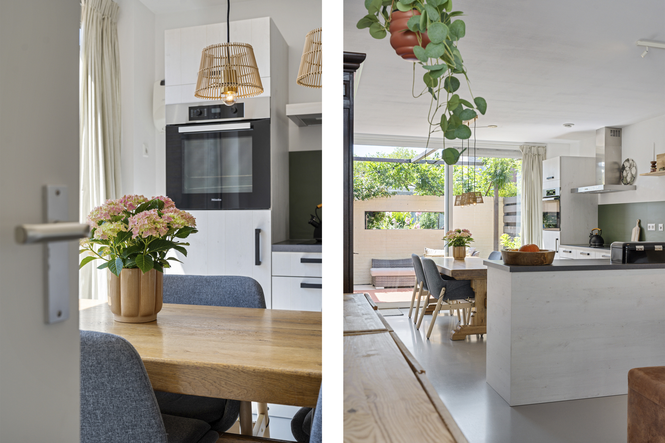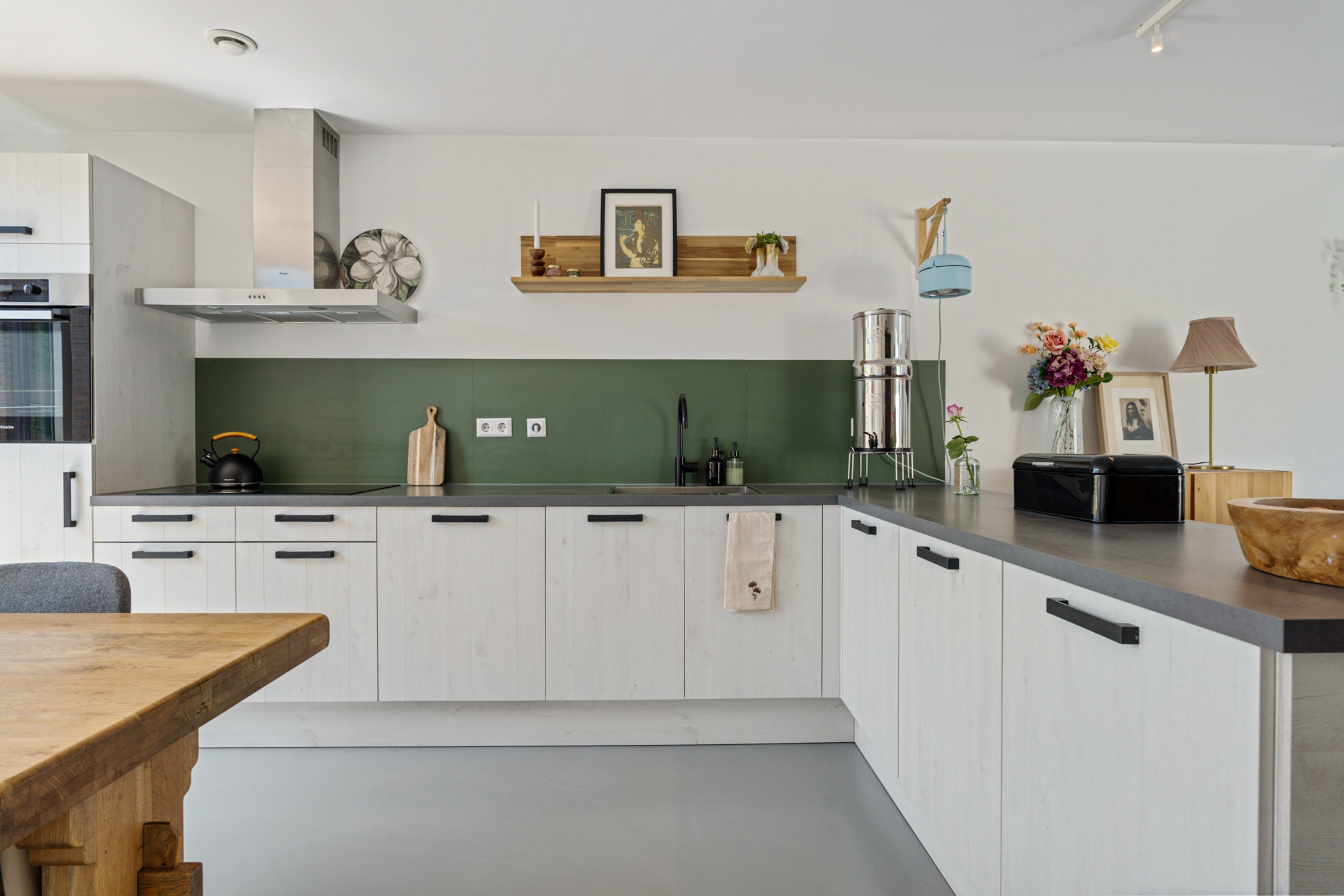 Aan de voorzijde ligt de royale woonkeuken met uitzicht op de patio. De keuken is modern vormgegeven en voorzien van hoogwaardige inbouwapparatuur. Zwarte details zoals de kraan, handgrepen en de RVS spoelbak geven de keuken een eigentijdse uitstraling.