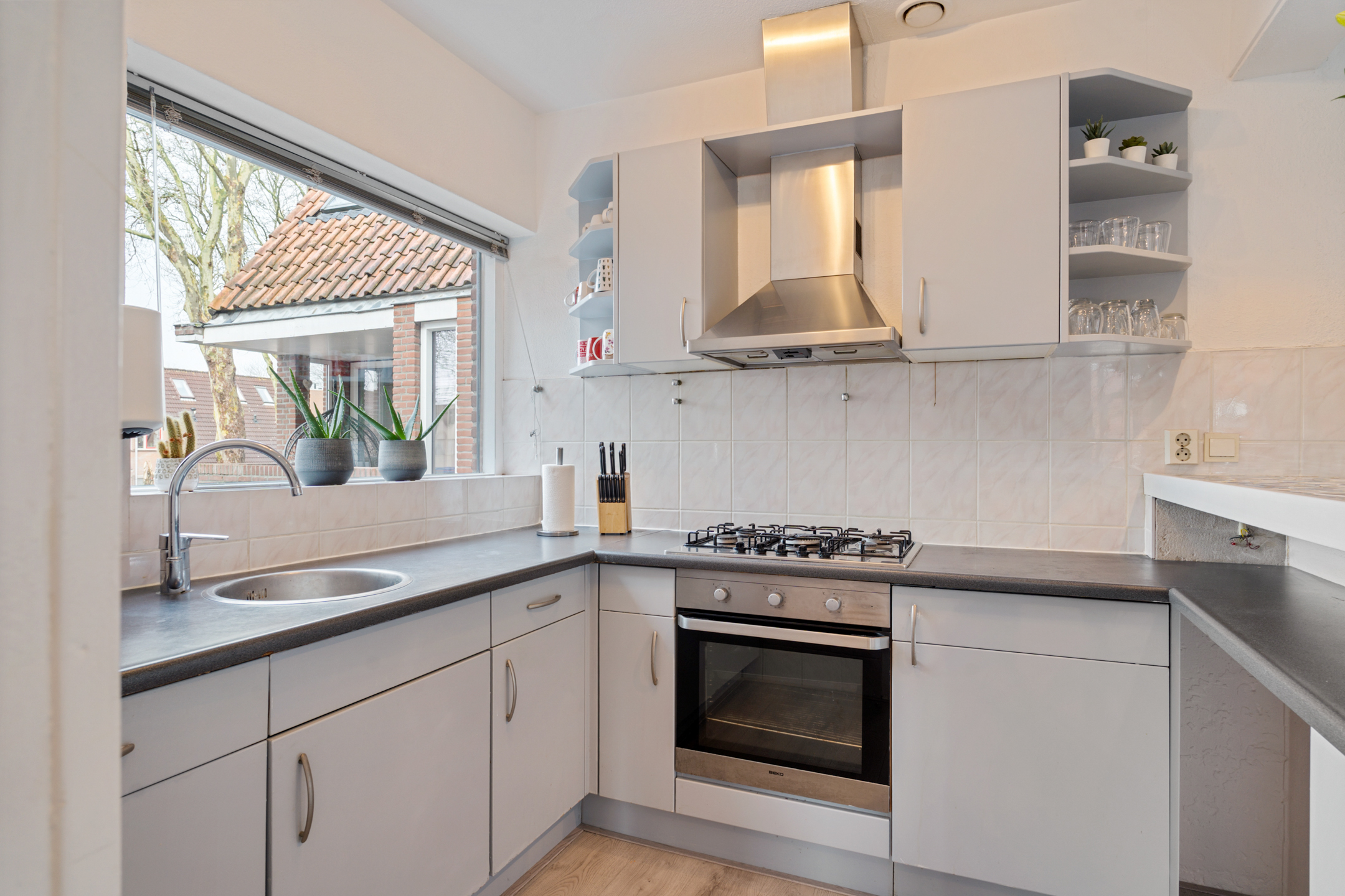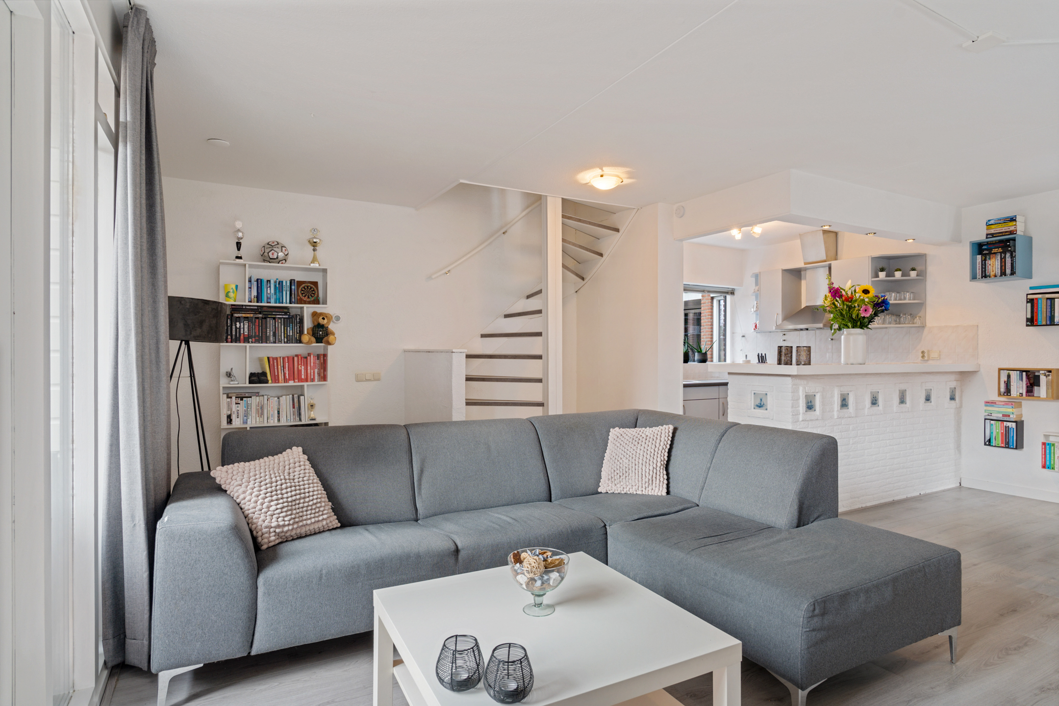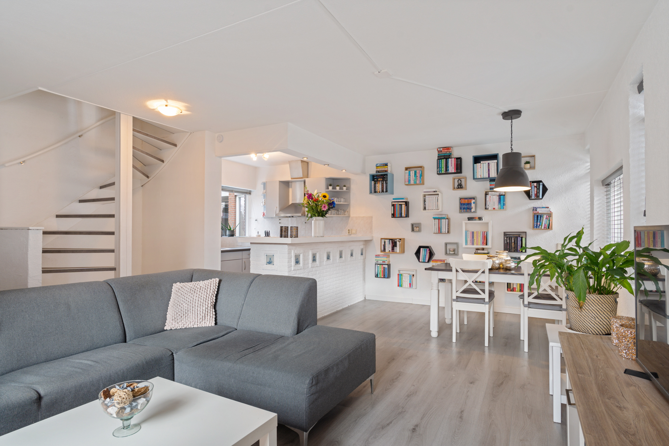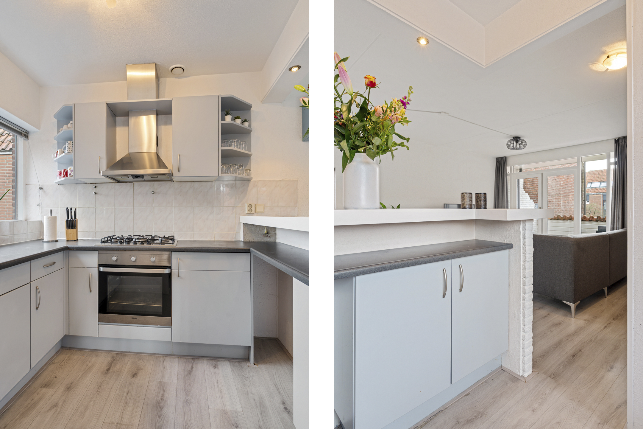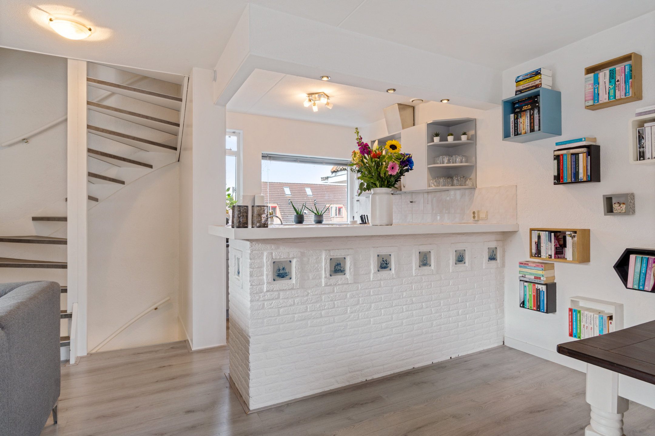 Aan de voorzijde bevindt zich de open keuken in hoekopstelling met bar. De verdieping is afgewerkt met een laminaatvloer. Tevens bevindt er zich een voorraadkast, ideaal voor huishoudelijke spullen.