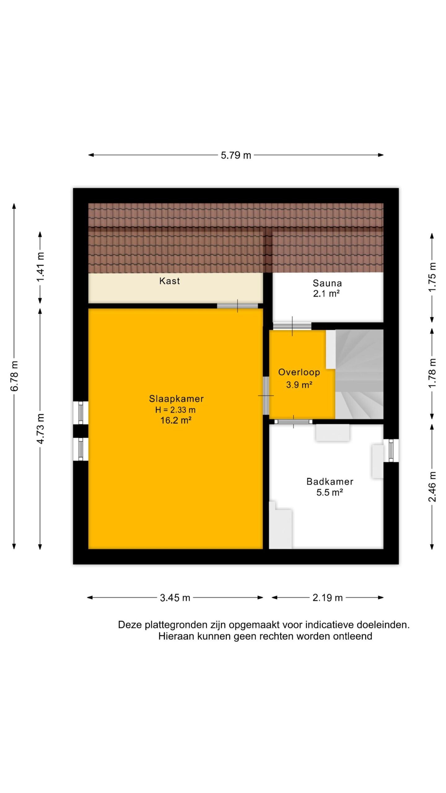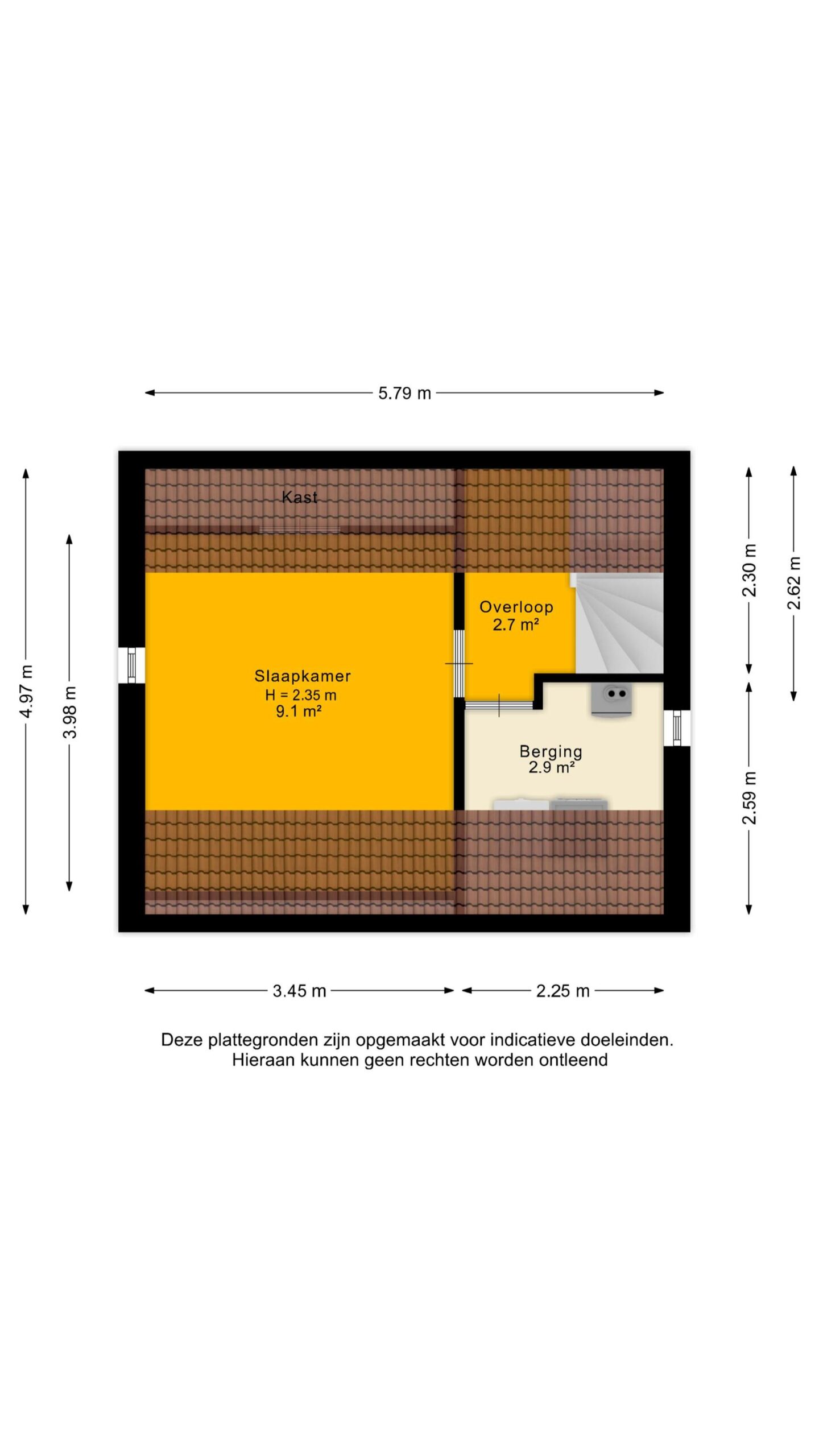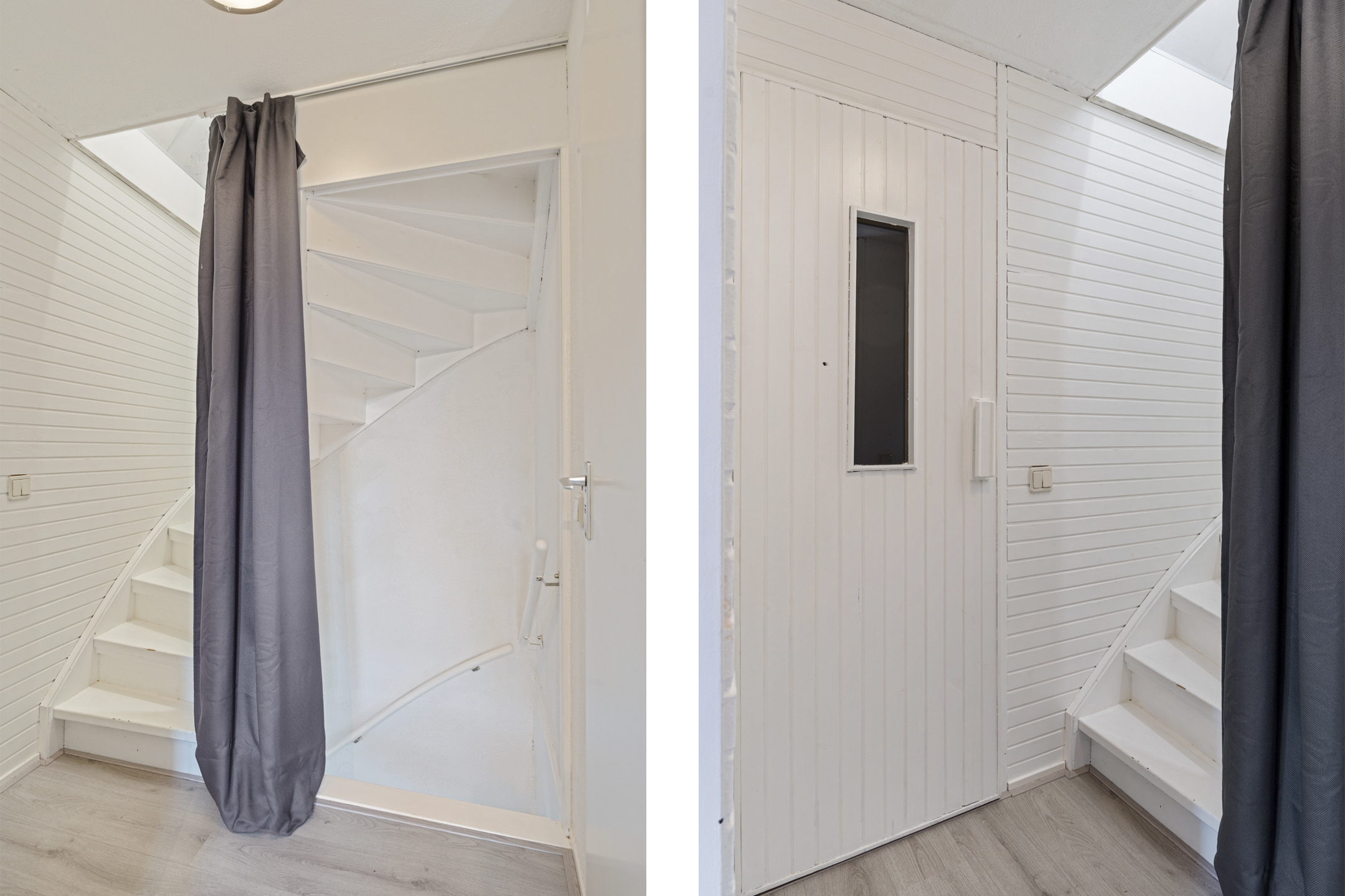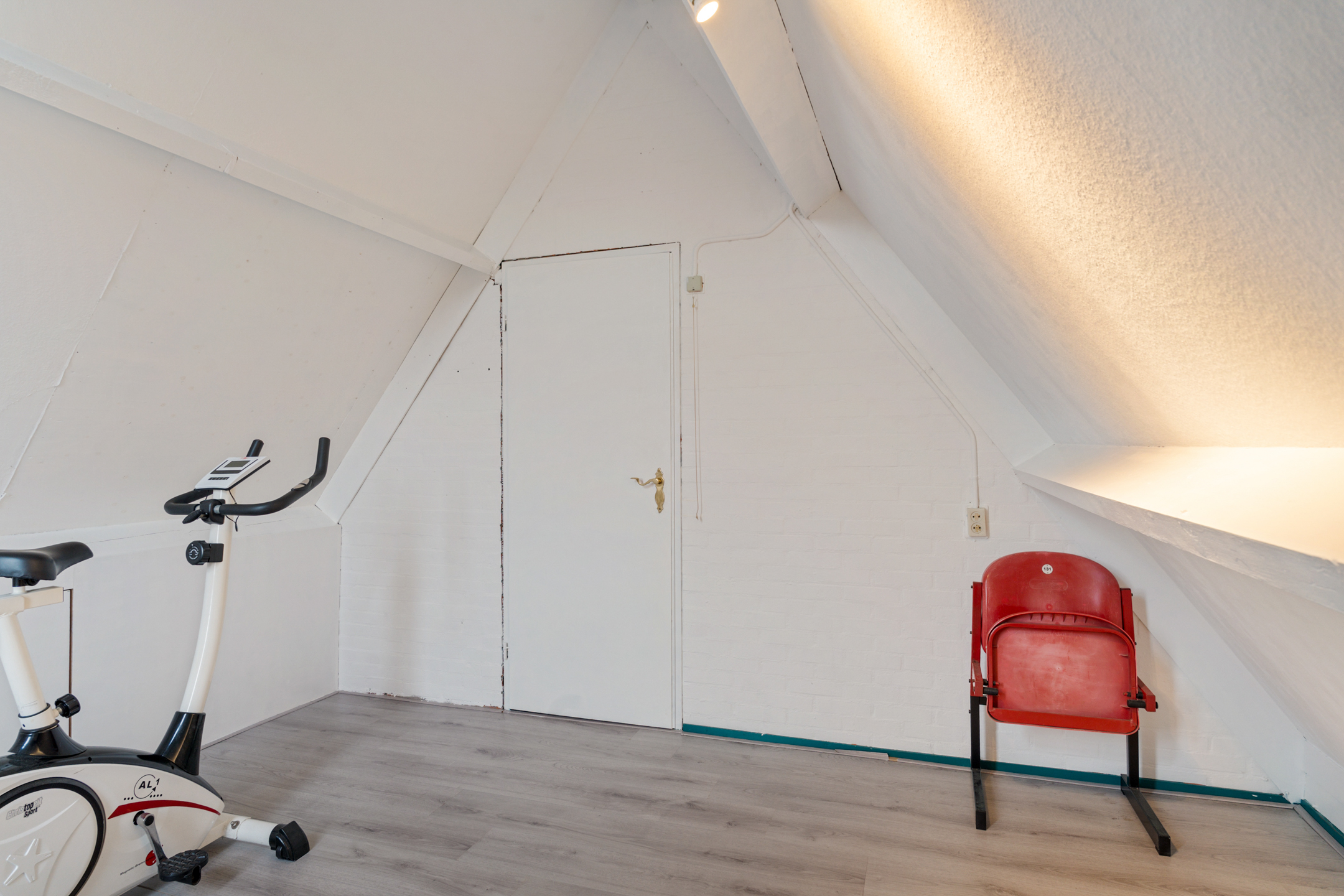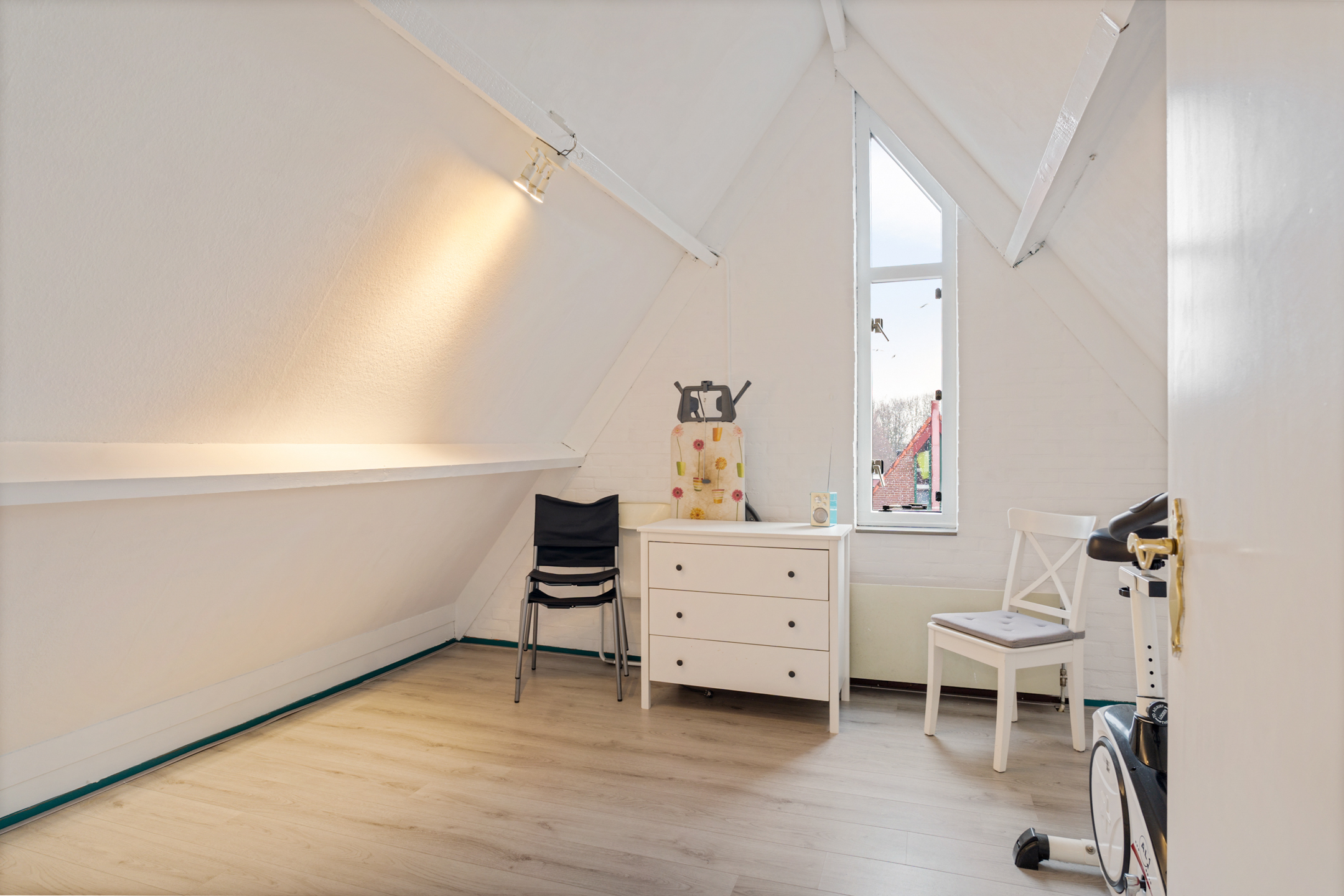 Op de bovenste verdieping bevindt zich nog een slaapkamer met bergruimte achter de knieschotten.