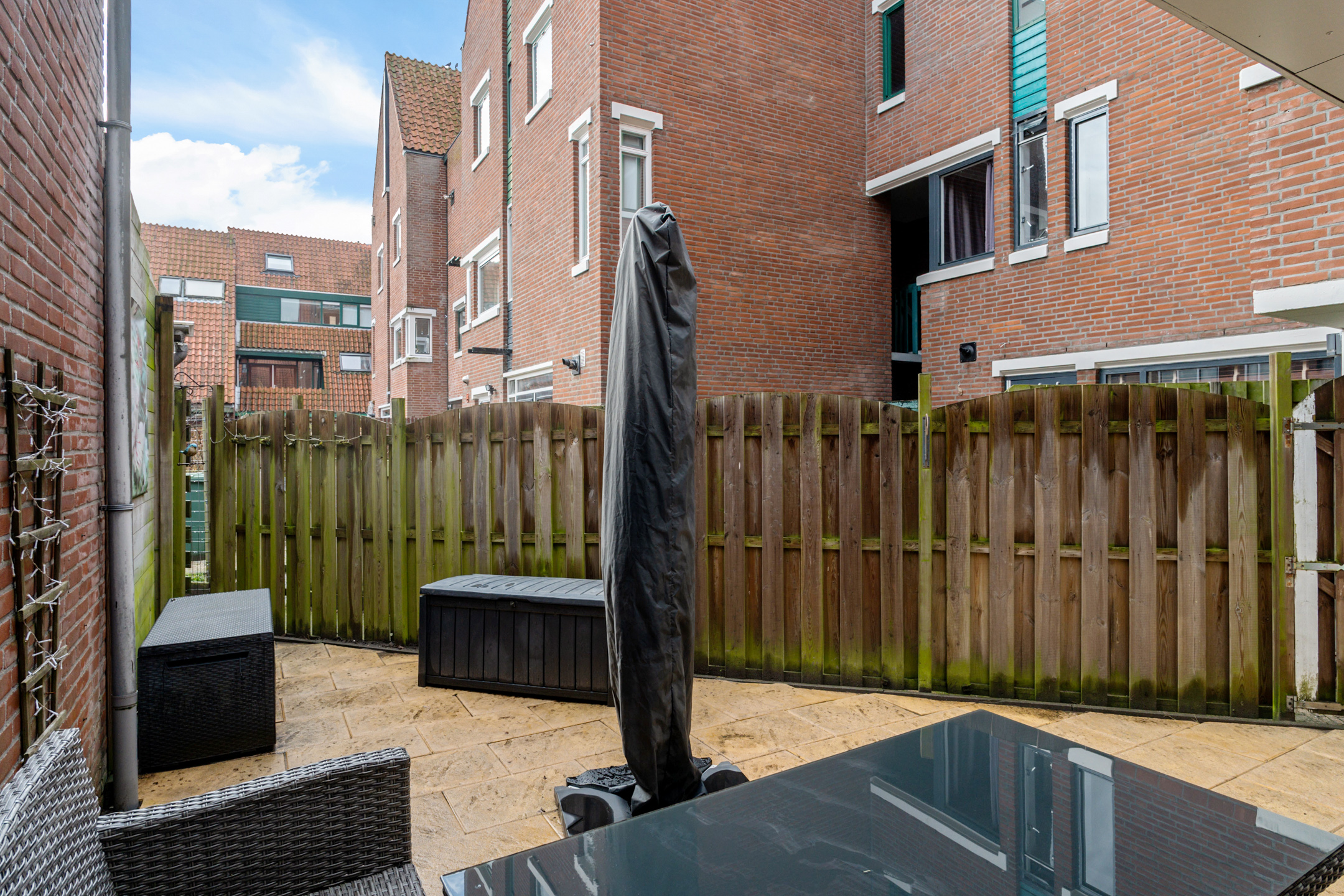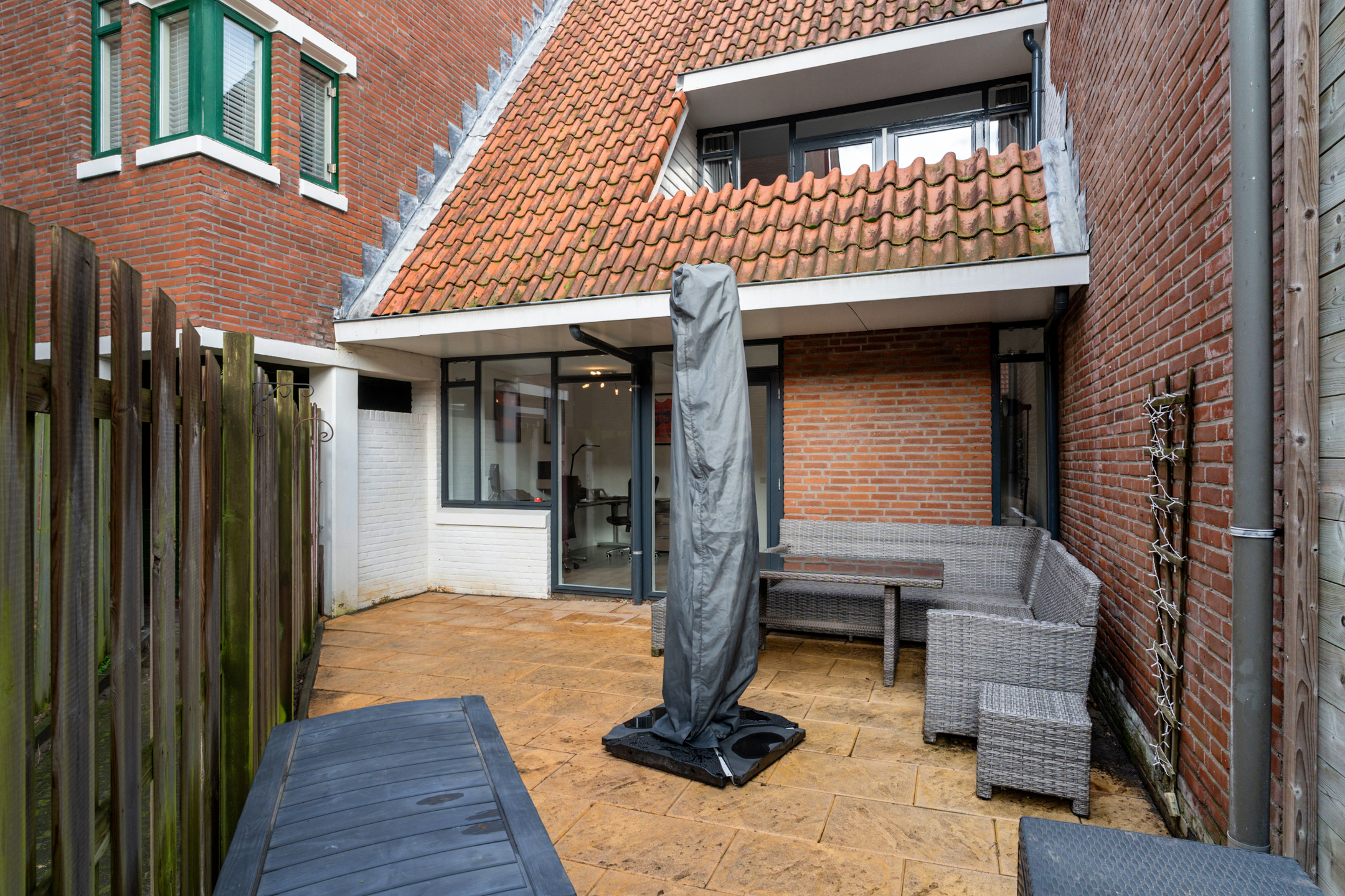 De achtertuin ligt op het zuiden en is volledig bestraat. Door de omliggende bebouwing geniet je in de zomer en in de winter van de zon.