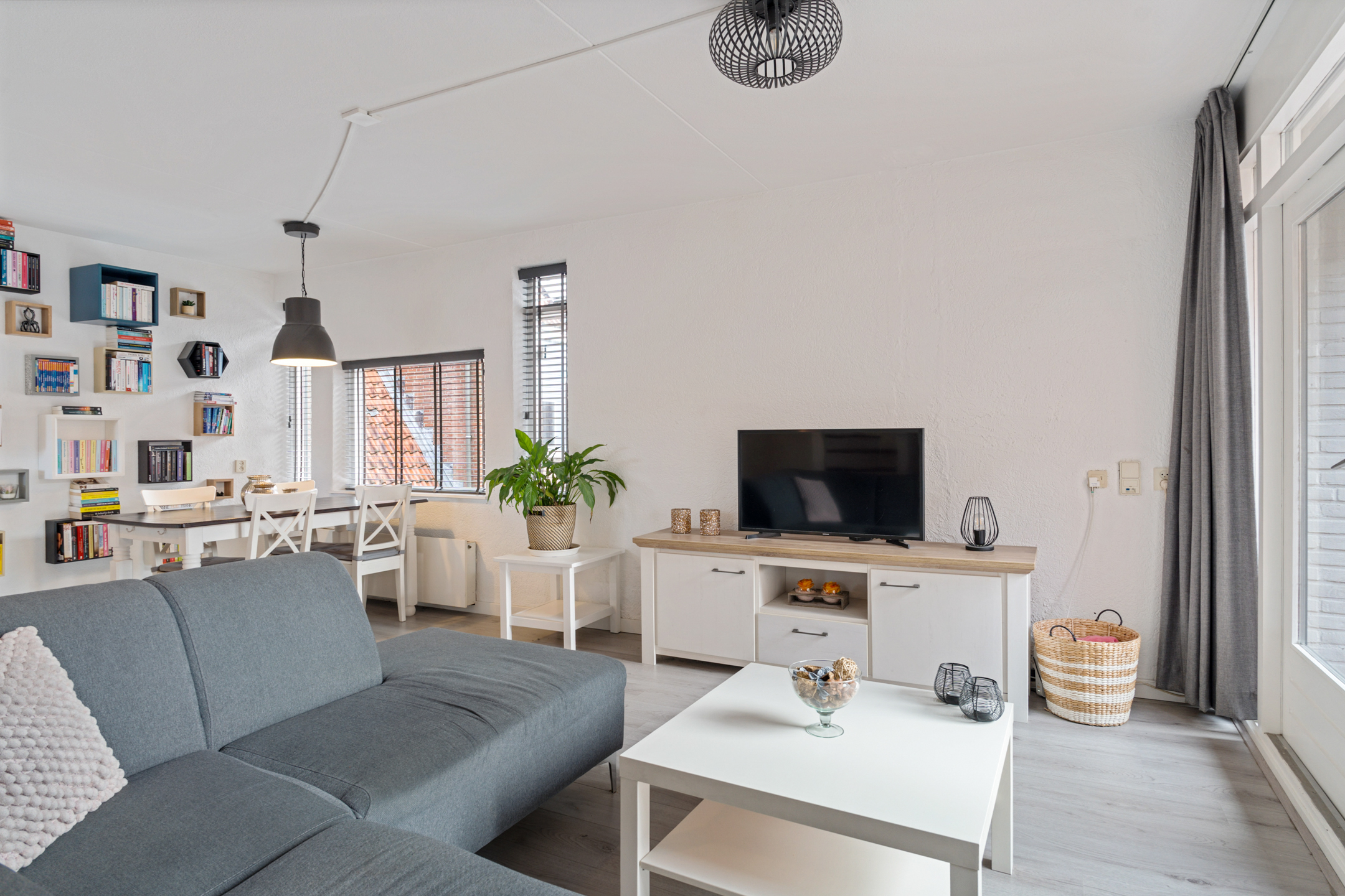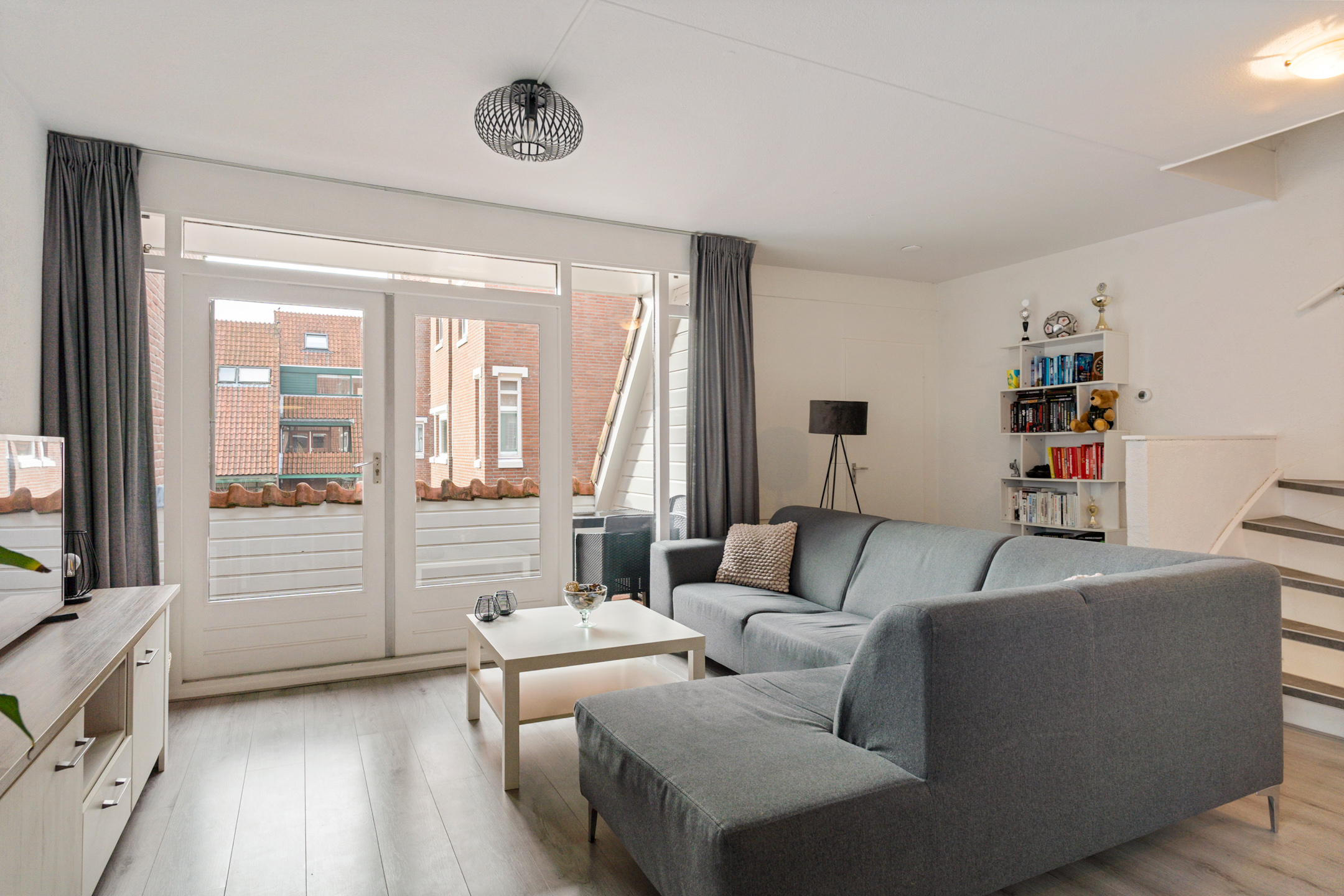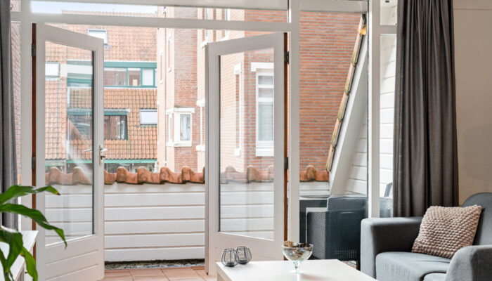 Aan de achterzijde ligt de lichte woonkamer met openslaande deuren naar het balkon op het zuiden. Dankzij de grote raampartijen is dit een prettige, lichte leefruimte.