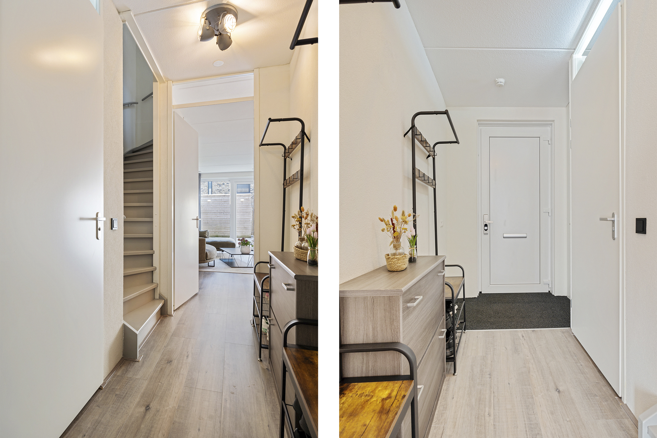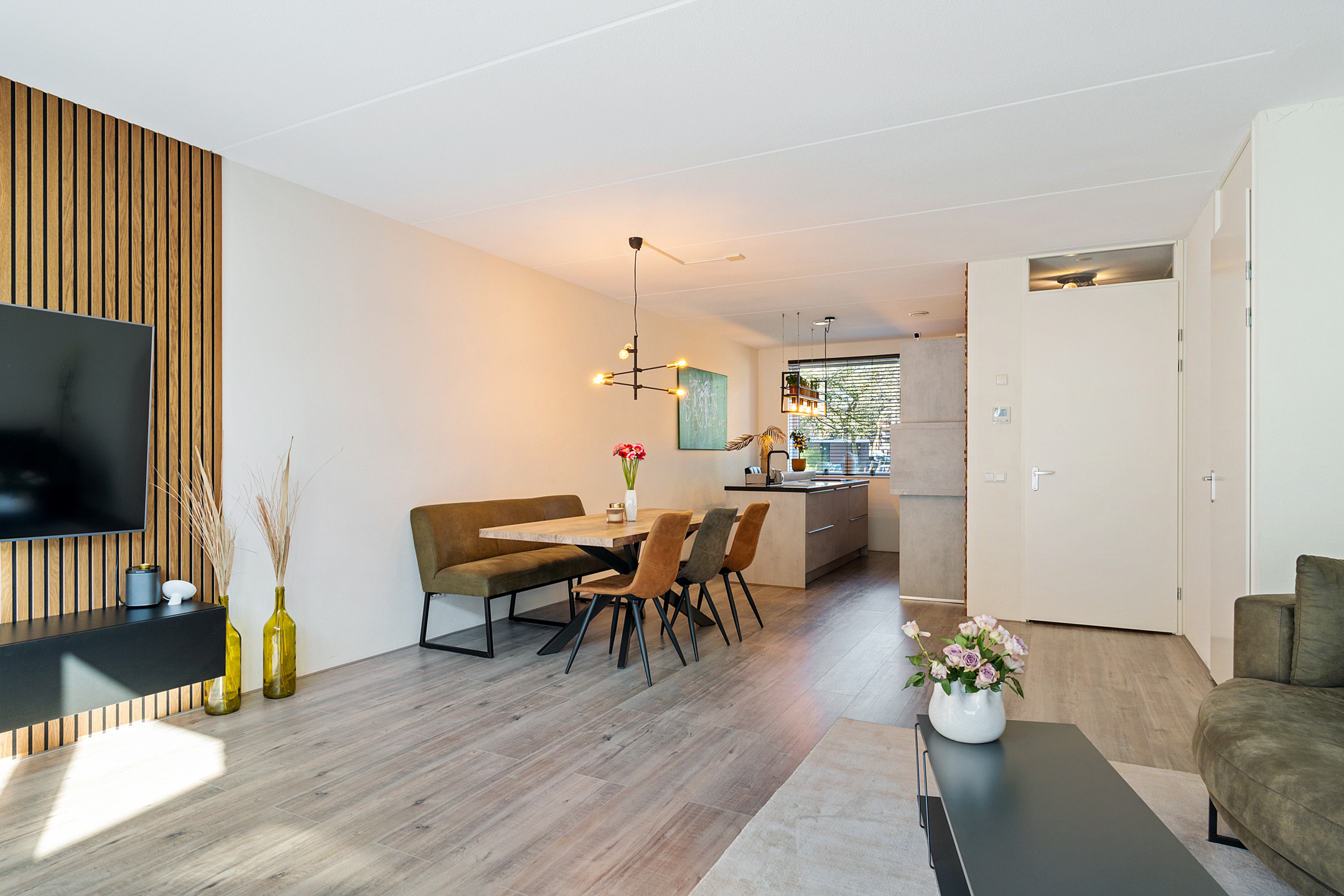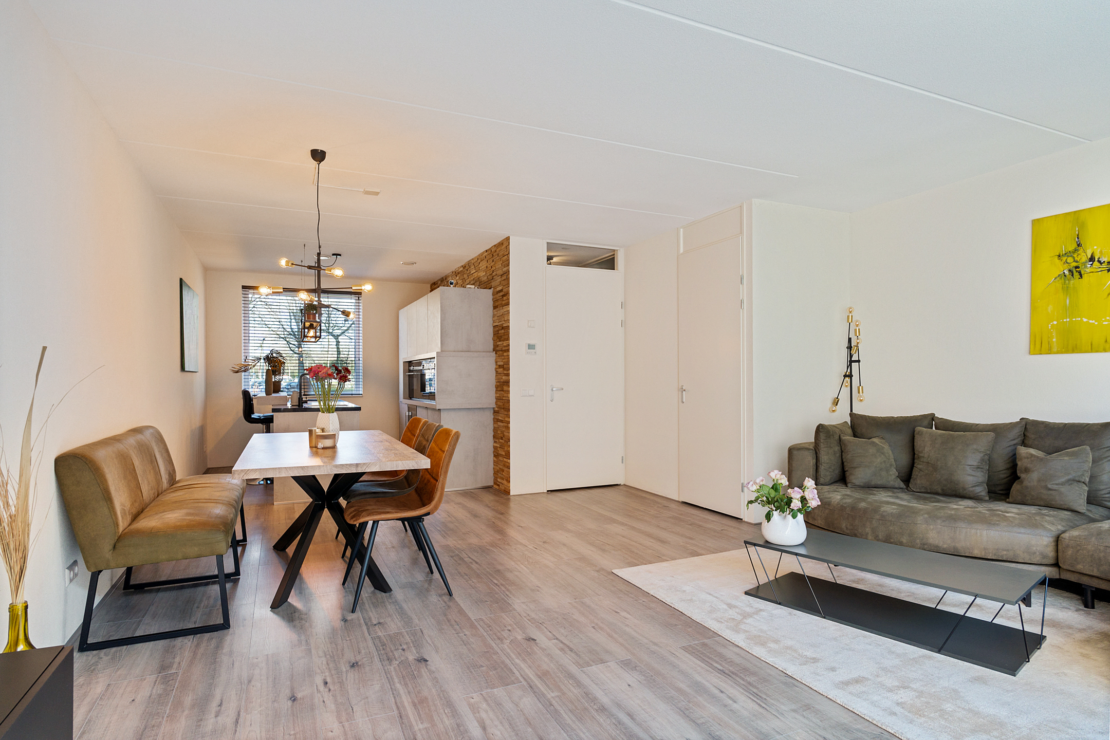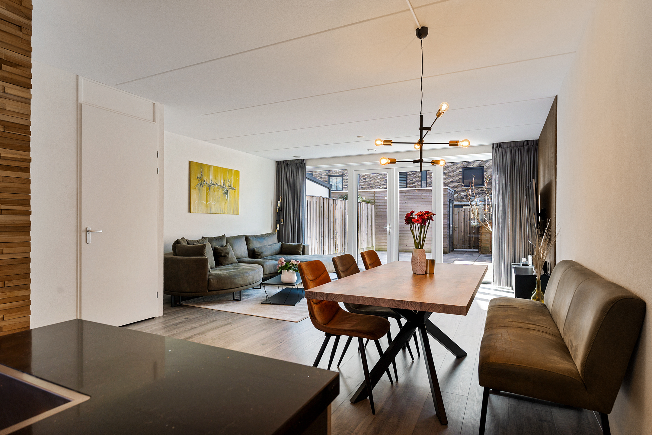 Bij binnenkomst valt direct de moderne afwerking op. De hal met meterkast en strak afgewerkt toilet is voorzien van stijlvolle zwarte accenten. De ruime, tuingerichte woonkamer is heerlijk licht door de grote raampartijen en biedt volop mogelijkheden voor een comfortabele zithoek. Vanuit de woonkamer loop je via openslaande deuren zo de zonnige achtertuin in, die pal op het zuiden ligt.