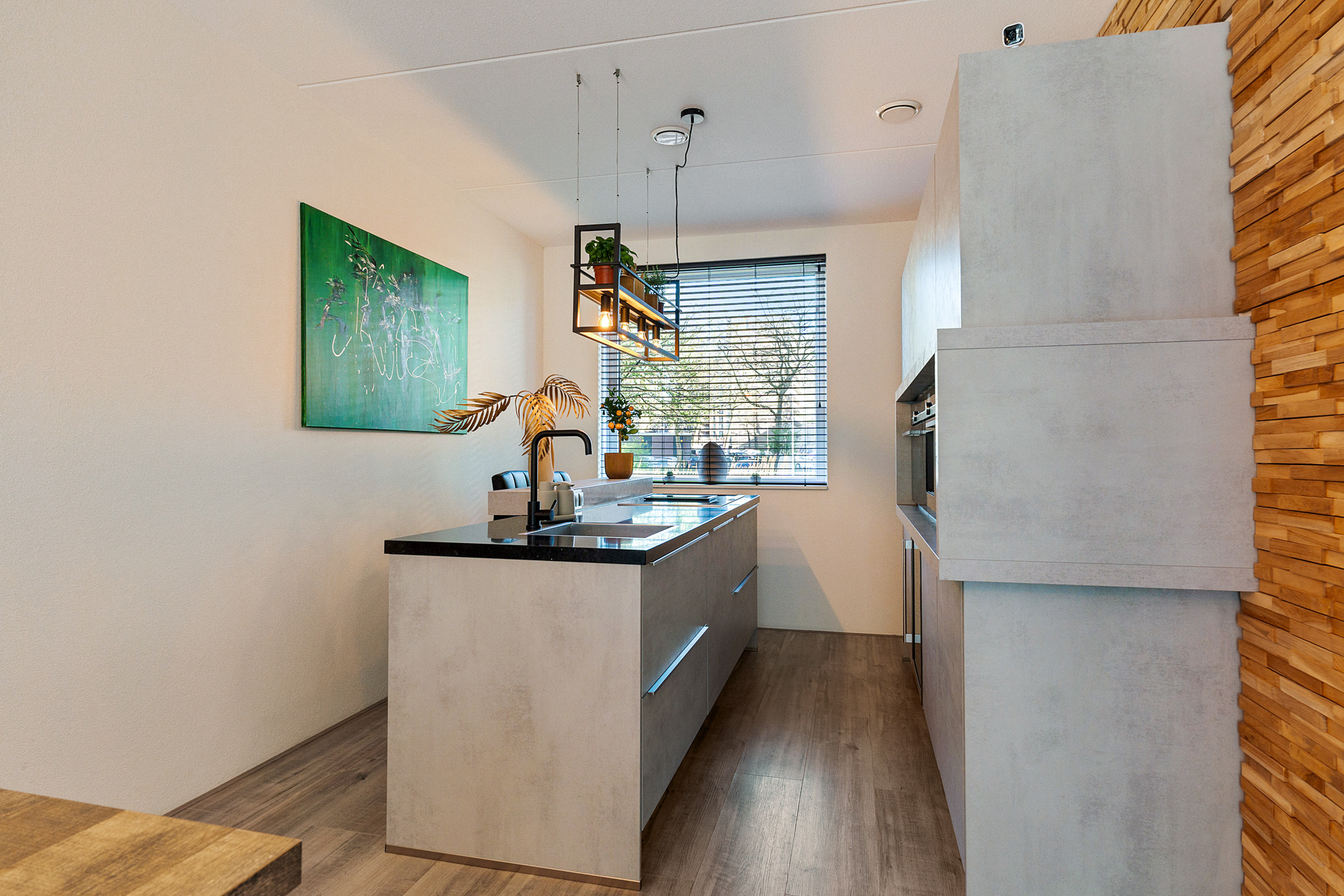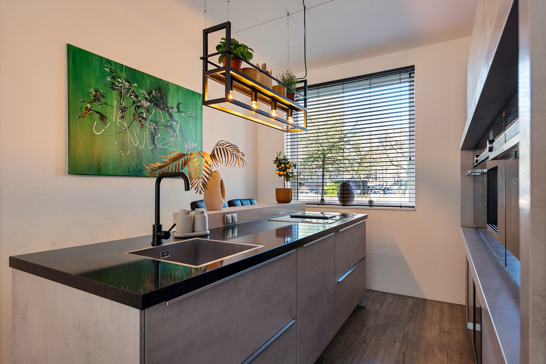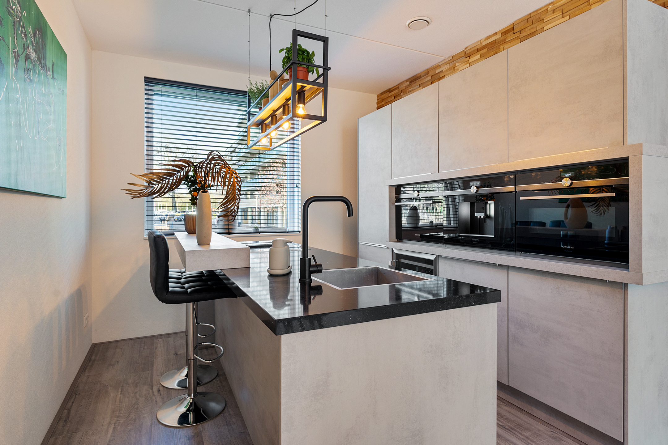 Aan de voorzijde van de woning tref je een echte blikvanger: een luxe open keuken met kookeiland, volledig uitgerust met moderne inbouwapparatuur zoals een oven, magnetron, inductiekookplaat, vaatwasser, koelkast, vriezer en een wijnklimaatkast. De robuuste uitstraling met grijze kasten, zwart werkblad en zwarte kraan past perfect bij de moderne sfeer van de woning. De gezellige eethoek bij het raam maakt het plaatje compleet.