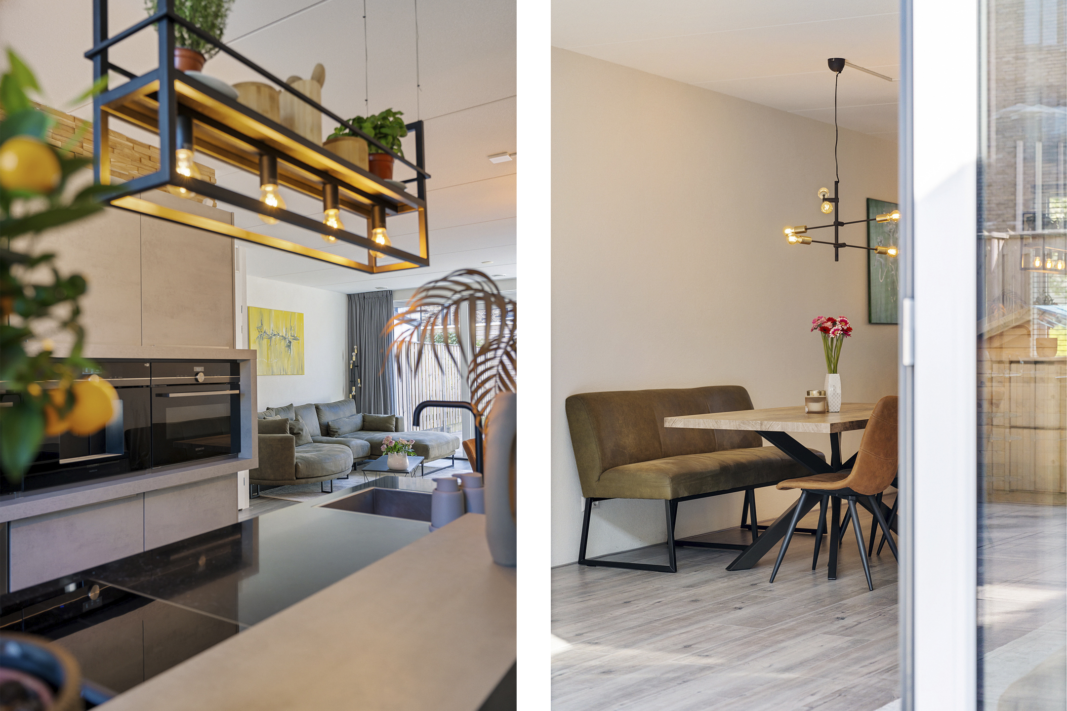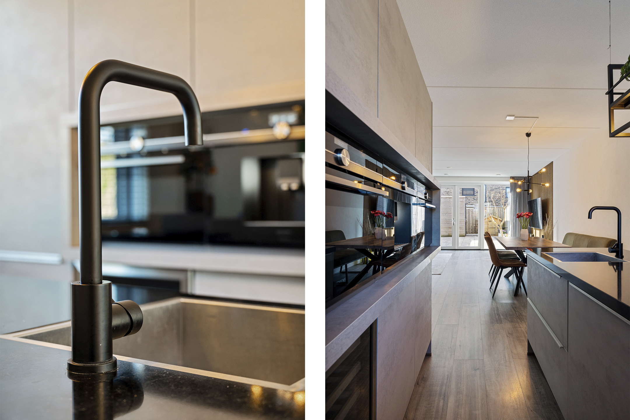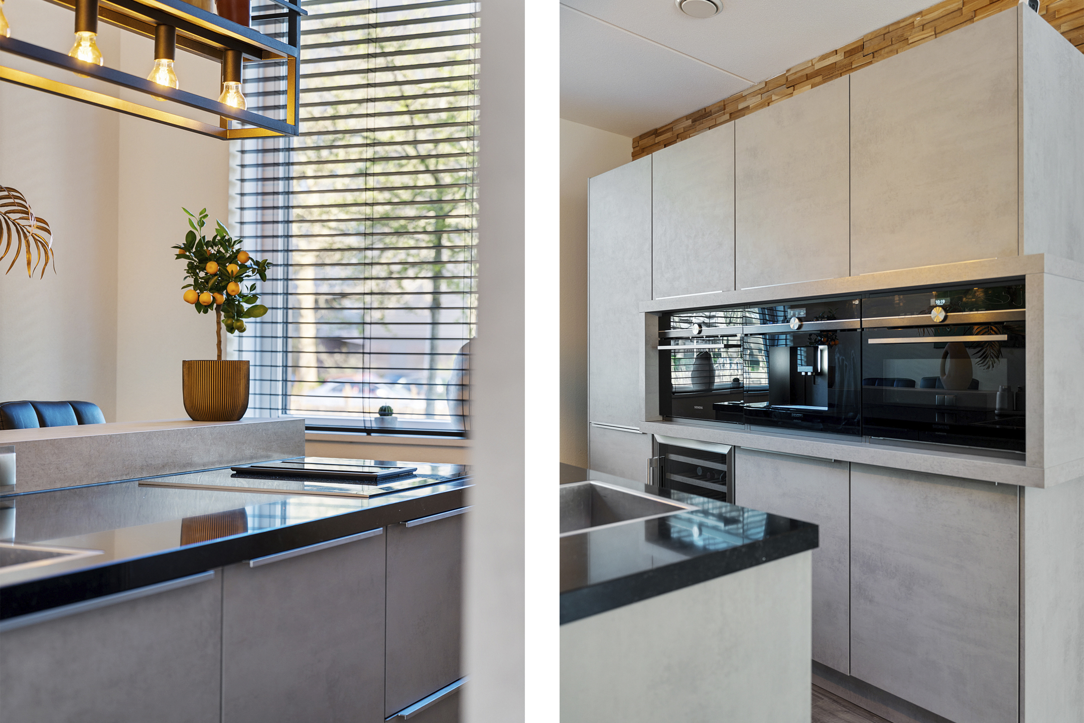 Aan de voorzijde van de woning tref je een echte blikvanger: een luxe open keuken met kookeiland, volledig uitgerust met moderne inbouwapparatuur zoals een oven, magnetron, inductiekookplaat, vaatwasser, koelkast, vriezer en een wijnklimaatkast. De robuuste uitstraling met grijze kasten, zwart werkblad en zwarte kraan past perfect bij de moderne sfeer van de woning. De gezellige eethoek bij het raam maakt het plaatje compleet.