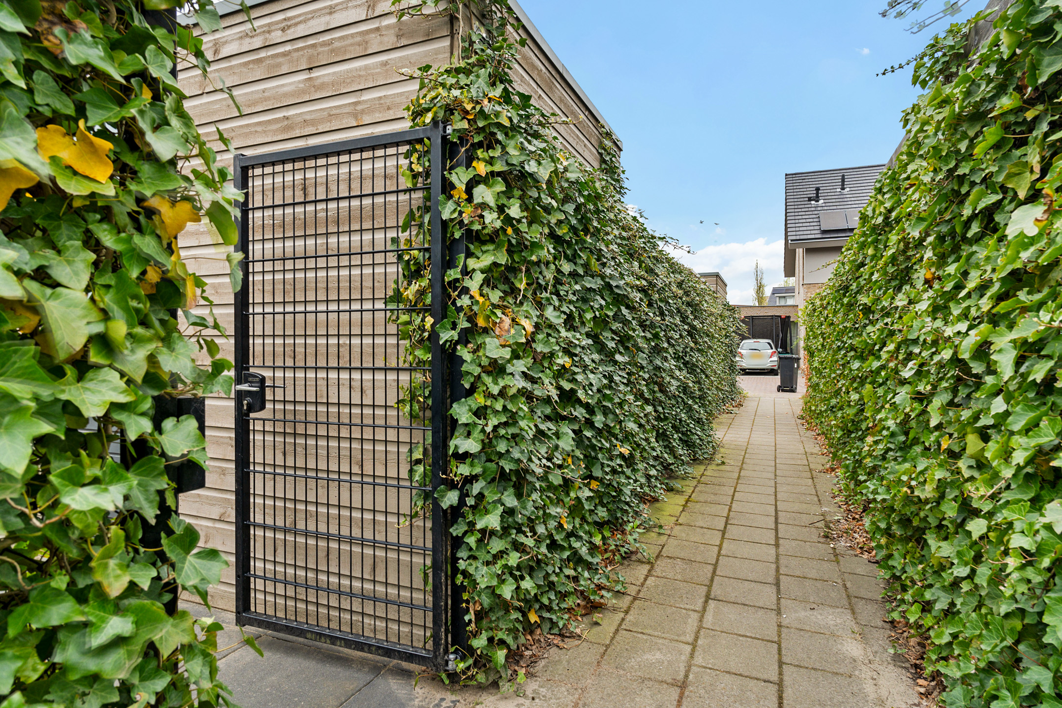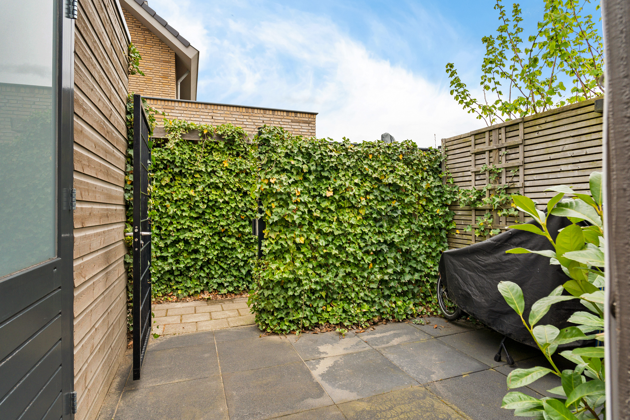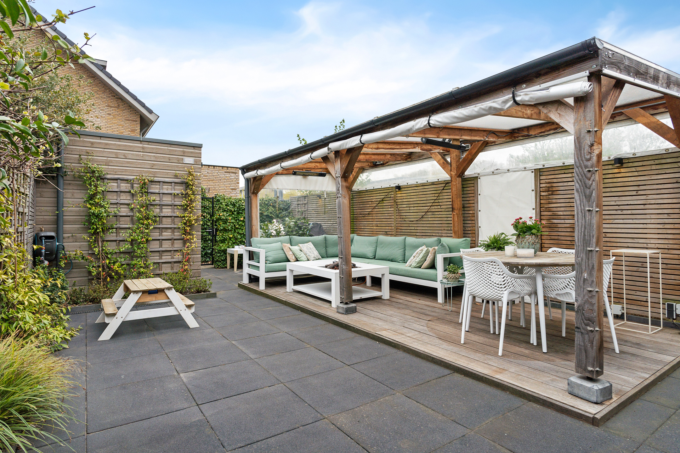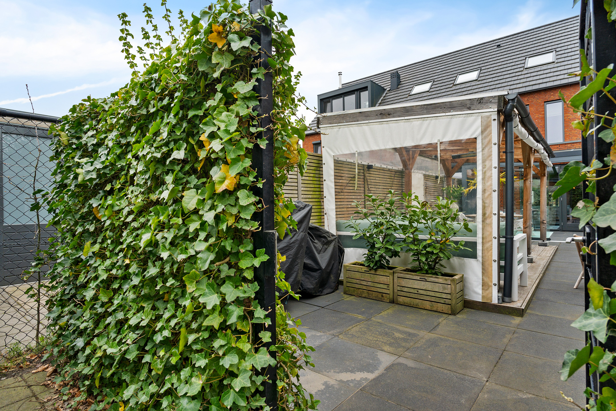 + Onderhoudsvrije, zonnige tuin met overkapping en achterom