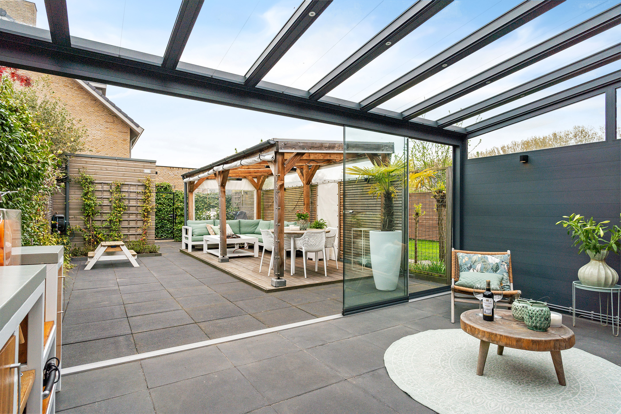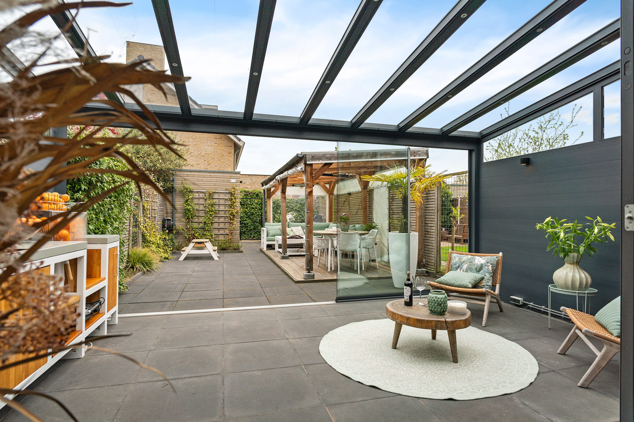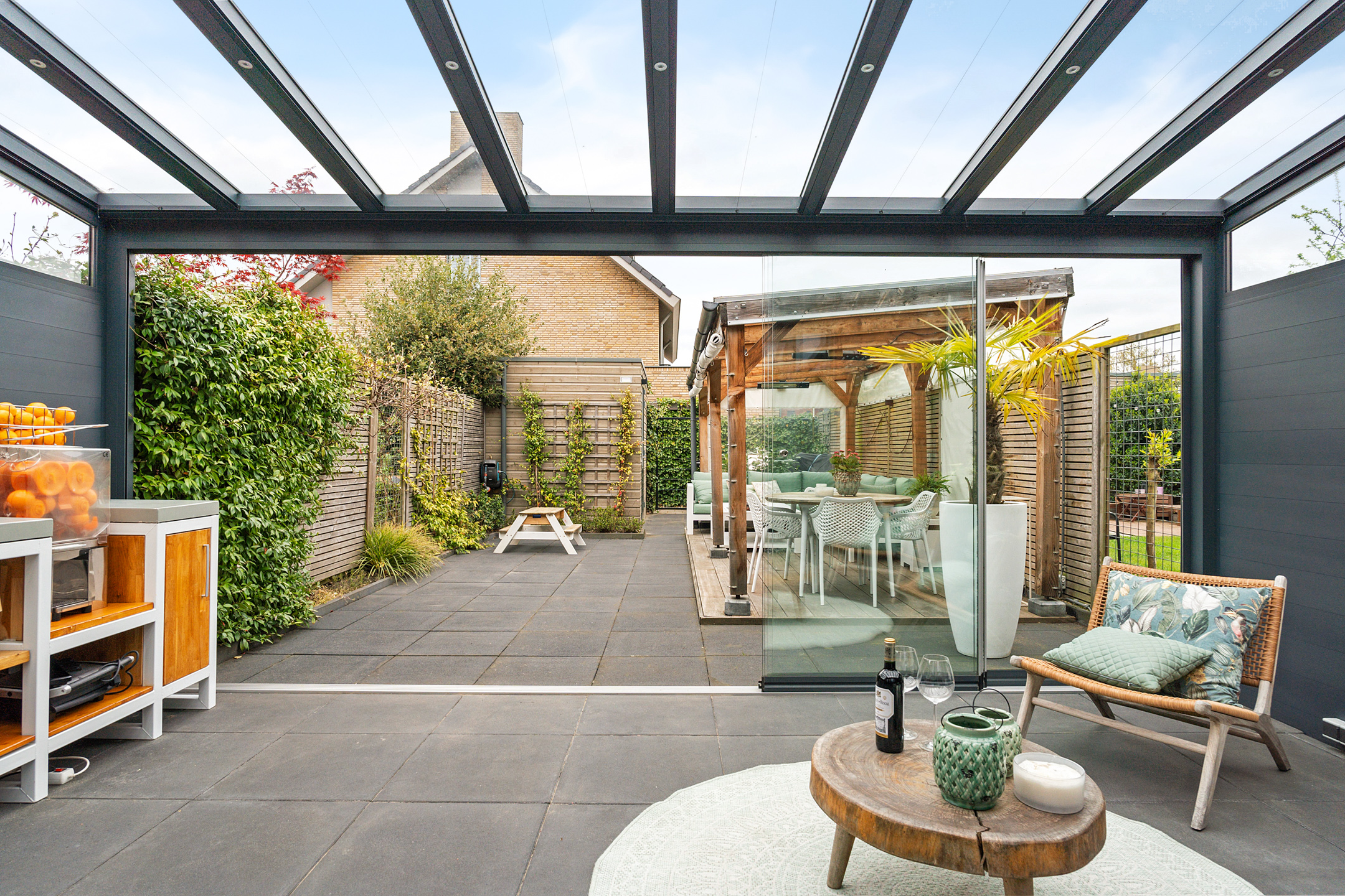 Hier is ook de aangebouwde tuinkamer te vinden, die je met openslaande glazen panelen volledig bij de tuin betrekt. De tuinkamer is uitgerust met heaters, inbouwspots, elektrapunten en zelfs een aansluiting voor een buitenkeuken – ideaal voor het hele jaar door genieten.