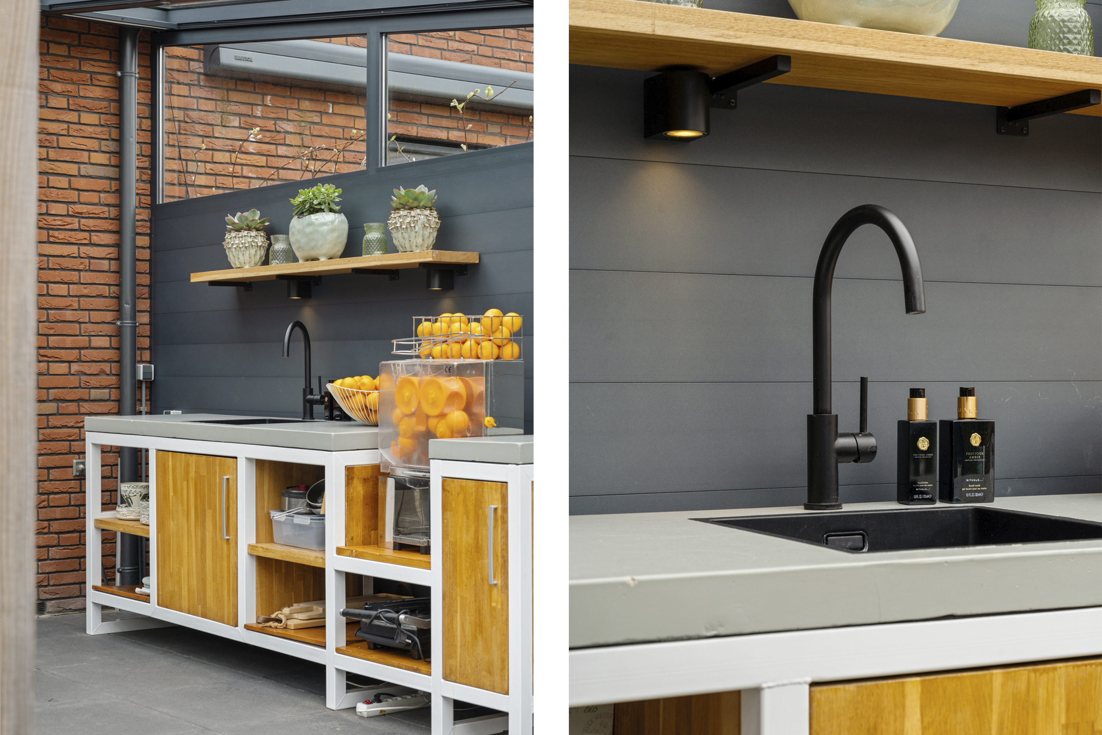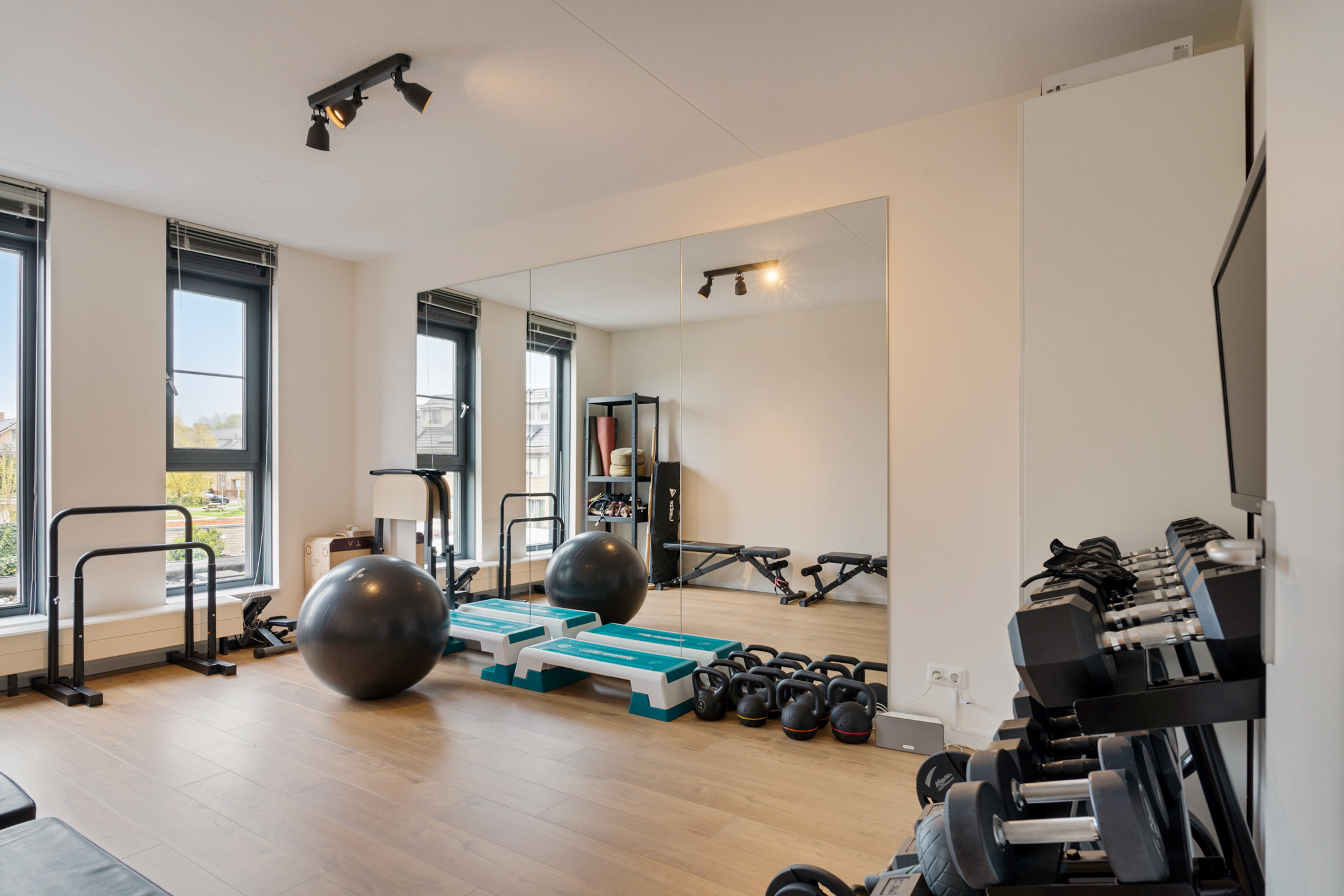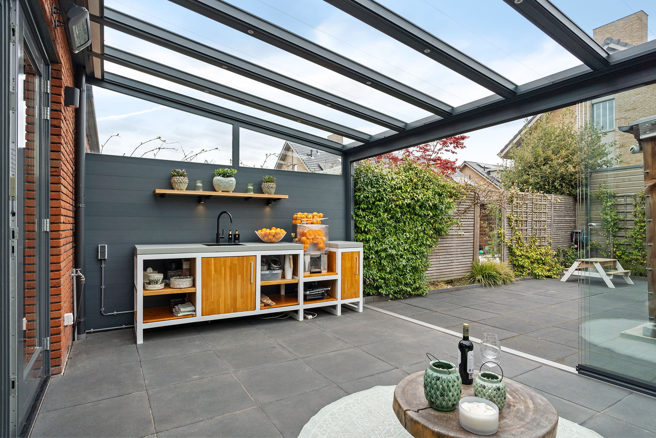 Hier is ook de aangebouwde tuinkamer te vinden, die je met openslaande glazen panelen volledig bij de tuin betrekt. De tuinkamer is uitgerust met heaters, inbouwspots, elektrapunten en zelfs een aansluiting voor een buitenkeuken – ideaal voor het hele jaar door genieten.