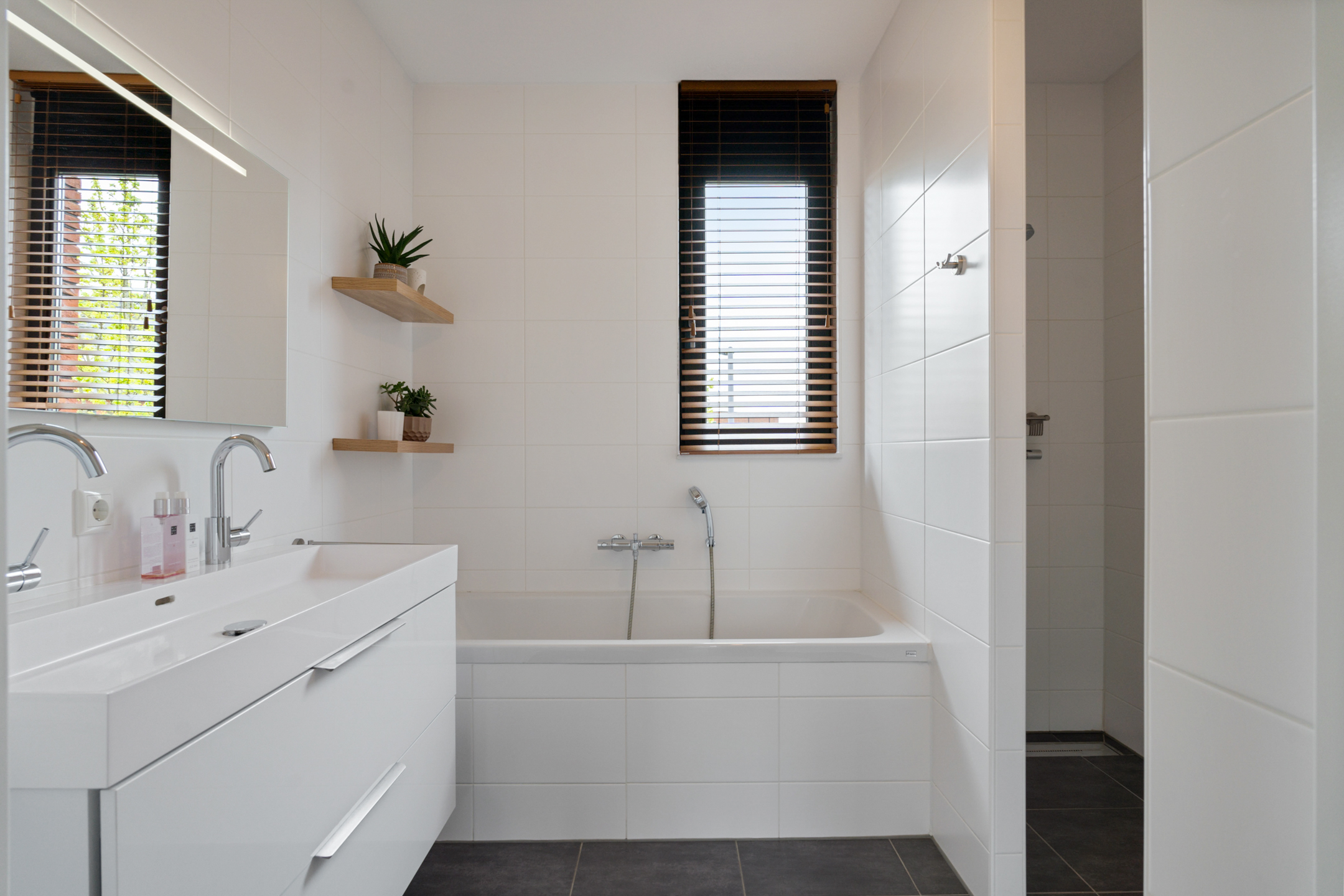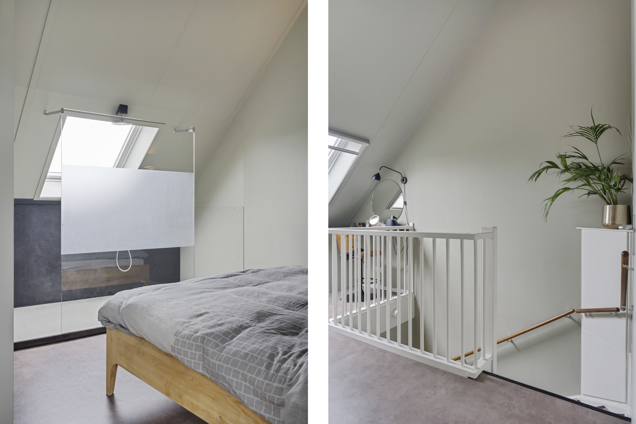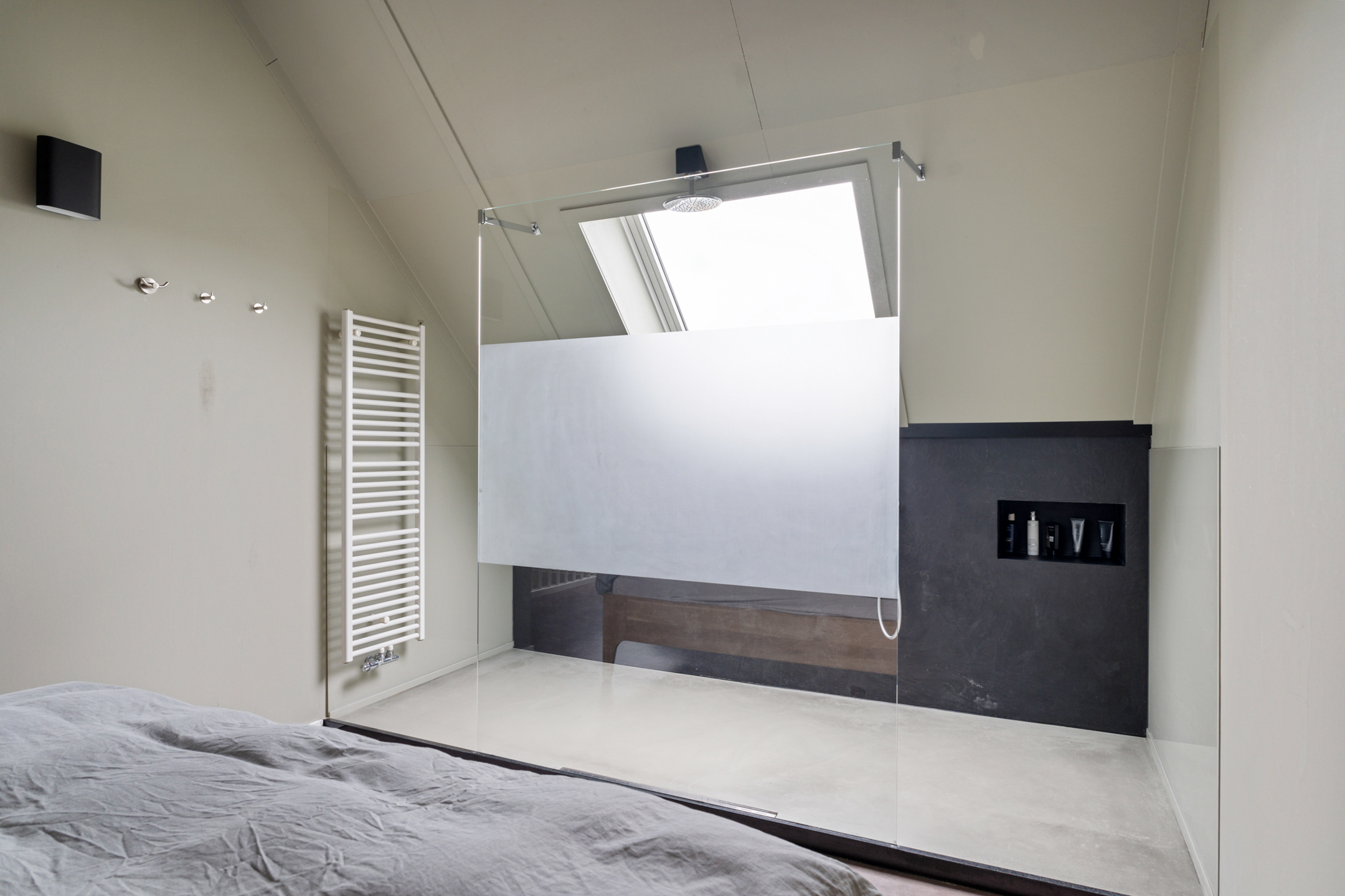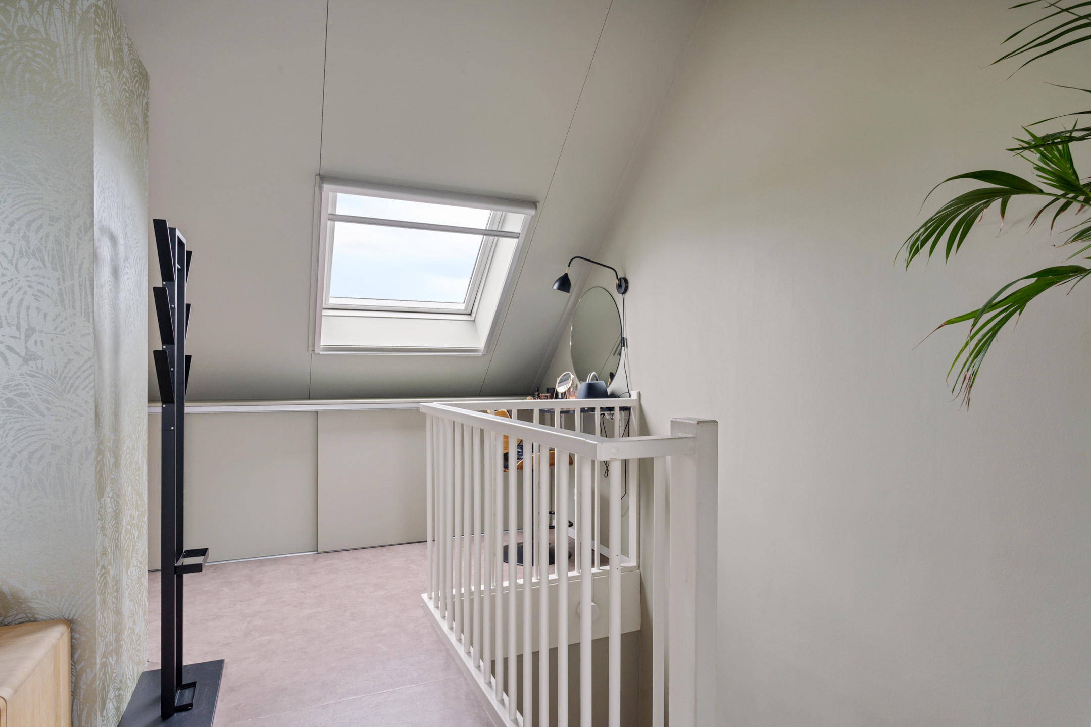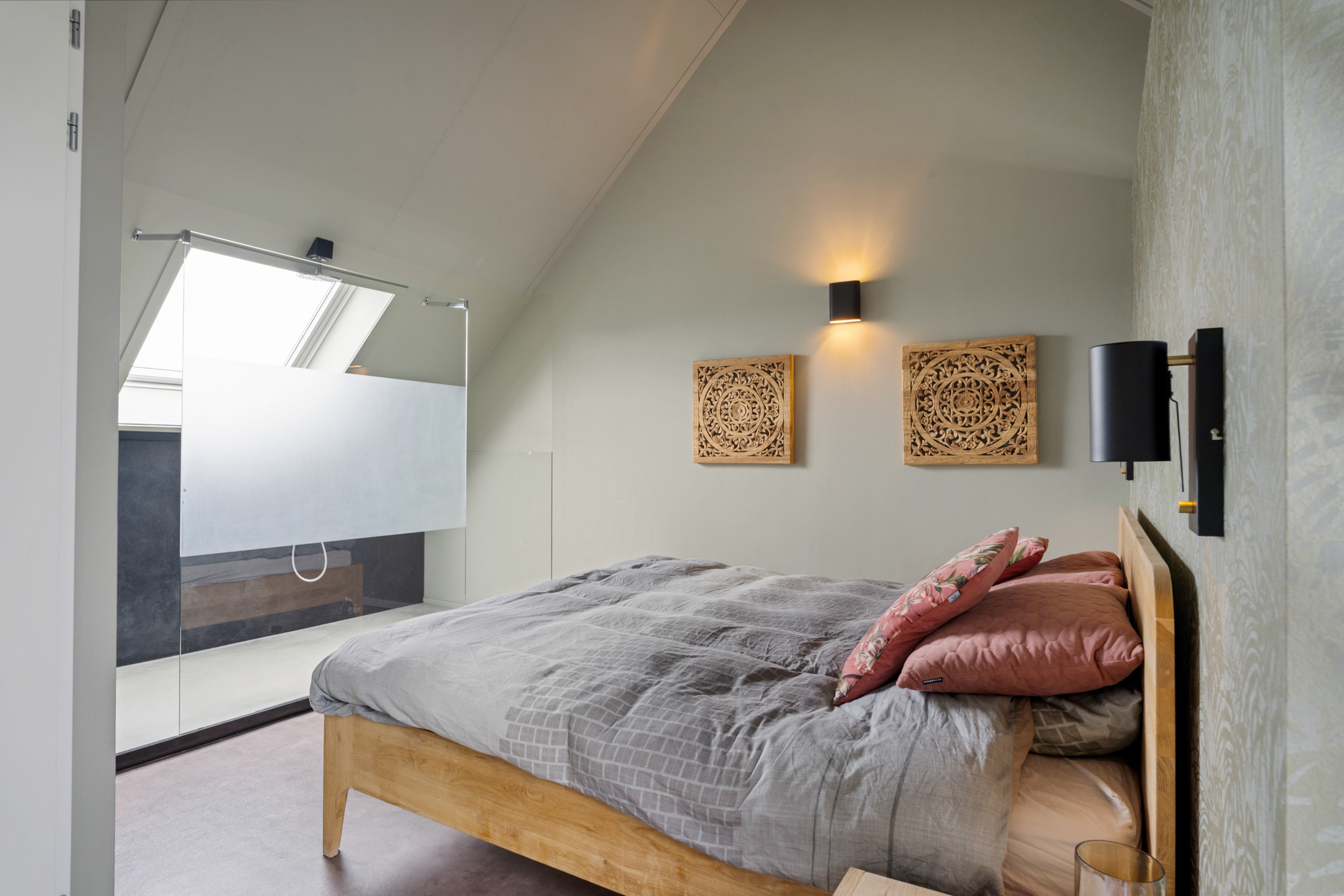 De open trap leidt naar de indrukwekkende tweede verdieping. Deze hoge ruimte is ingericht als een luxe boutique suite, compleet met een royale inloopgarderobe, een open XL regendouche met handdouche en een aparte ruimte voor de wasmachine, droger en technische installaties. Ook is er een extra wastafel aanwezig.